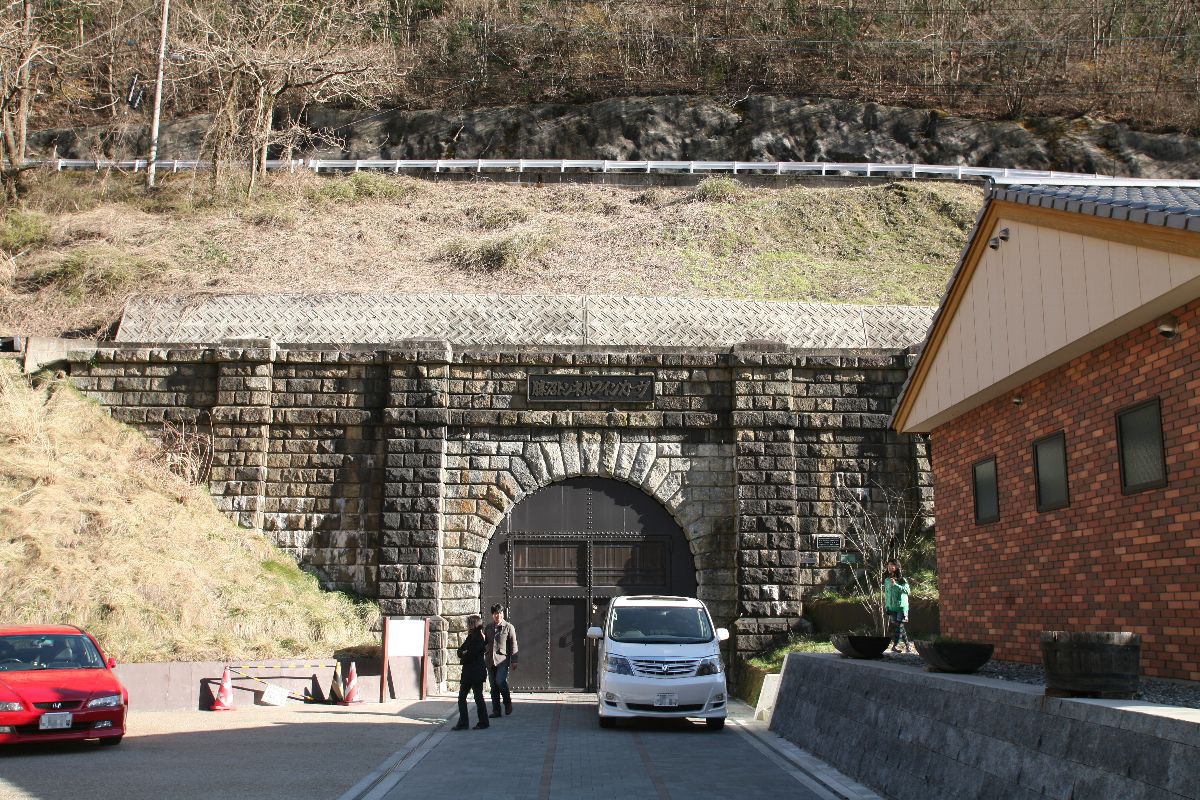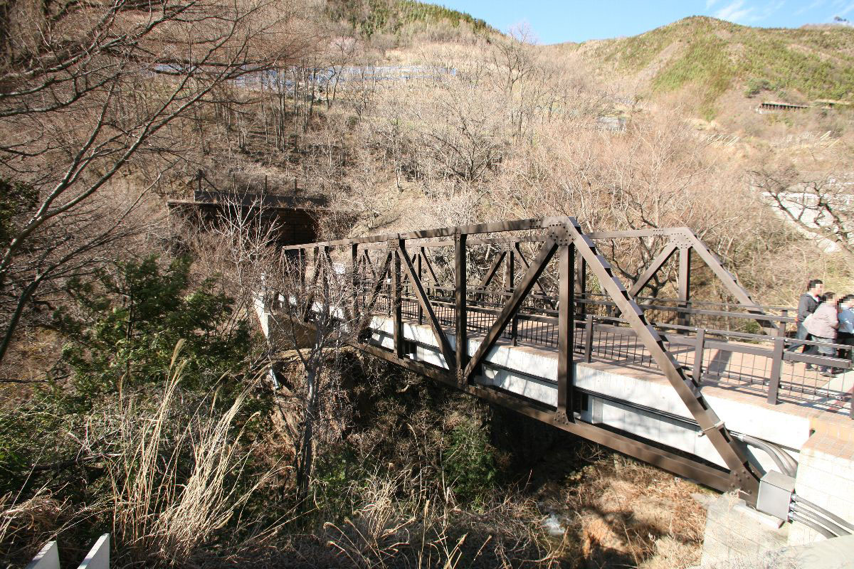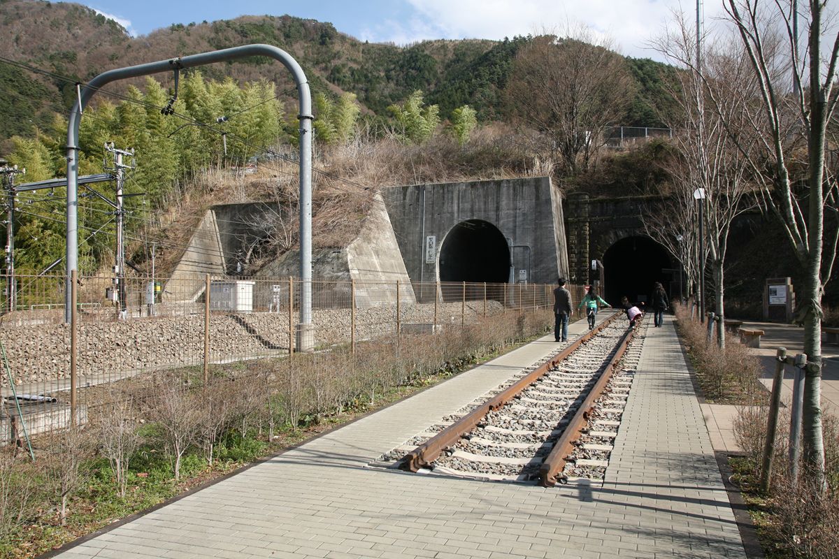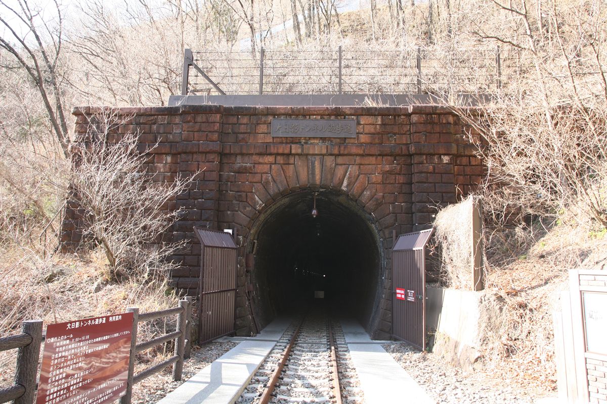 中央本線の大日影トンネルは、甲斐大和から勝沼ぶどう郷の間にあるトンネル。1997年に新しいトンネルが掘られたことにより使用停止され、いまは遊歩道として整備されている。3月に訪問した際、かなりの人手に驚いた。午後3時すぎから往復1時間以上歩いている間にすれ違った人の数は100人は超えている。かなりの人気スポットのようだ。写真の右端が遊歩道となったもっとも古い大日影トンネル(1903開通)、左端は1968年上り線として開削されたもの、中央が、右端の代替として1997年から使用されているものである。