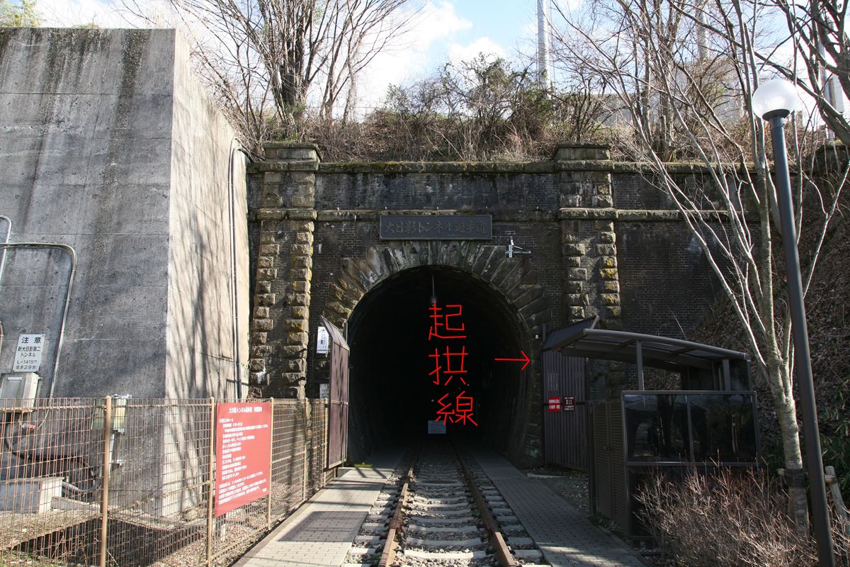 大日影トンネルでは、側壁の一部に石材が使用されているが、残念ながら起拱線は関係ない。
