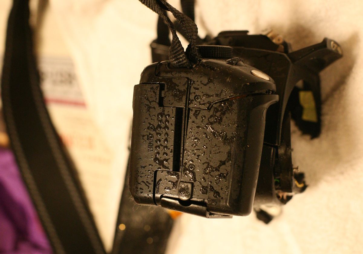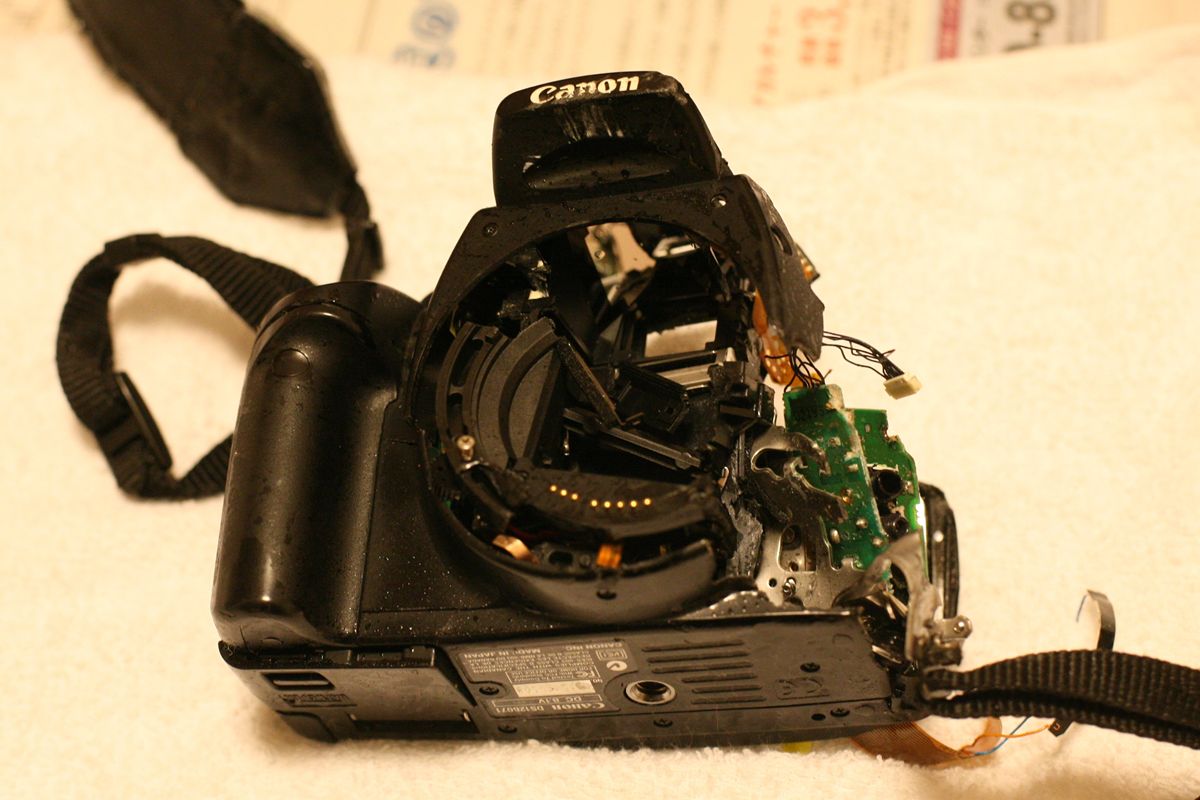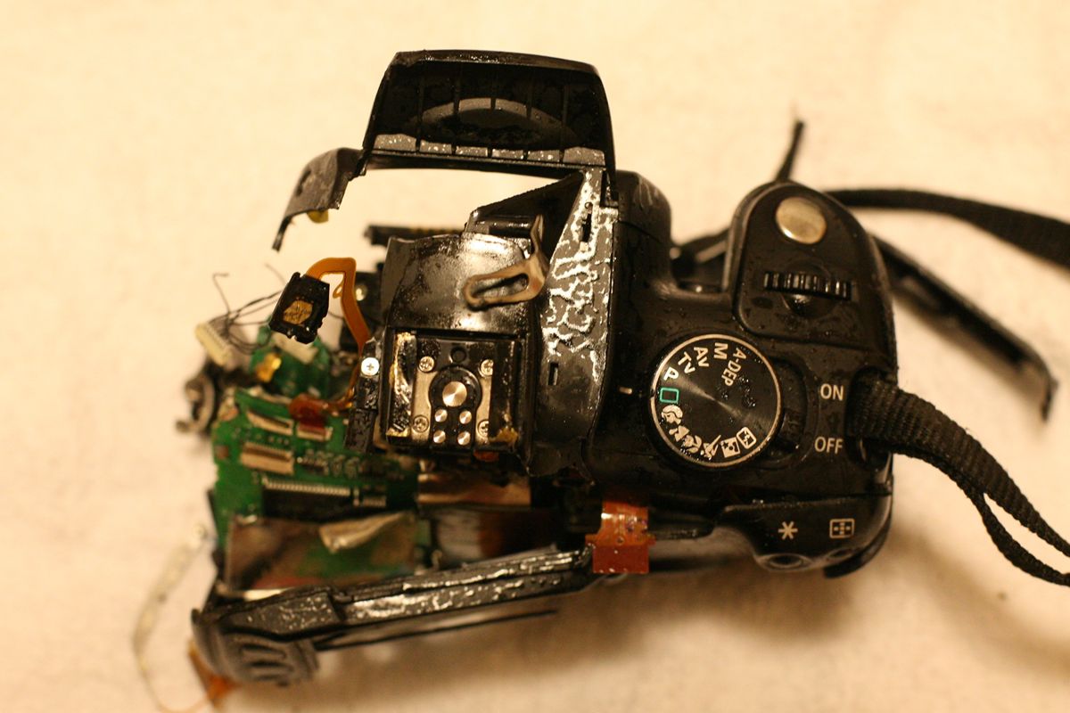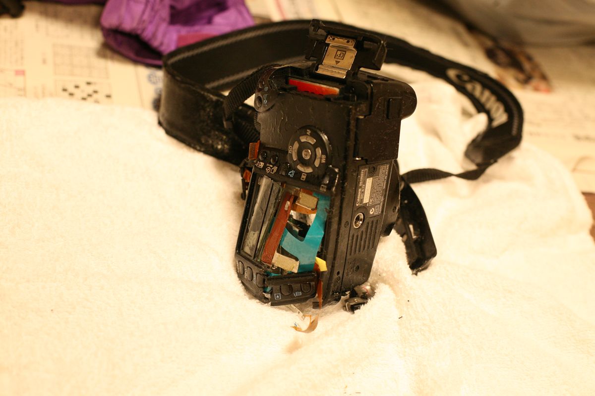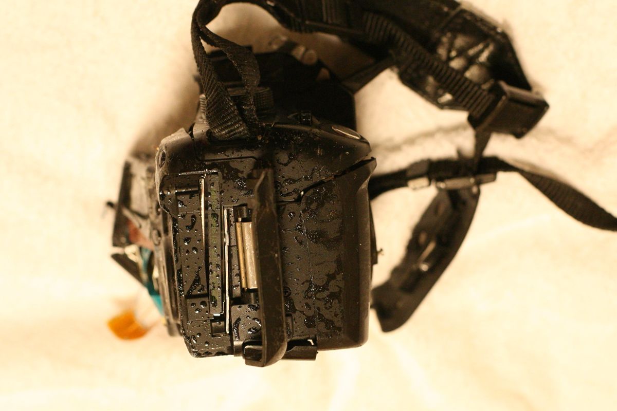 右側面、CFカード収納部分がゆがんでいる。蓋を開けるとCFカード(8Gを入れていた)は無傷のようだったが、このように歪んで入っている。