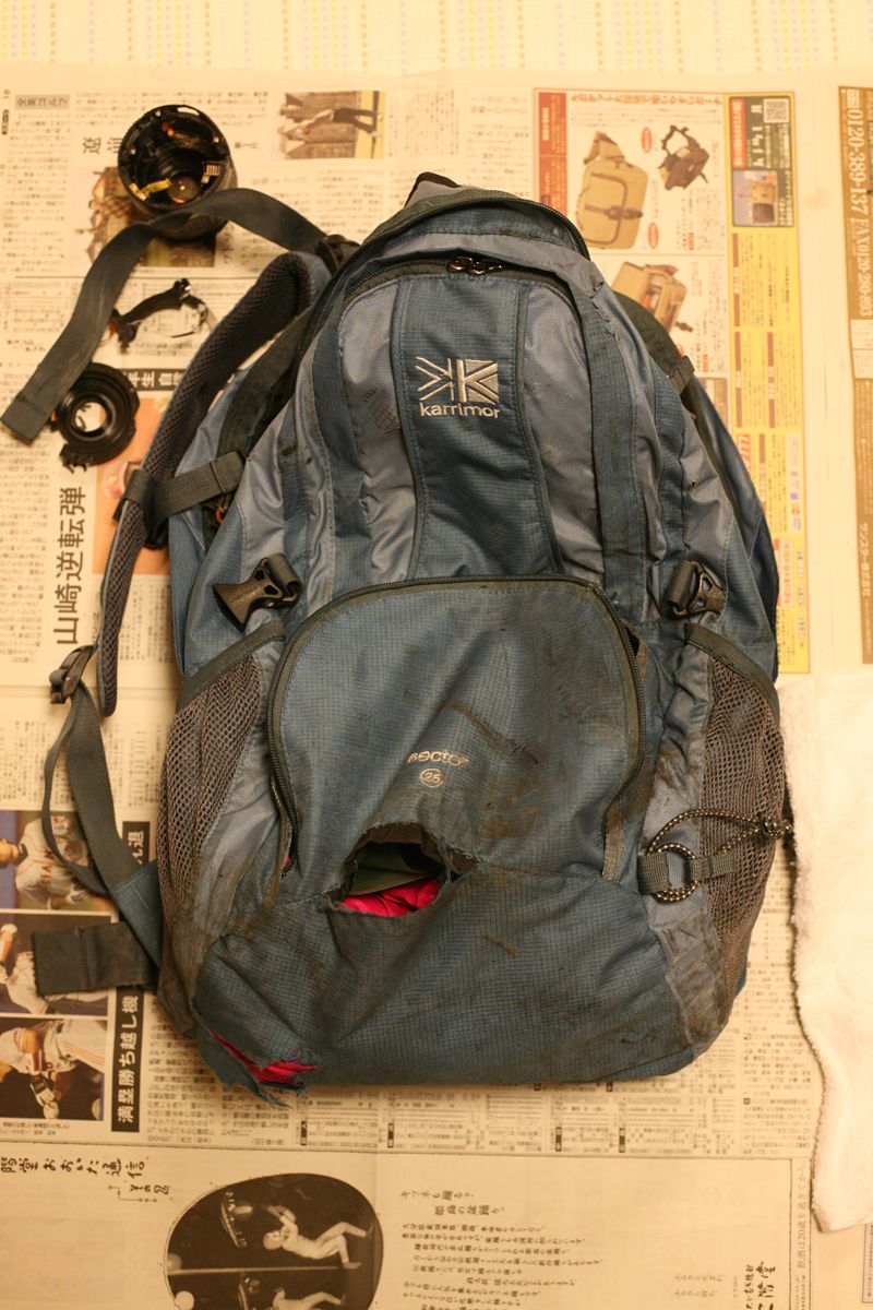 一部、縫合部が破れている。ファスナーはすべてもげていて、上気室も下気室も開放されていて、さらには上下の仕切りはファスナーこそ大丈夫だったが、背面側の縫合部は破けていて、1室になってしまっていた。中も外もウイダー風でべたべただった。無事だったのは正面のポケットだったが、その中にはなにも収めていなかった。