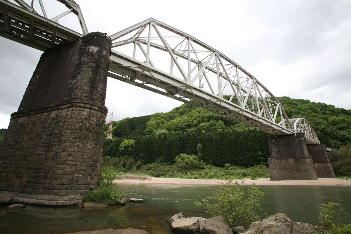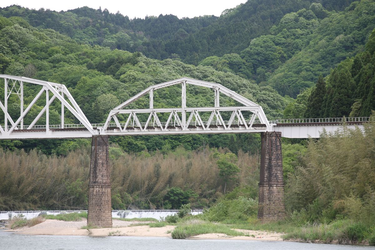 橋梁そのものは枕木も取り外してあり、向かって右の保線用通路が開放されている。向かって左側は、柵はあるのだが施錠などされておらず、ここから橋台づたいに河原に下りることができる。たいてい、こういう場所は下に下りられるように足場が切られているものだ。事実、ある場所には犬釘が2本打ち込まれ、そこに足をかけるようになっていた。