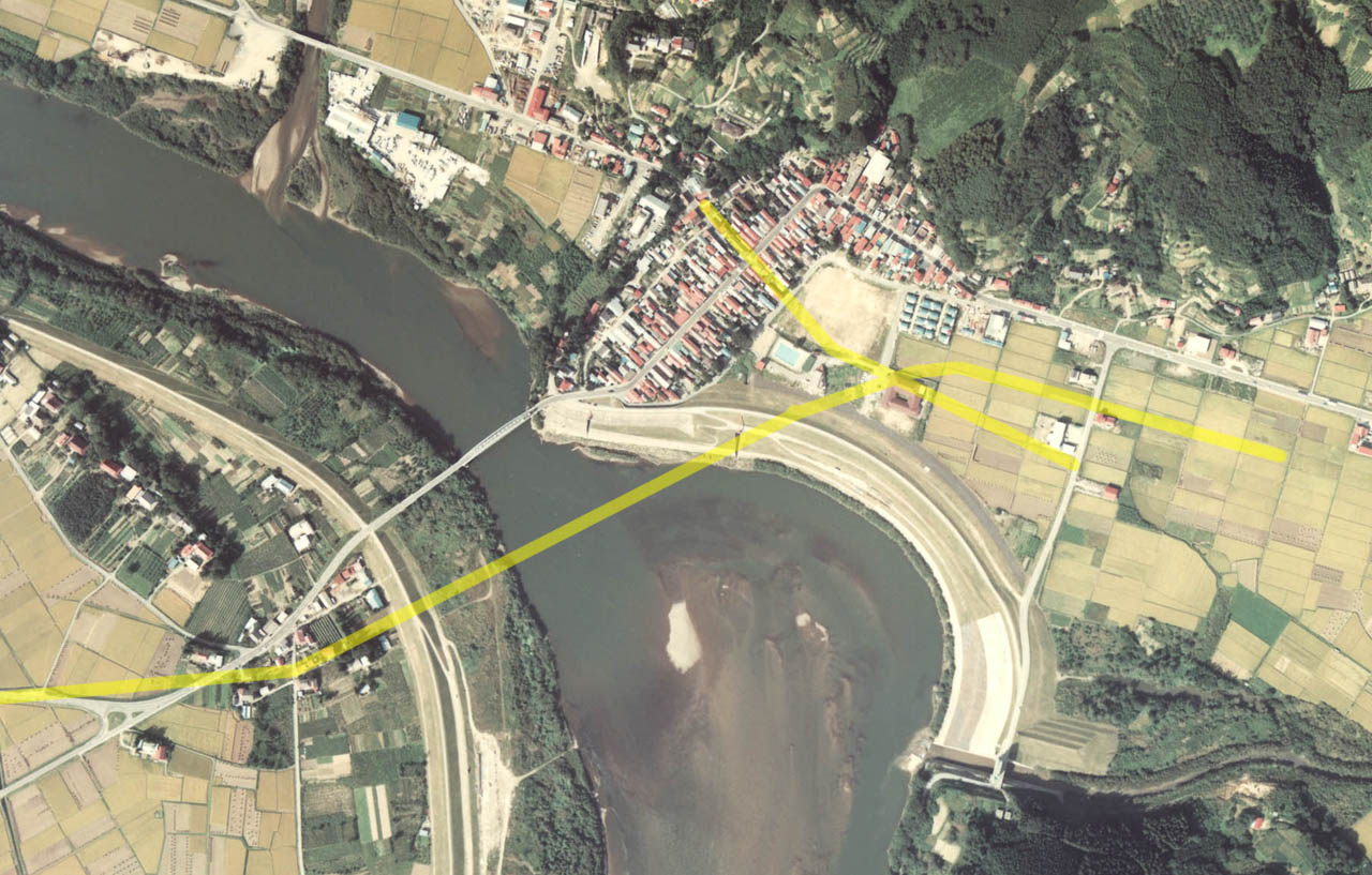 まずは下流側(地図でいうと右)に行ってみた。地図をご覧いただければわかるとおり、下流側からなら、真横から撮れると思ったのだ。