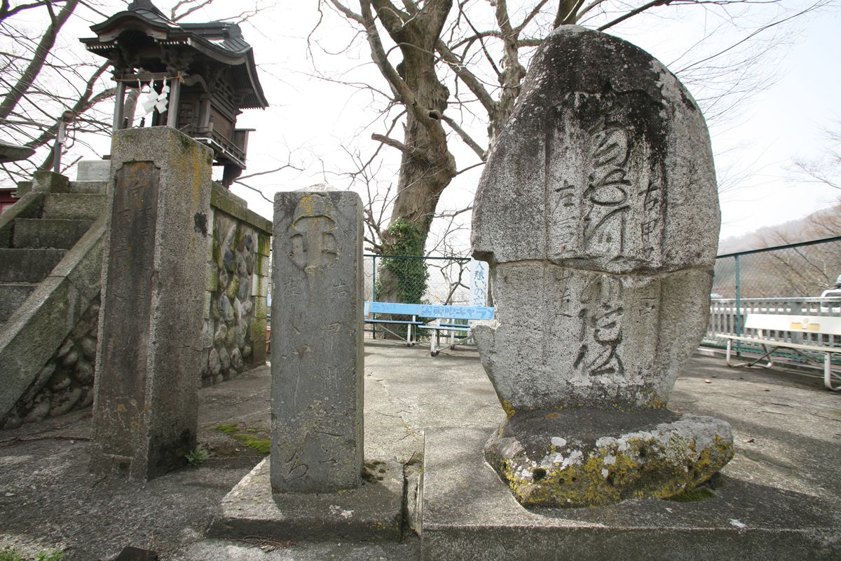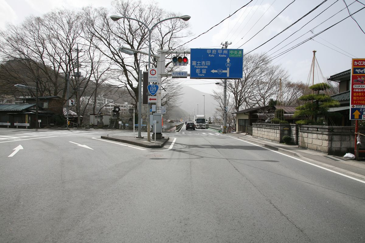「大月橋東詰」である。ここは「富士道(ふじみち)追分)とも呼ばれる場所。国道20号は甲州街道、国道139号は「富士みち」と呼ばれ、写真中央左に写っている石碑にもその名称が見える。