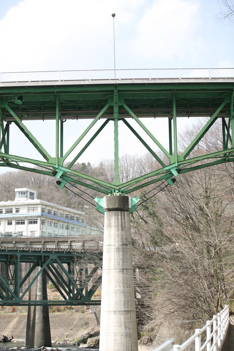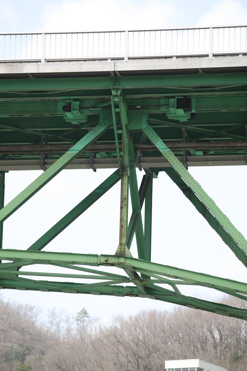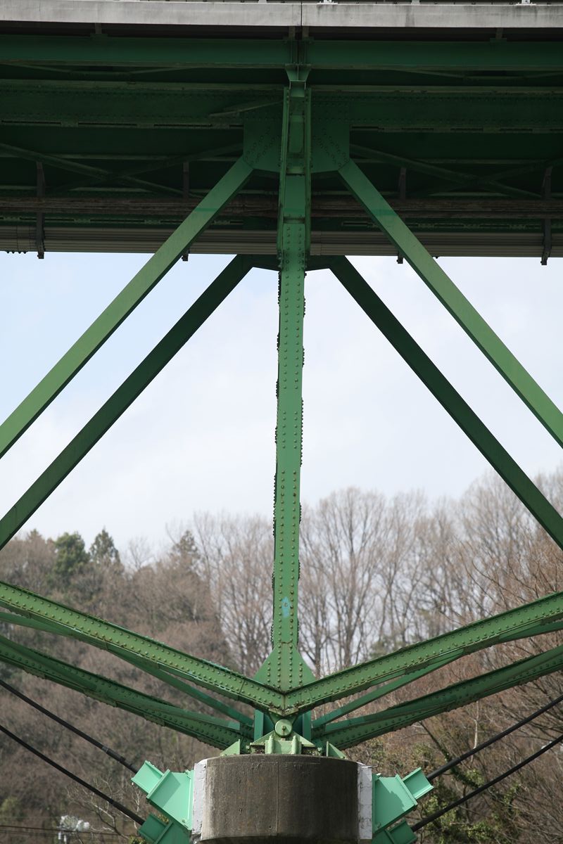 下弦材はピンに注目するが、上弦材は定着桁と吊り桁それぞれの斜材が格点にどうつながっているかを見て欲しい。定着桁が端柱的な縦桁を受け持ち、吊り桁の端部(画像では右端)はZ字形をしていて、「フ」の角の部分が格点に吊りかけてあるように見える。吊り桁の上弦材は、定着桁の端部の横梁にボルト止めされている。