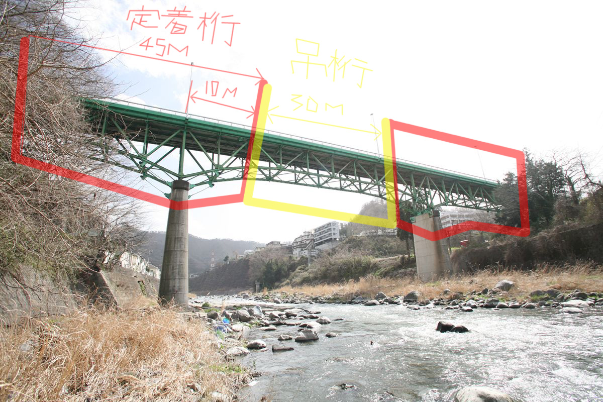 このトラスの1パネルの長さは10m。そのため、定着桁の長さは橋台から第1橋脚までの35m+張り出し部分10mの計45m、吊り桁は30m、というのが一目で分かる。トラス部分が120mと長大で、両端部に大きな木がかぶさっているため、橋はそれで完結しているようにも見える。最大支間50mのゲルバートラス部分が渡るのは桂川だといこともあり、そこに気をとられるが、35m+50m+35mの橋長120mのゲルバートラス橋部分にプラスして、西側(甲府側)に剛性鈑桁3連が計77.1m、付け足されている。今回紹介するのは、ゲルバートラス部分である。