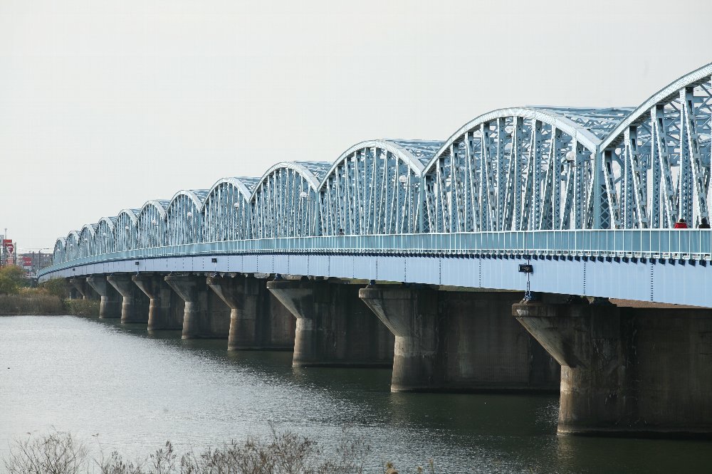 この橋は吊橋ではなく「吊弦のあるカンチレバートラス」という形式だと思われる。@Einshaltさんのご教示による。「吊橋」としたのは、現在建設中の「新鴨緑江大橋」の記事を私が誤読したものと推測。