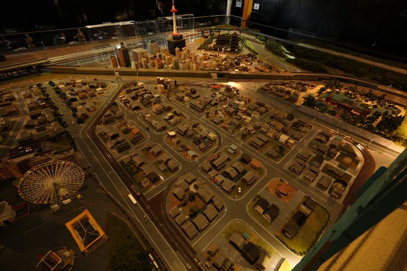 こういう本格的な架空の地図は描いたことはないが、鉄道模型の小さなジオラマを手がけようとしたことはある。着手はしたものの、初期の段階でつまづいてやめたのだ。つまづいたのは、道路や街をどう配置すればいいか…どころか、どういう地形を作ったらいいか、というアイディアが出なかったからである。例えば牧場を作ろうとする。では、牧場は、どういう場所にあるのか。地形をどう利用しているのか。牛舎はどうあるのか。柵はどうめぐらされているのか。そういったことを想像できない限り、着手することができなかった。 悪い例をひとつ。京都の嵯峨野観光鉄道のトロッコ嵯峨駅にある「ジオラマ京都ジャパン」のジオラマを見てみよう。 ここには町並みをまったく感じない。ただ適当に建物の模型を置いただけ。駅前に唐突に住宅がある。遊園地がある。団地がある。そこから100mも離れずに茅葺き屋根の家が、多の建物に挾間さてある。木造長屋や倉庫がある。こんな町並みなどあってたまるか! 1980年代前半の、確かNゲージPLAYMODELだったと思うが、そこに発表されたジオラマに夏の神社があった。鉄道は出てこないジオラマだが、そこにはストーリーがあった。神社のいわれもあった。そこでの祭りがどういうもので、それを支えている町の人はどういう人で…という設定があった。ジオラマは、そうであってこそ、リアリティが出る。空想地図と同じだ。 『模型鉄道地鉄電車』(宮下洋一著/ネコパブリッシング)という素晴らしい本がある。この本に掲載されているジオラマが素晴らしいのは、ごく小さなスペースでも、それがあまりにリアルだからだ。眺めていると「そうだ、線路脇ってこんなだ」「家の横ってこうなってるよね」という発見の驚きばかりだ。もっとも、そうしたことは、昔から繰り返し雑誌で訴えられてきたことではある。 * * *