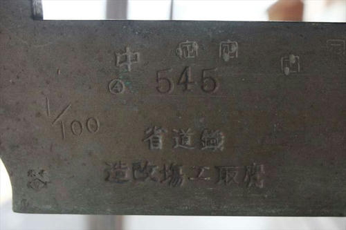 隼駅にもあった。 注目したいのは秤を置く台。木材に、車輪がはまる穴がざぐられている。こういう位置留め、秤に限らず昔はよく見かけた気がする。 これで、因幡船岡駅、若桜駅、隼駅と3駅の秤を見たが、どれもメーカーが異なる。因幡船岡と隼は1930年1月20日に同時に開業、若桜はその年末、12月1日に開業。隼と若桜の秤が後年、時期を異にして更新されたということだろうか。 因幡船岡駅 定量増錘附 注意 使用ノ際 ハ必ズ● ●目ヲ調 整スベシ その下の「D-3-1555」は後年の管理番号だろうか。 荷物の重さは、荷物を秤に乗せ、目盛りのまたがっている分銅を動かし、釣り合った位置の目盛りを読み取る…だったと思うが、最下段の写真がなんだかわからない。 この秤の使い方について、TcodeF様に教えていただきました。(9月1日追記) ●旧きものを訪ねる旅路(別館)-天秤式の秤 目盛りに「鉄道省 鷹取工場改造」とある。「正」「定」は校正時の刻印だろうが、いつのものかわからなくていいのだろうか。「正」にウ冠(?)がつき、2箇所その上からポンチしてある。「中」は不明。(佐藤信之様よりご指摘あったので同日に追記) この秤、博物館モノだと思うのだが、こんな扱いであるため、自由に見られるのもまたありがたい。 歴史的鋼橋集覧によれば、当初は第1連~第3連のみで、後年、おそらく高水敷の拡幅とともに第4連・5連が追加された。第1連~第3連は新しいので、当初の桁を取り替えているのだと思う。
