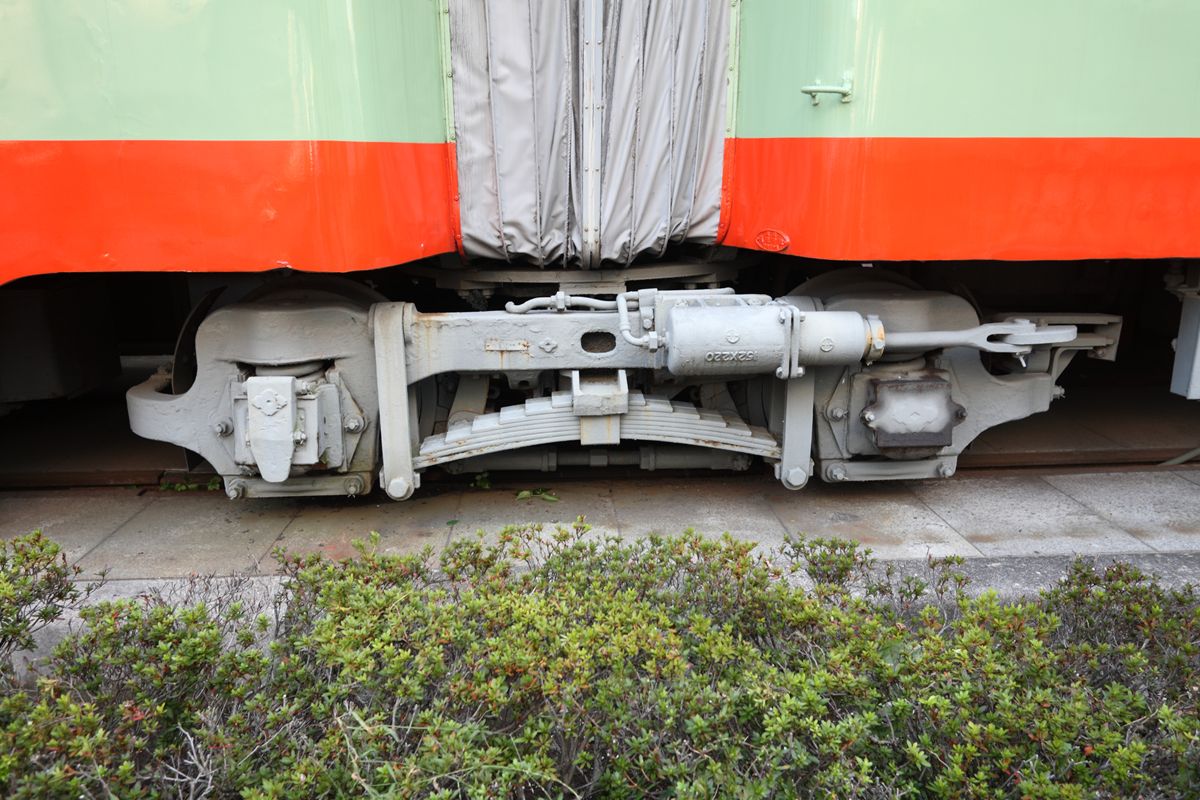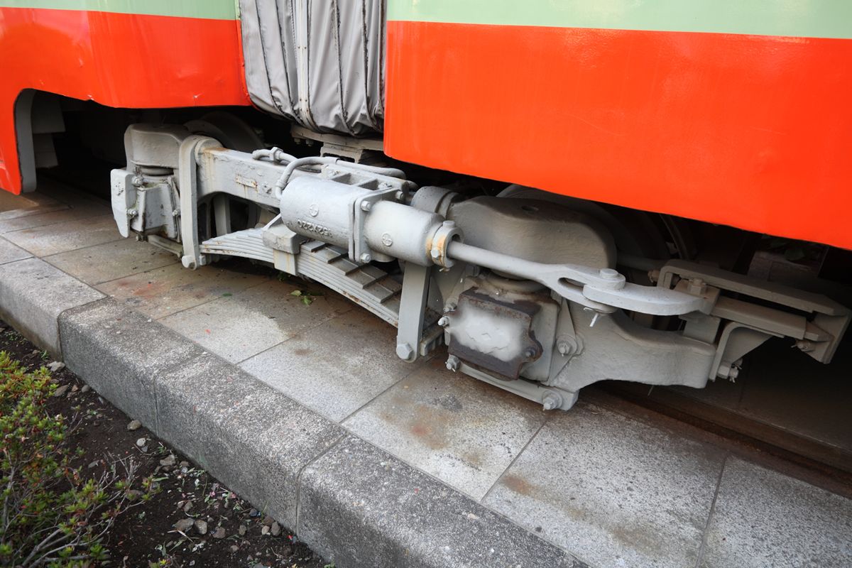 平面の地図上ではあまりパッとしない交差点だが、こういう角度で見ると、赤羽橋交差点は重要な結節点というように見えてくる。こんな五叉路を効率よく裁く信号をセッとしている人はすごい。 東京タワーからの写真をもう一点。 それはそれとして、首都高とビルの近接具合は、Nゲージのジオラマでもここまで近くに建物は配置しないよというくらいに近い。これが現実の都市。事実は、ジオラマ上で再現された空想の世界よりも、ずっと空想的なこともある。こういうところで、空間を自在に飛び回って写真が撮れたら面白いだろうなあ。 ※追記 友人から「ここに写っているビルの下に、かつて住んでいた家が沈んだ」というメッセージをもらいました。故郷の喪失ということは、ダムに沈むとか高速道路の建設による立ち退きなどが真っ先に思い浮かびますが、都心のこういう場所にも、というか都心だからこそ数多くのそうした事態が起こっていることを思い知らされました。実家がそういうことになっていない私は幸せなんだろうな。ドーナツ化現象で老人ばかりになり、私がいたころは各学年3クラスあった小学校が統廃合の危機にあるけれども。 PR この車両は1954年製。同系の台車を履いた車両はいまも各地に残っている。両端が電動台車で連接部は付随台車だが、基本は同じ。連接部のほうが写真が撮りやすいので、こちらで書く。 目的は、省スペース化と軽量化だろうか? 2両分の車端部の荷重は、板バネを束ねている部分にかかる。それを台車枠から吊ったリンクが受けて荷重を台車に伝え、されに軸バネ(コイルバネ)を介してレールに伝えている。鉄道車両の台車によくあるように、2組の板バネを上下ペアにして使うよりも天地方向のスペースをとらず、を使っているものだ。