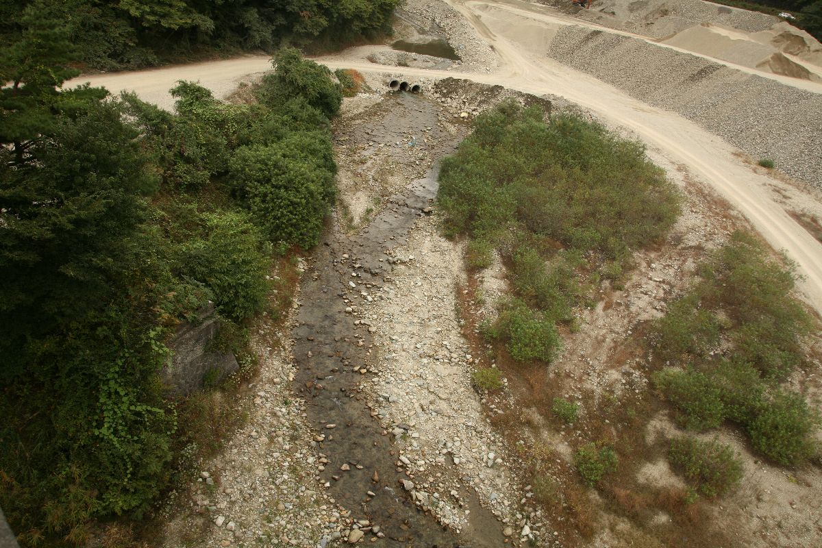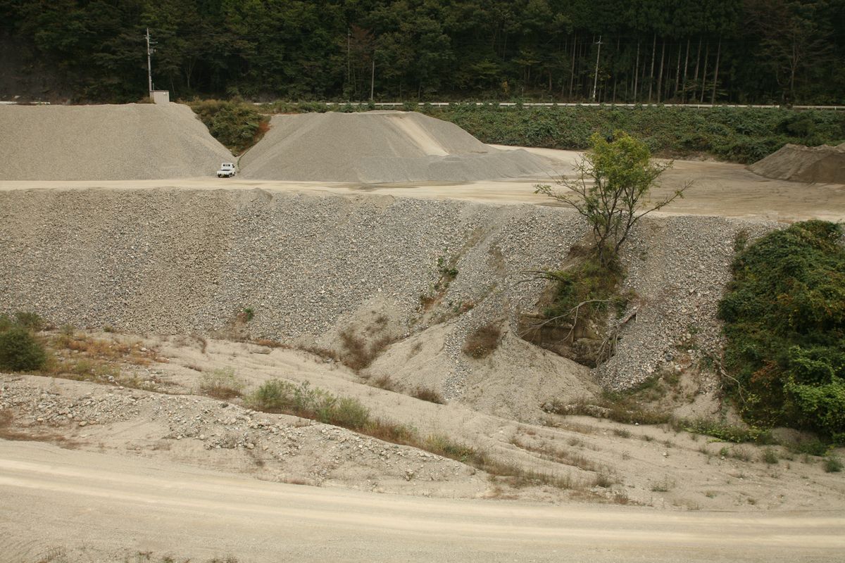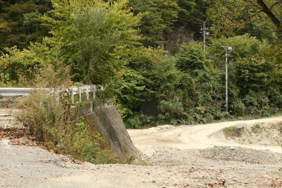 そして、北側へ。 …しかし、この写真を見ると、この旧橋はまるで必要がなかったかのように、こちらから対岸に渡る道路がある。そもそも川がない…? この写真の中央から少し左下に、橋台が見える。これが旧旧橋の跡。 砂利取りのダンプが出入りしていることもあり、なかなか思うような位置に立ち入ることができないが、なかなかのダイナミックな景観である。国道121号は、国道229号と並んで「相当に開通時と形が違う道」なのではないかと思う。 |