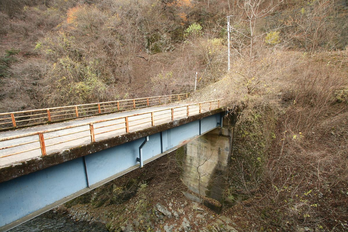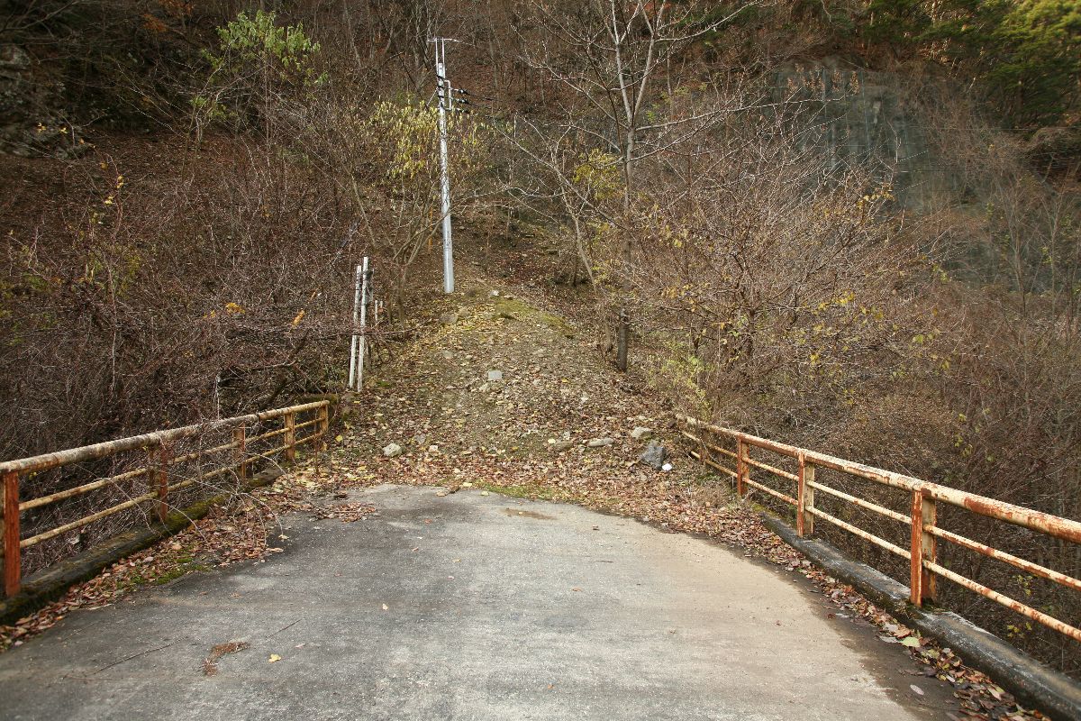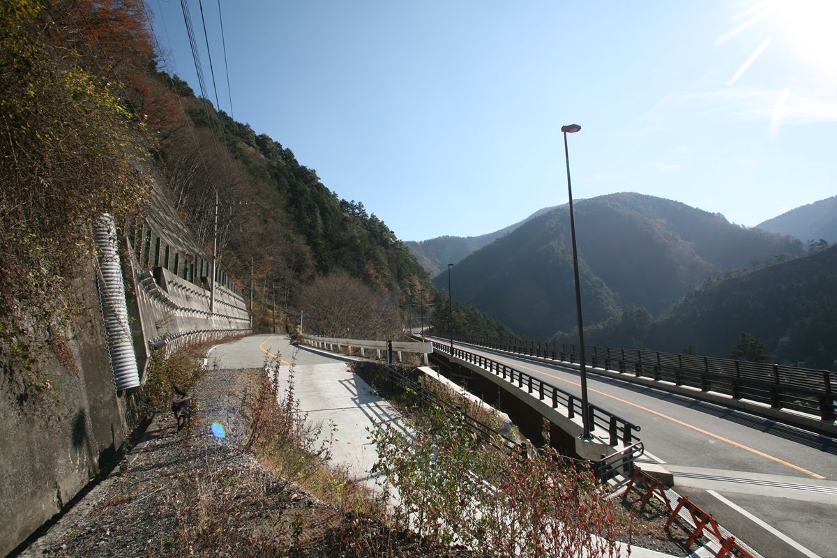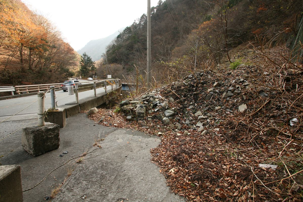 ここに書いた数字は、条件も複雑だし、絶対値をすべて鵜呑みにされるとまずいと思う。東京→京阪神が年間863万人、1日2万3000人くらいにしかならない。私が知っている数値(年間3500万人、ただし往復)の半分だ。でも、相対的な数値の比率としては、ひとつの目安にはなるだろう。 こんな数字遊びよりも、国交省がこういうデータを持っているよ、ということをもっと広く知っていただければ幸いである。 専門家の方々で、もっときちんとした分析をお持ちの方もいらっしゃると思うので、ぜひご教示いただきたく思います。メールはめんどうなのでtwitterにてぜひ。 旧橋は、ご覧のように突き当たりに土砂が積まれ、通り抜けができなくなっている。 廃道を土砂捨て場にする例はときどき見かけるが、たいていは隧道を使っている。プレートガーダーなど、撤去して屑鉄にして売ればかなりの金額になるだろうに。なぜ放置してあるのだろうか。撤去費用も含めると元が取れない、というのも容易に想像はつくけれど。 すこし西に行くと、その続きの高さにまた改良跡があった。 |