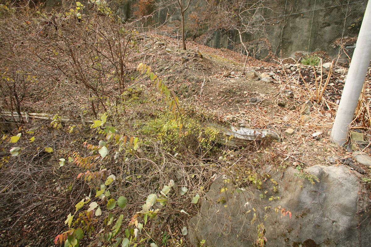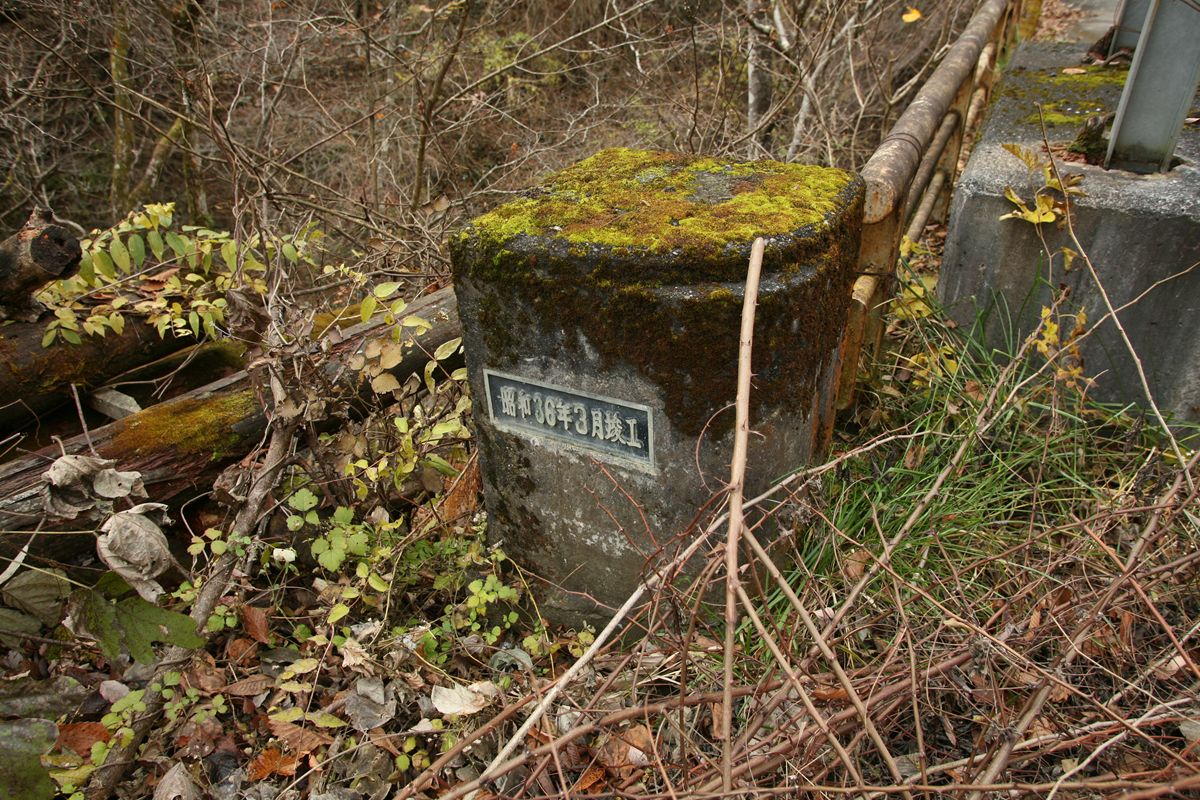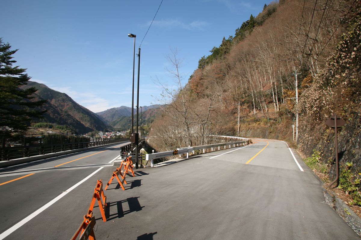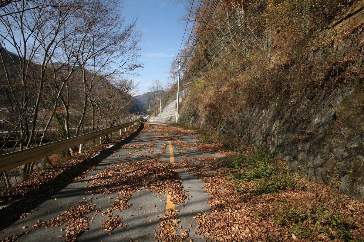 ここに書いた数字は、条件も複雑だし、絶対値をすべて鵜呑みにされるとまずいと思う。東京→京阪神が年間863万人、1日2万3000人くらいにしかならない。私が知っている数値(年間3500万人、ただし往復)の半分だ。でも、相対的な数値の比率としては、ひとつの目安にはなるだろう。 こんな数字遊びよりも、国交省がこういうデータを持っているよ、ということをもっと広く知っていただければ幸いである。 専門家の方々で、もっときちんとした分析をお持ちの方もいらっしゃると思うので、ぜひご教示いただきたく思います。メールはめんどうなのでtwitterにてぜひ。 旧橋は、ご覧のように突き当たりに土砂が積まれ、通り抜けができなくなっている。 廃道を土砂捨て場にする例はときどき見かけるが、たいていは隧道を使っている。プレートガーダーなど、撤去して屑鉄にして売ればかなりの金額になるだろうに。なぜ放置してあるのだろうか。撤去費用も含めると元が取れない、というのも容易に想像はつくけれど。 すこし西に行くと、その続きの高さにまた改良跡があった。 |