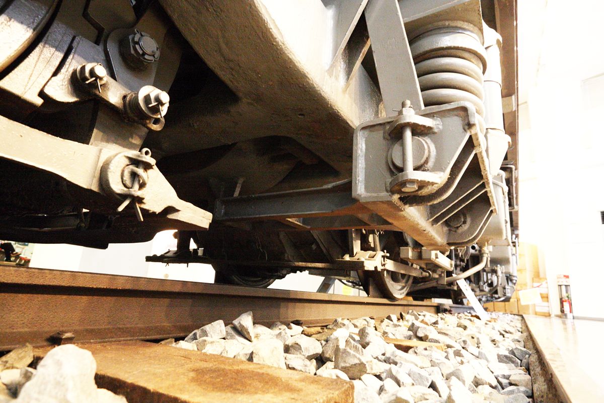 枕バネの真上、側受の上のスペーサーが何段にもなっており、とてもバランスが悪い。 左右の側梁をつなぐ台車枠の中梁の太さと、その間に見える上揺枕に比べ、下揺枕のなんと頼りないことか。いや、単なる印象だけれども。 こういう、鋼鉄の塊感がとても好きだ。
