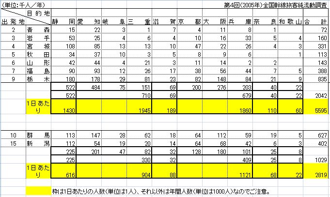 例の発言をした議員だったので(そのときはスルーしたのだけれど)「またこいつか」と思って取るに足らないみたいなことを書いてしまった。 東北新幹線と東海道新幹線のホームがこうなった経緯については国鉄時代のことから知っているし、元々、新幹線は速達型/各停型という運転系統で、仮に直通するなら速達型で青森→仙台→大宮→東京→新横浜→名古屋→京都→新大阪、のような形になる、と考えている(根拠はない)。だから、例えば福島→静岡、みたいな動き方をするには、仮に直通しても福島(やまびこ)東京(こだま)静岡、と乗り換える必要が出てくるので、直通するメリットを享受するには仙台→名古屋/新大阪、のような需要になるんじゃないか。その距離なら飛行機じゃないか、と考えていた。 だけれども、ちょっと数字が気になったので見てみた。閲覧したのは国交省が公開している「第4回全国幹線旅客純流動データの利用案内」である。2005年のもので、データの見方にはいろいろな注意点があるが、「①都道府県間流動表/出発地から目的地/交通機関別流動表/年間(平日・休日データ利用)」(H17_OD_2.xls)というものを使った。このデータは、かつて仕事でよく見ていたもので、各自治体が発表している数値と見比べたり、相対的な数値からいろいろ判断したりしていた。かなり重宝した数字である。 * * *