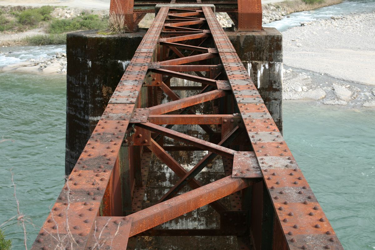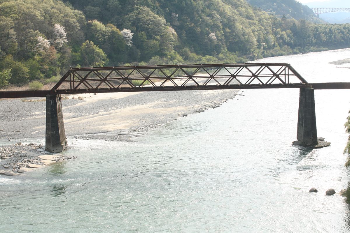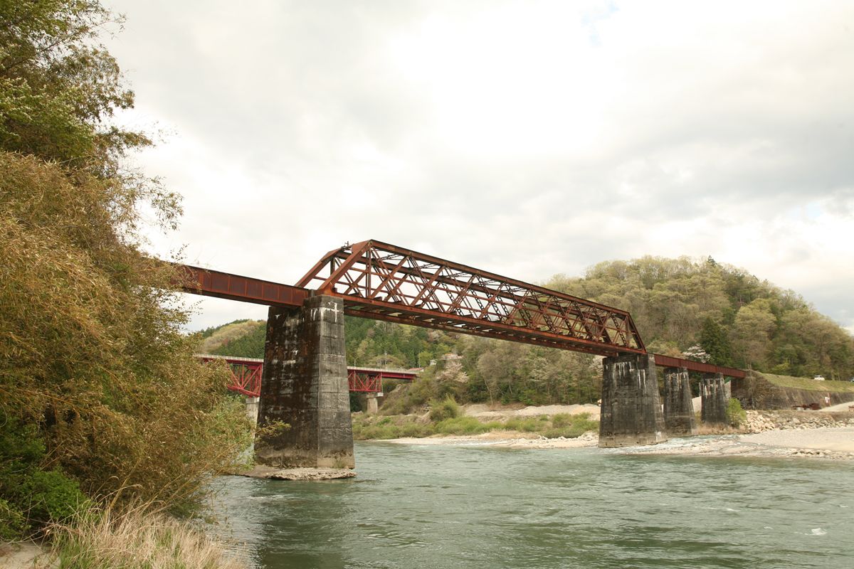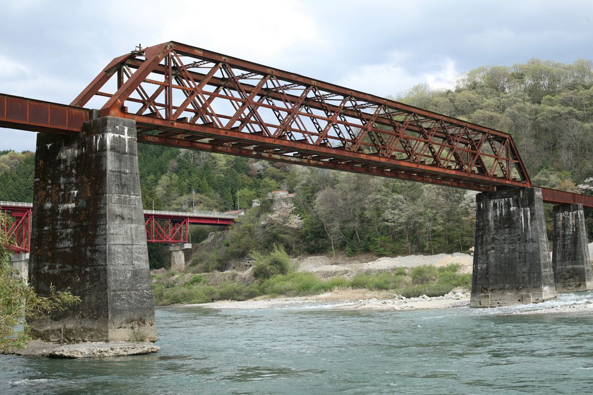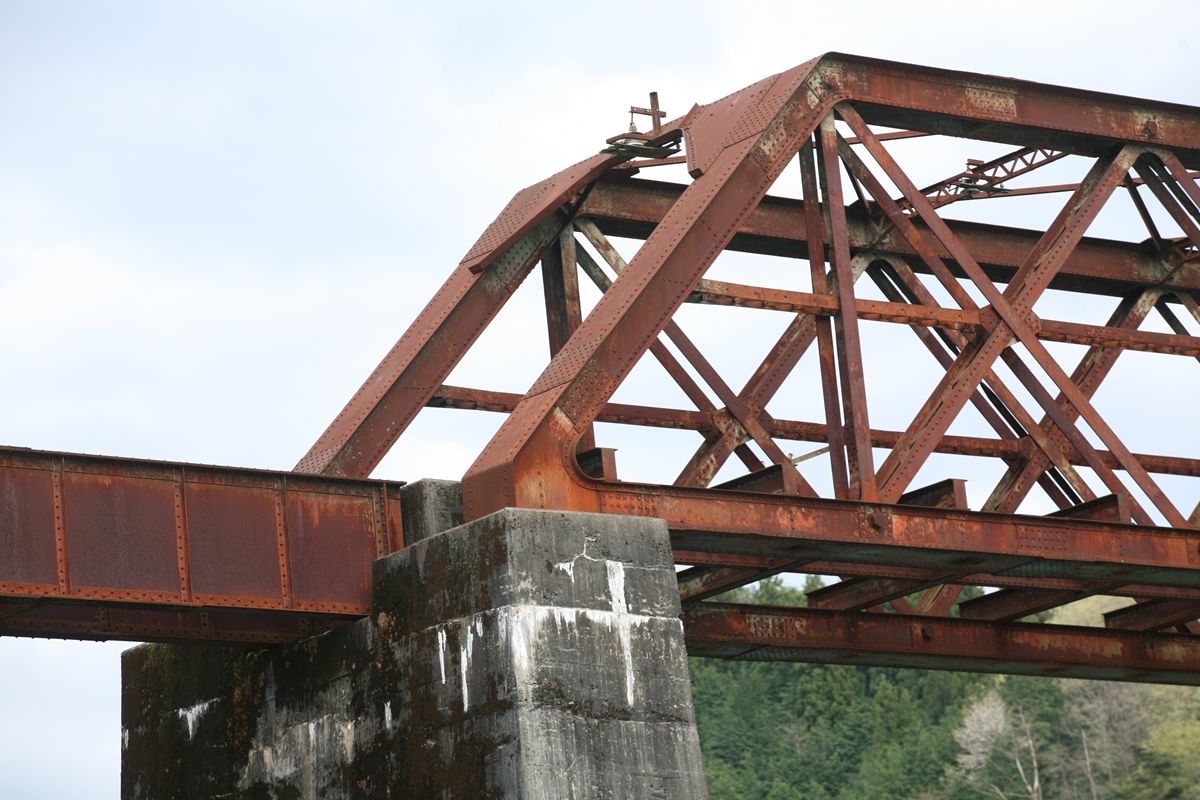 × [PR]上記の広告は3ヶ月以上新規記事投稿のないブログに表示されています。新しい記事を書く事で広告が消えます。 横桁は直線形。横桁の端部のカバープレートは、][という形をすべて覆ってはおらず、太い「I」型になっている。 そして、縦桁が横桁同士を結んでいる。この構造は揖斐川橋梁と同じだ。150フィート桁だが、山形鉄道最上川橋梁とも同じ。これはパテントシャフト&アクスルトゥリーのひとつの型、と考えていいのかもしれない。 . 錆びに覆われているから「美しい姿」とは言えないかもしれないけれど、この木曽川橋梁は、その形が美しい。200フィートは単線形のピントラスがもっとも美しいと信じているが、高さがなく、棒のように見えるダブルワーレンにはそれに次ぐ魅力がある。
