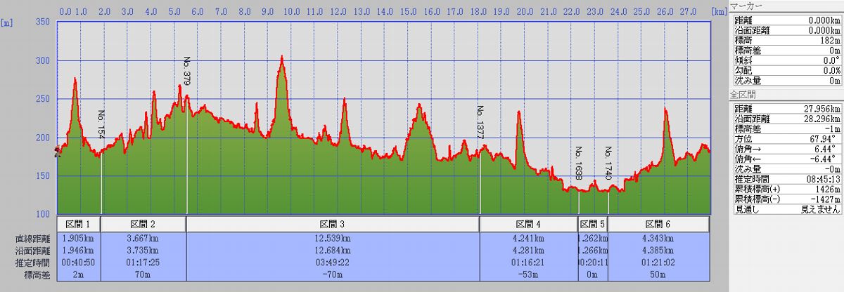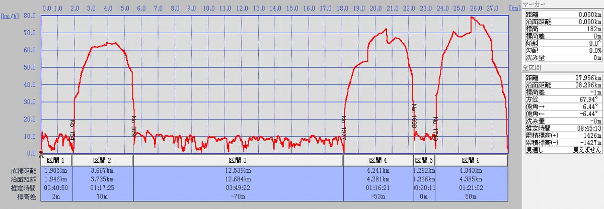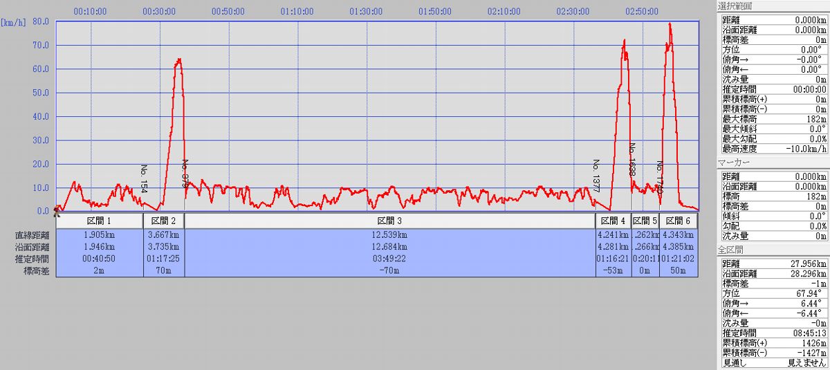 場所は西武池袋線吾野駅周辺。制限時間は3時間。よんますさんのおしりあい二人とのチームに入れていただいた。私はちょっと長い距離を競技として走ってみたいという思いと、GPSログを取りたいという気持ちで参加した。なお、本来のロゲイニングはGPS端末は使用禁止。今回は、ちょっと別な事情があって(特別に?)ログ取得の許可を得ている。ここでは差し支えないだろう範囲でログを元に、どれだけ移動したのかとペースをメモしておく。私のペースは、常にチームの3人に引き離されながら、待ってもらいながらやっとの思いでついていった…というもの。足を強くせねば。 沿面距離は15.89km。思ったよりも走って(歩いて)いない。 こうしてログを見ると、必死で走っていてあまり記憶がない部分も見えてくる。GPSログは本当におもしろい。 誘ってくださったよんますさん、チームのIさんとSさん、主催の奥武蔵ロゲイニング実行委員会のみなさまに感謝します。 (グラフはすべてDAN杉本氏作成のカシミール3Dを使用) |
