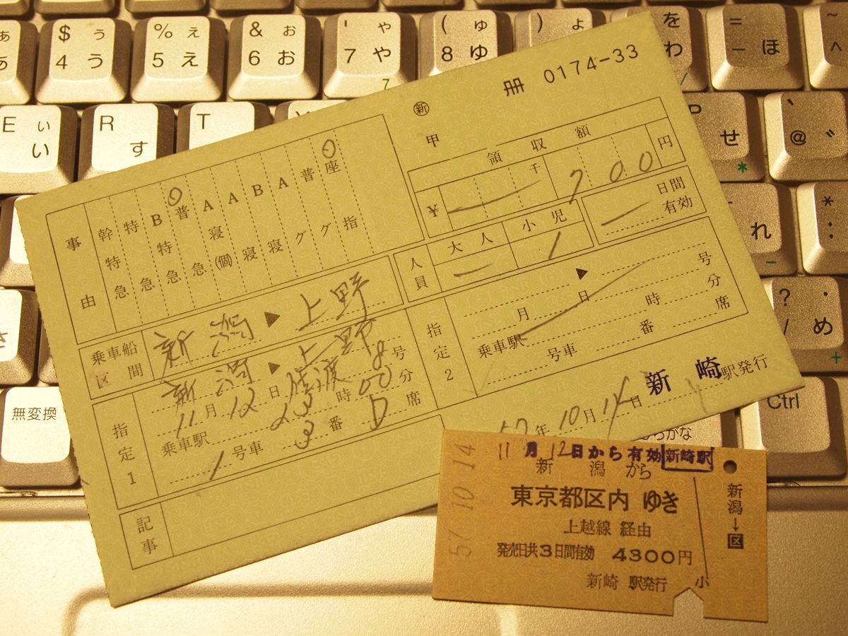 きっぷを新崎駅で買ったことも、前記記事の通り。「もし、売り切れていたらどうしよう」などというのはまったくの杞憂だった。そもそも「自由席が満席だったらどうしよう」と思って生まれて初めて指定券を取ったのだが、乗車してみると、乗客はほとんどいなかった。昨今、夜行列車が廃止になると決まると指定券や寝台券が瞬く間に売り切れてしまうことから考えると隔世の感がある。夜行『佐渡』こそ廃止になるが、ダイヤ改正後も『佐渡』は残るし、全国各地に夜行列車は多数走っていた。 乗車券は母が使ったもの。私が使ったものは小児断片が切り落とされていて、いまちょっと行方不明。