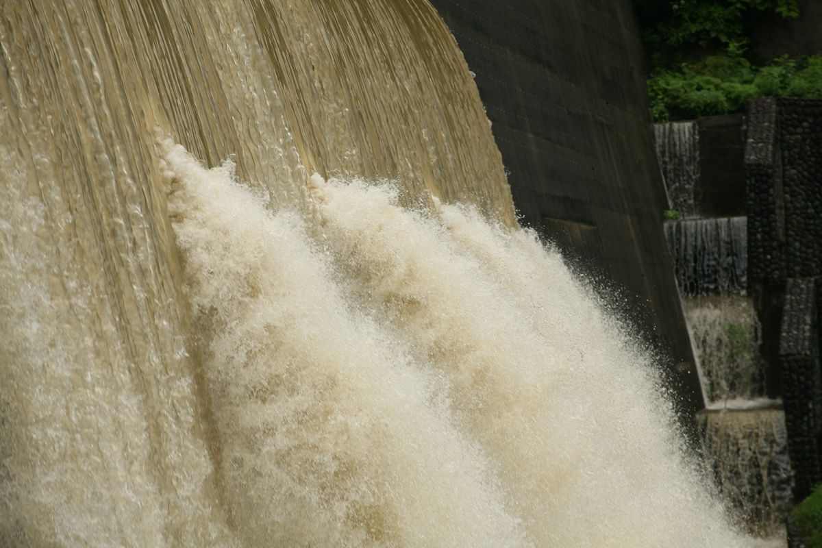 前日、ここを通ったときには、丸い穴から水がブワッと噴き出しているような感じだった。この写真のように堤体が滝になってはいなかった。 ところがこの日、すなわち7月16日(月)の午前には、このような状況になっていた。前日の写真を撮っておけば比較できたものを。 (前にも書いたな) なかなか「平常時」の画像がネットにないのだが、「大雨の後」というのがあった。まだまだ水量は少なく見えてしまうが、これを見ると、冒頭写真のような「上」だけでなく、「下」にも排水孔があるのがわかる。ああ、またここも再訪しなくては。。。 |