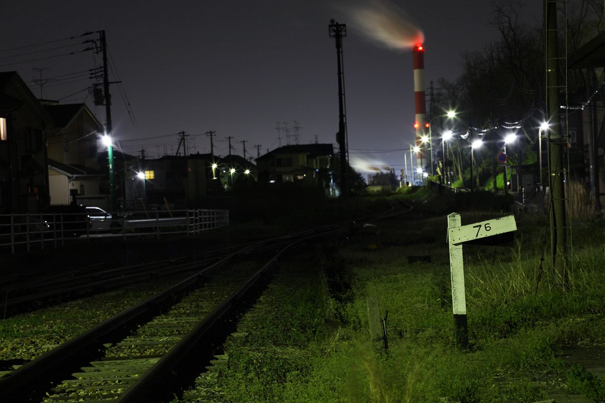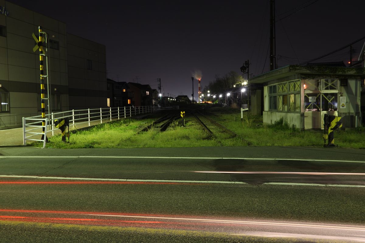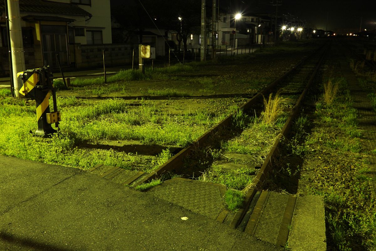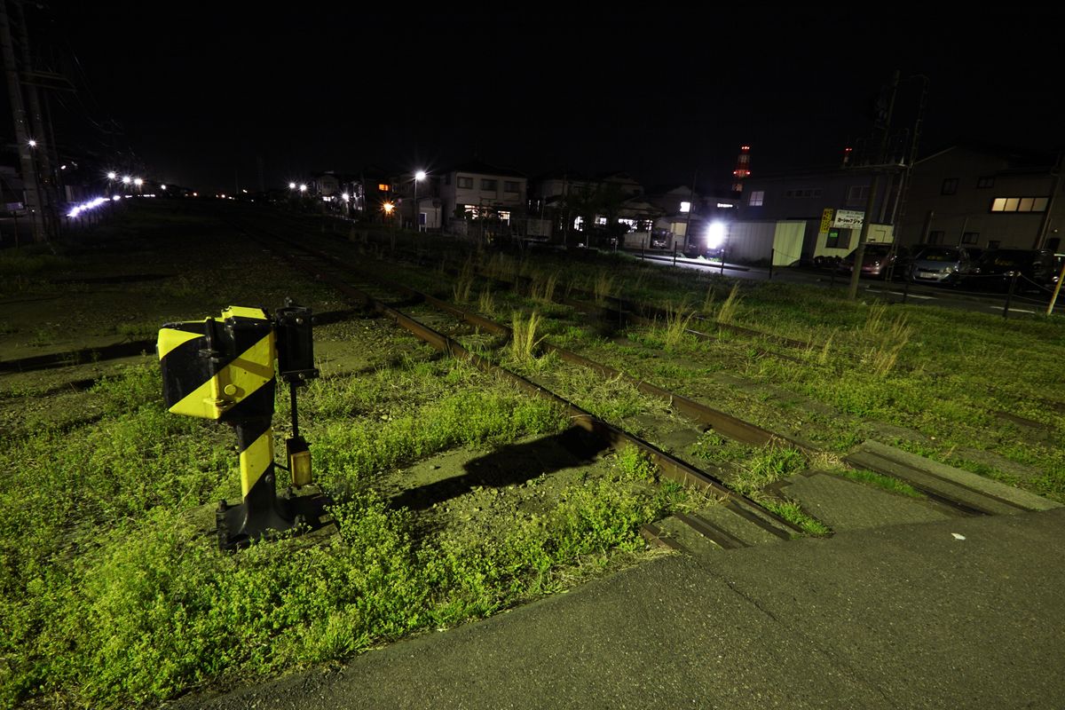 重油を運ぶ水管橋 東北電力新潟火力発電所が、かつての臨港線をまたいでいることは記事に書いたとおりだが、この水管橋と道路1本隔てて線路が放置されている。途中で分断されている箇所もあり、本当に放置状態である。その場所は真っ暗なので、少し南下した場所で撮った。