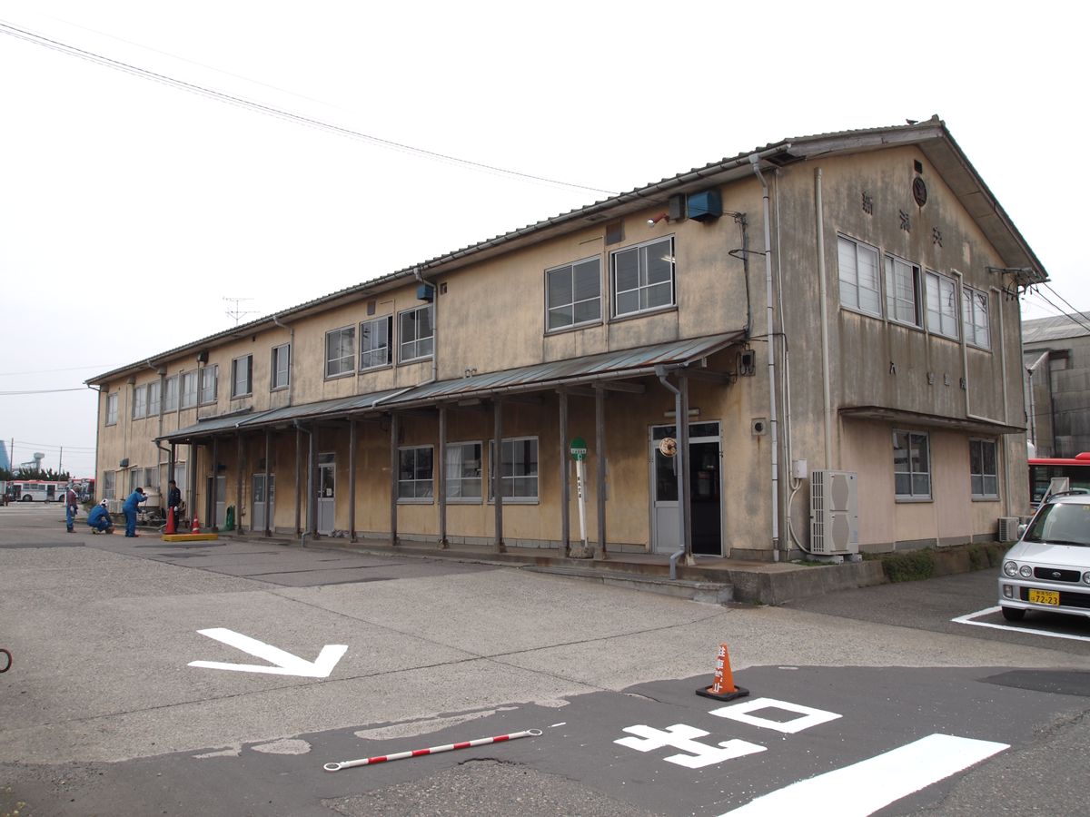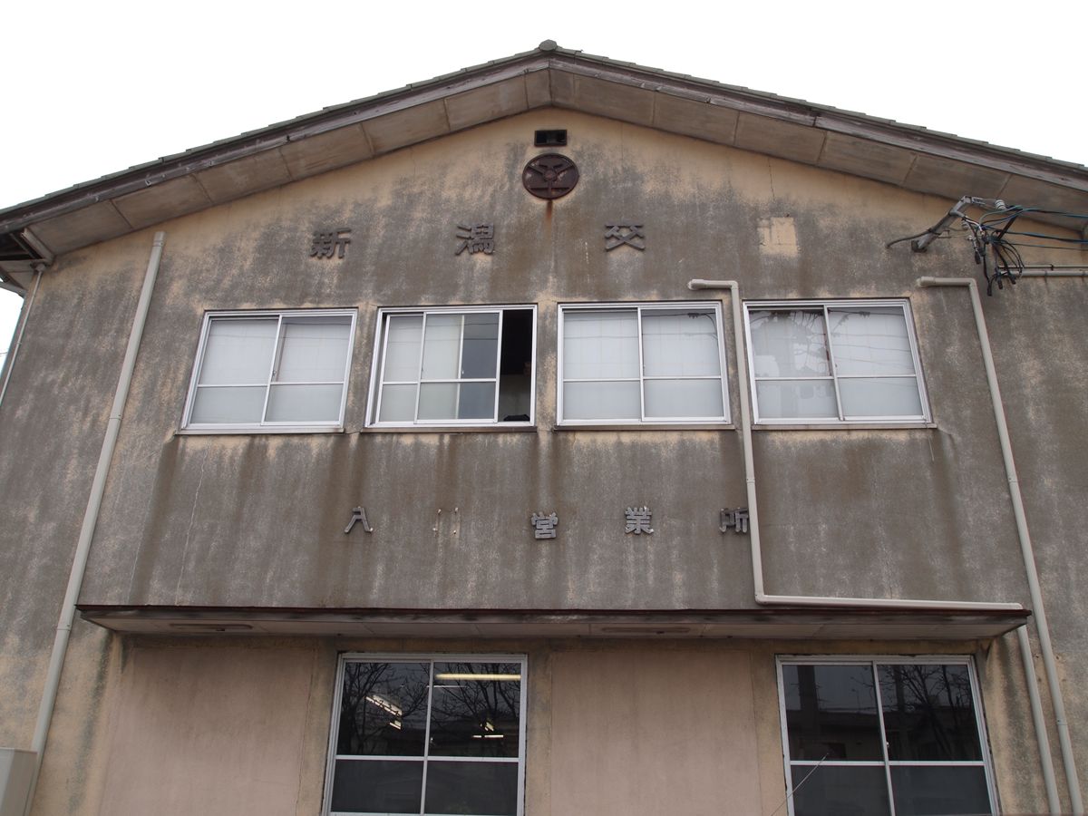 いまこうして写真を見ていると、サービスルームの側面が気になる。そちらもつぶさに見ておくべきだった。給油所部分をいくら改装しようとも、そうしたところはその前の世代のテイストが残っているものだ。 アーチの径間は60m近くある。しかも、スキューしている。残念ながら、ここで給油はしていない。 大きなキャノピーに山小屋風の意匠。こうした「山小屋風」三角形がもてはやされたのはいつの時代なのだろう。私が子どもの頃にはそういう表現がなされていたから、1970年代のものなのだろうか。 三角の部分は明かり取り窓になっていて、ドームの下はとても明るい。ここでは給油した。 村上の店舗もすてきらしい。次回、行ってみる。 庇の柱や屋根の部材が木製だし、この建物も木造なのかもしれない。瓦(新潟弁では頭アクセント)の屋根、モルタルの外壁、アルミのドアやサッシ。新潟県を代表する企業の一営業所なんだから、もう少し外観がきれいでもいいような…。 外観よりも、社名も営業所名も脱落してるじゃないか! これでいいのか。 この建物の場末感たるやすばらしい。待合室を覗くのはためらわれたのでチラ見しかしていないのだけれど、中には、かつての国鉄駅のような定期券売り場もあるようだ(かつてはあった)。いつまでも「下(しも)」に似つかわしいこの雰囲気を残していてほしい。 <すてきなサイト> http://club-shinko.sakura.ne.jp/office.html 入船営業所に行くには、新潟駅前の「味のある」バスターミナル2番線から附船町(つけふねちょう)行きに乗る。最短ルートを通らず、八千代橋をぐるっと回って古町、そして入船営業所に着く。 私が高校生の頃は、古町止まりの郊外の路線のバスが、回送を兼ねて古町始発附船町行きとしてこの路線に入っていた。間合い仕様なのだが、行き先方向幕は「附船町」となならず、必ず二つの行き先の真ん中、白地部分(上下に他の行き先の文字が少しずつ見えている)を掲出していた。正規の新潟駅~附船町ルートのバスよりも、郊外路線のほうが大型で新しいバスが入っていた。いまでは、この入船営業所から、みなとトンネルを回送して東側に行くバスがある。 入船営業所からのバス路線が整理されたのは1980年頃だっただろうか。幼少時、入船営業所からは「沼垂行き」と「川岸町行き」があった。沼垂行きが、現在の新潟駅行きに変更された。川岸町行きも何かに変更され、ルートが大幅に変わったのだが、現在の路線とどうつながるのかはわからない。 |