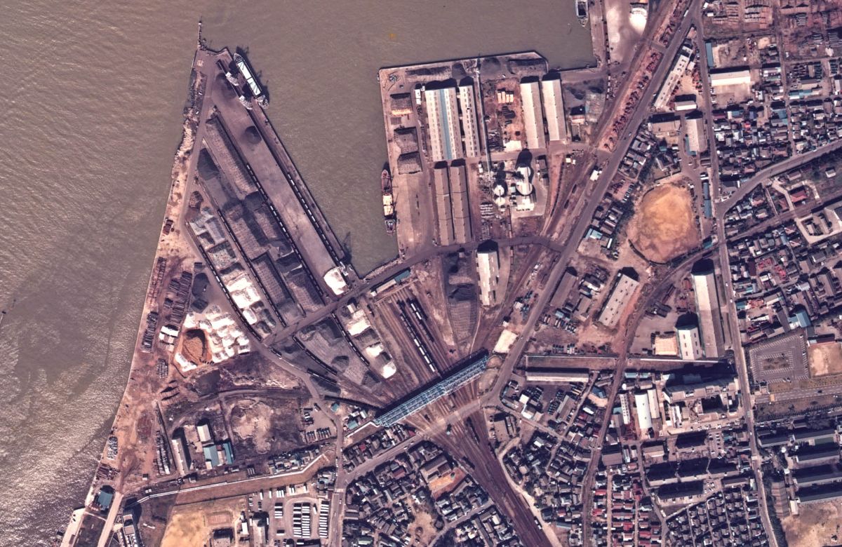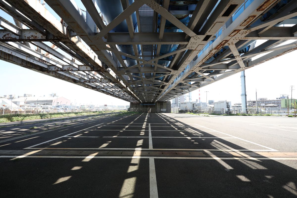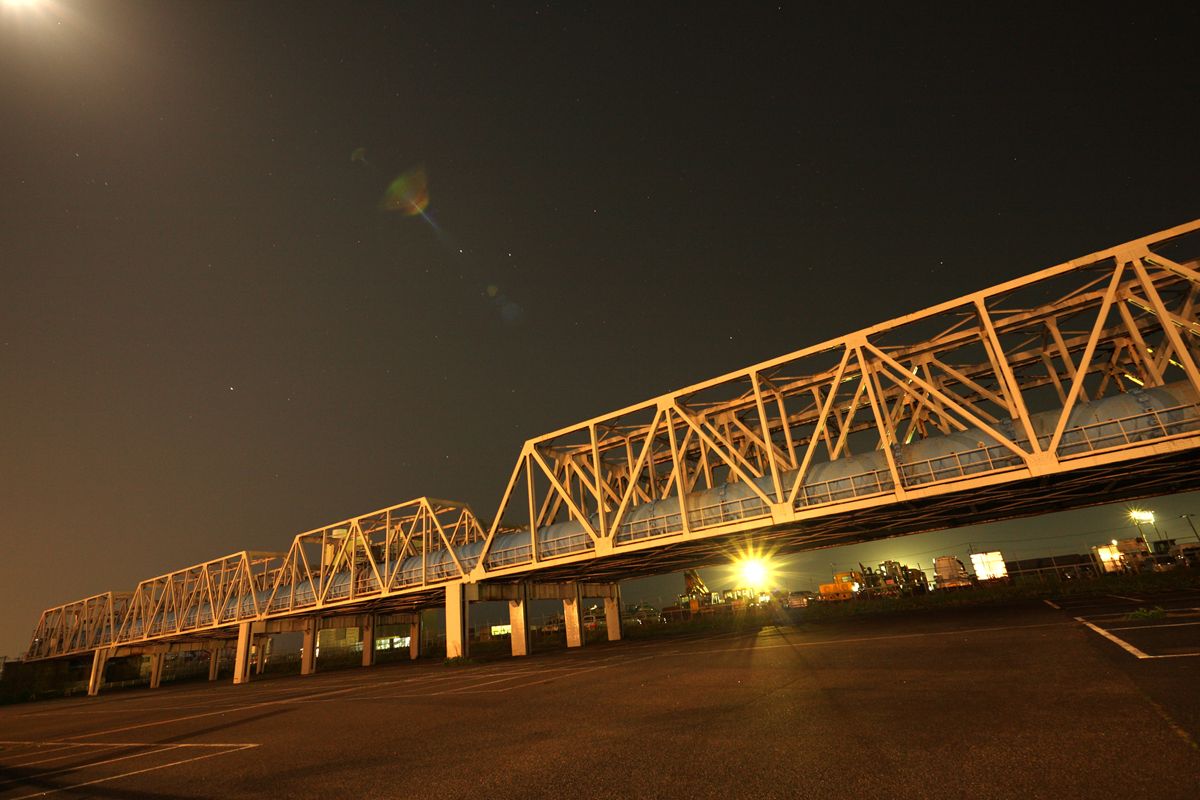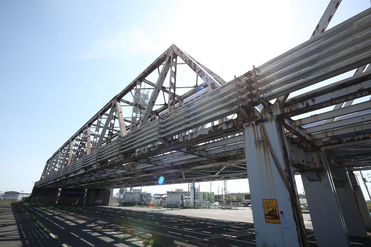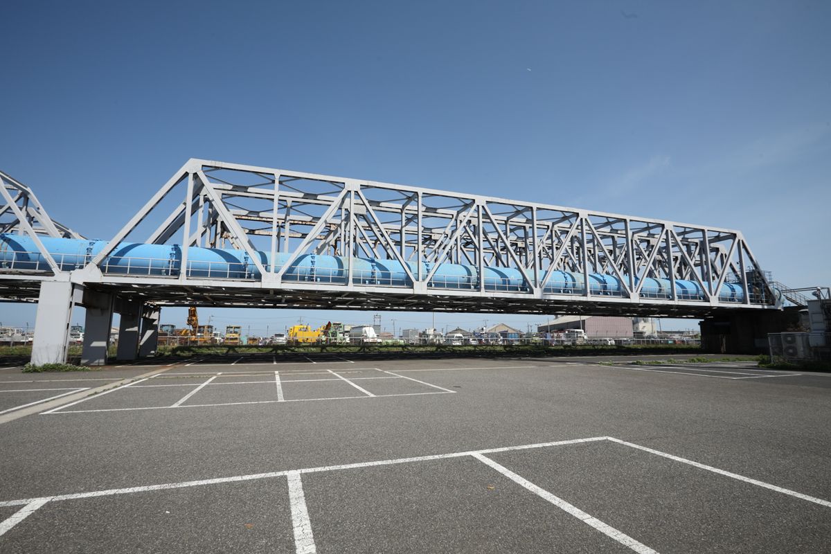 新潟みなとトンネルの「山の下みなとタワー」から、こんな橋が見えた。 ワーレントラスが3組、並列している。スパン割はそれぞれの端部を除いて同じで、上空から見ると、写真で言うと手前(北側)を長辺、奥(南側)を短辺とした台形になっている。 その晩。 翌朝。 なぜ、こんなスパン割なのか。それは、かつての航空写真を見れば一目瞭然だ。 拡大。 なお、1962年の写真ではトラスはない。火力発電所の稼働が翌1963年7月からで、当時はまだ建設中のようだ。1975年の写真は、これに比べてずいぶんと港が掘り込まれている。 桁に戻る。