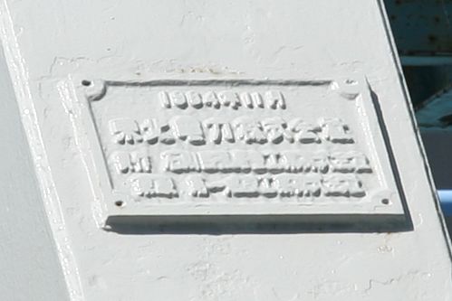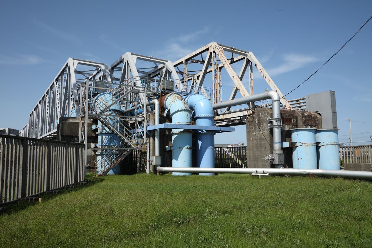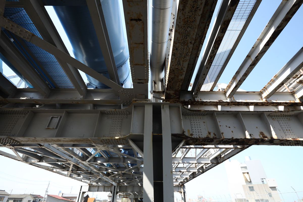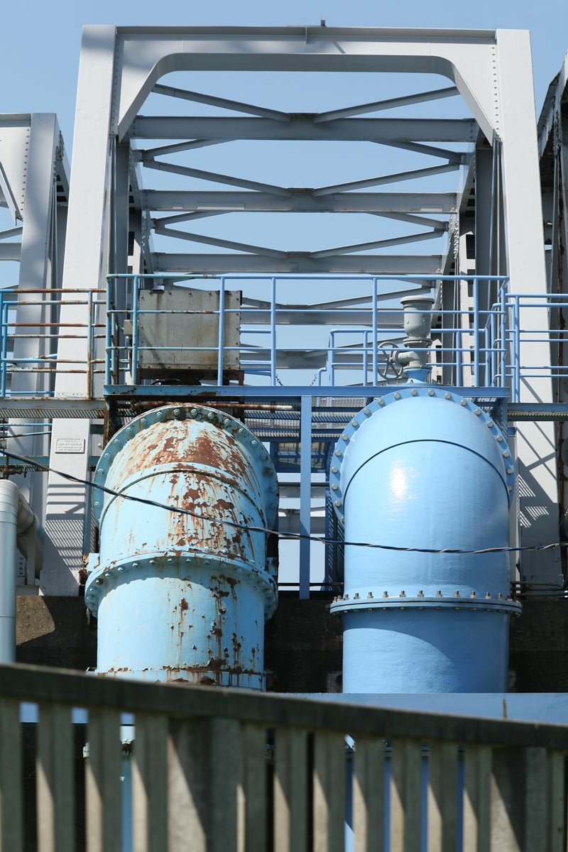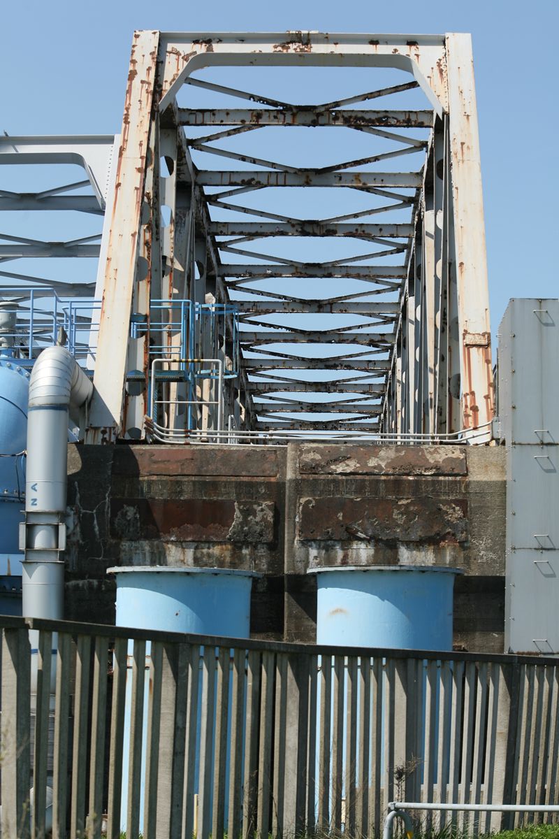 端部(東側)。トラスよりもこの太い鉄管が美しい。 製造銘板を、左から。 左端(単線)。 東北電力株式会社 製作 石川島播磨重工業株式会社 架設 第一建設工業株式会社 中央(複線)。 東北電力株式会社 製作 石川島播磨重工業株式会社 架設 第一建設工業株式会社 この「複線」は1981年の航航空写真に写っているので、架け替えられたのかもしれない。 右端(複線・廃線跡) 1962年10月 東北電力株式会社 製作 石川島播磨重工業株式会社 架設 第一建設工業株式会社 となっている。 単線。 「複線」。こちらは階段がない分、とてもスッキリ。 そして、複線(廃線跡)。 トラス部分の鉄管は撤去され、地面に突き刺さる部分だけが残っている。