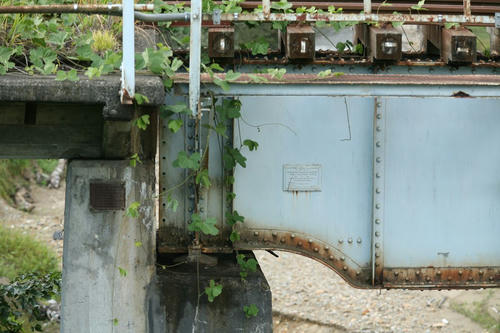 この木津川橋梁は、ランガー化した部分に目が行きがちだが、横桁もかなり特徴的。詳細は英国系100フィートポニーワーレントラスの横桁考(8)関西本線木津川橋梁をご覧ください。 防火壁はくたびれてはいるが、現役だ。「星商店」とあり、道路をはさんだ向かい側が、星さんの家。このあたり、星さんという大きな家がたくさんあり、かつての山口村(合併後は南会津町)の街中にあるシェルも、星商店である。関連があるかどうかはわからない。 ノズルのtatsunoのロゴに、時代を感じる。各文字の感覚が大きく、そこを、横一線に貫く棒がある。この計量機の製造は昭和50年だから、まさにその時期の流行なのだろう。 HITACHIは確実にあった。クルマのエンブレムも、詳しくはないのでわからないけれど、確実にあった。こういうデザインのものが。 この日は金曜日。実は、現役だと気づいたのは帰宅後に写真を見返しているときで、このときはもう使用停止になっているものだと思い込み、クルマを前に停めて、堂々と写真を撮っていた。それでも、向かいの星さん宅からはだれも出てこない。だから、ますます使用停止だと思っていた。いま思うと、冷や汗が出る(というほどでもないか)。 軽油だけなのは、農機がディーゼルエンジンだからだろう。そうか、私が自家用車(レジアスエース;ハイエースのNETS版)だから、見向きもされなかったのか。なお、農機に入れた軽油は、本来は軽油引取税を支払う必要がない。しかし、それを証明するのも難しいため、その余剰金(?)を使って農免道路が作られるのは、知られている通りである。 橋梁史年表によれば、データは下記の通りの、鈑桁とRC桁を組み合わせた8連の橋梁である。 ・開通年月日 1957年8月1日 ・橋長 108m ・詳細 RC桁(8.2m*か6.6m)+19.152m鈑桁×2(再用桁)+12.9m鈑桁×4+RC桁(8.2m*か6.6m)(小出方=画像左から) *『鉄道ピクトリアル』2010年11月号に掲載されている線路一覧略図(1982年)によれば18.2mとなっているが、それでは橋長が114mを越えてしまい、橋梁史年表および『田子倉発電所建設用専用鉄道工事誌』掲載の地図(の転載)にある「橋長108m」と矛盾するので、「18.2m」が誤記であると推測する。 なお、上の写真に写っている方とお話をしたけれど、何の調査をしていたかは聞いていない。 西側から見て行く。RC桁を撮っていないのは、なんというか…。いかんな。 設計 新橋工事局 施工 佐藤工業KK 設計荷重 KS-15 基礎工 コンクリート 基礎根入 天端から9.5M 着手 昭和31年9月5日 しゅん工 昭和31年10月11日 第7連の銘板。 川崎造船所○○(品川?)工場製作 LIVE LOAD COOPER`S E33 鉄道省 --------------- MATERIALS (以下判読不能) その第7連と同じ、第6連。 桁の下端がRを描いているのが時代がかっているというか。 この区間の施工が橋脚の銘板の通り昭和31年頃なのに、桁の製造は大正8年。40年弱の間、この桁はどこで何をしていたのだろうか。 只見線の会津川口以西、田子倉までは、電源開発田子倉専用鉄道として建設されたもので、『鉄道ピクトリアル』2010年11月号の只見線特集における『電源開発 田子倉専用鉄道沿革史』(澤内一晃)によれば、「ガーダー橋のかなりの分が飯田線水没区間からの転用であるのは知られた話である」とある。しかし、飯田線の水没区間(佐久間~大嵐間)の(三信鉄道としての)開業は1936年(昭和11年)であり、第7連の銘板にある、大正8年(1919年)製造とは時期が合わないし、なにより「鉄道省」という陽刻がある。ついでながら「レールについても飯田線と士幌線の水没区間から転用され(略)30kg…」とある。 第7連(左)と第6連(右)。 第6連(左)と第5連の架け違い部。 橋脚の銘板に記載事項は、前述のものと基本的に同じ。異なるのは基礎根入の深さで16.5m、また工事着工が9月10日で竣功が10月25日となっている。 電源開発株式会社 活荷重KS-12 ○○では212 株式会社宮地鉄工所製作 昭和31年 ---------- L. 日本鋼管株式会社 ○. 日本鋼管○○○○ ○○ 富士製鉄株式会社 下のマークはなんだろう。Aとあるように見える。富士製鉄のマークは「S」である。 この塩沢川橋梁については、ネット上にはほとんど情報がない。列車を撮影するなら、西の第8只見川橋梁はじめ、知られた場所が多数あるからだろうか。それでも私は、こうした地味な橋梁にとても引かれるのである。 |