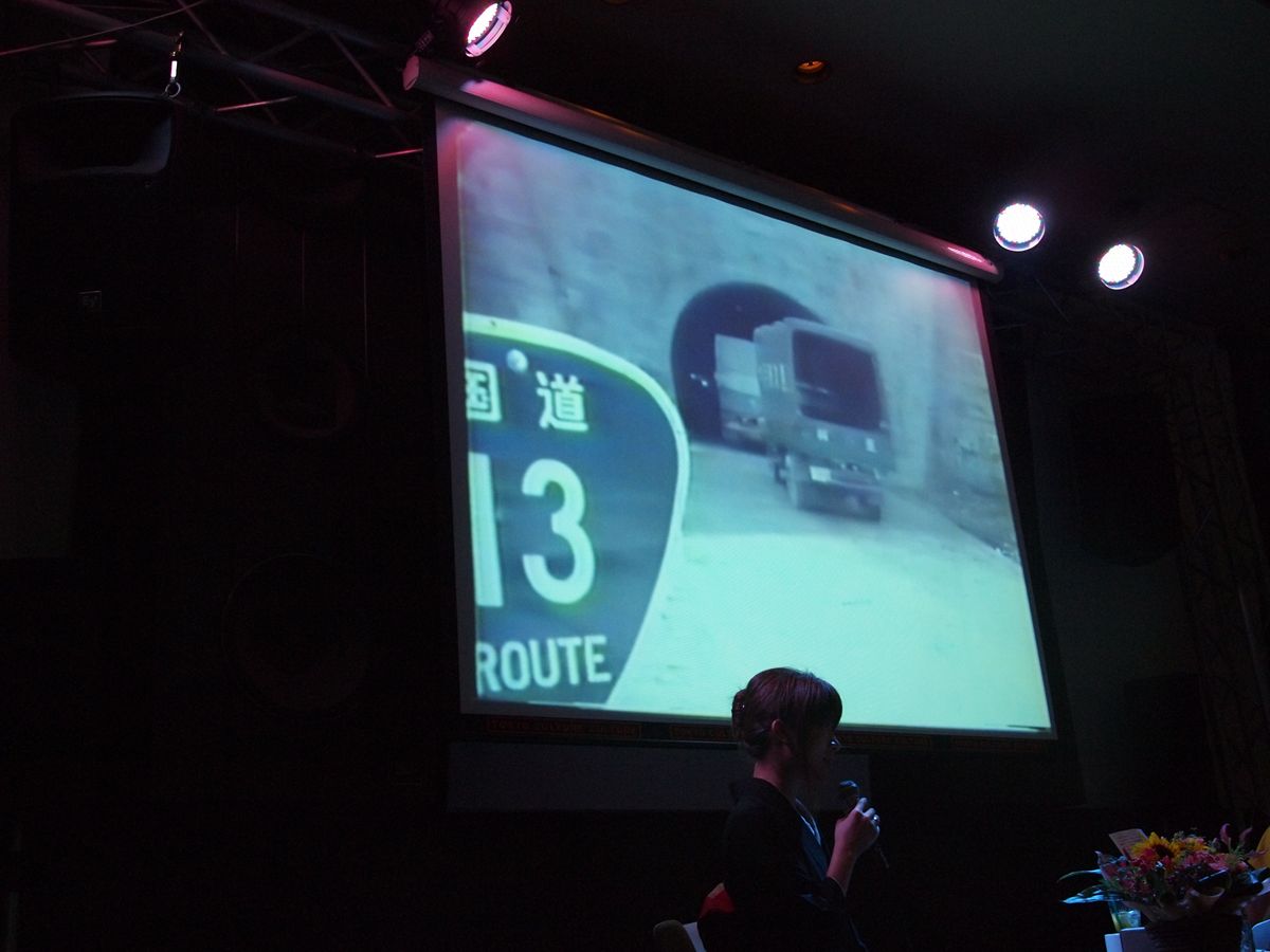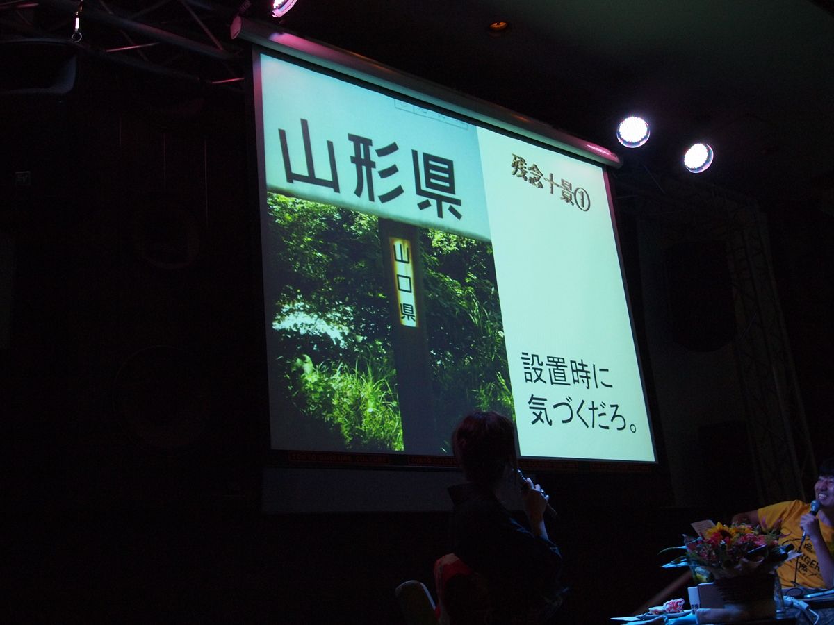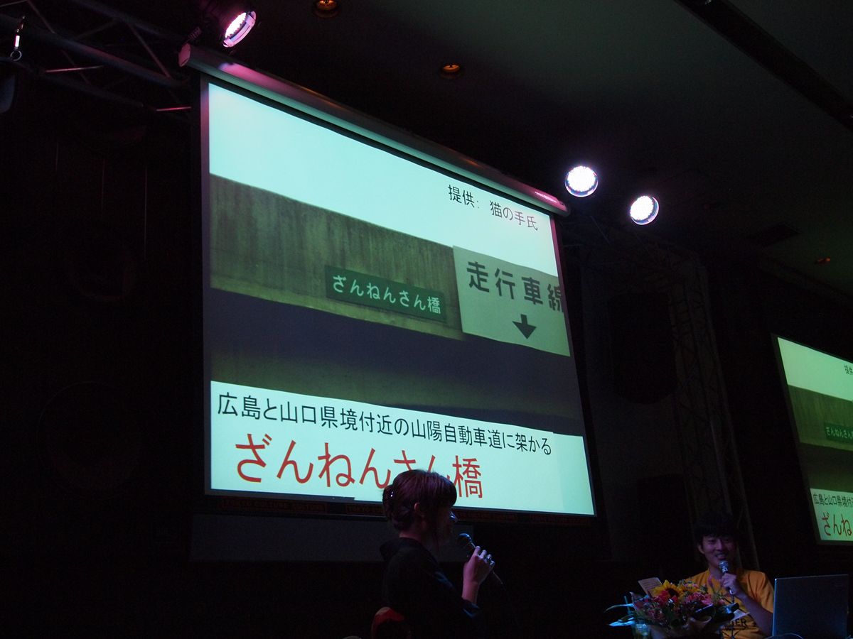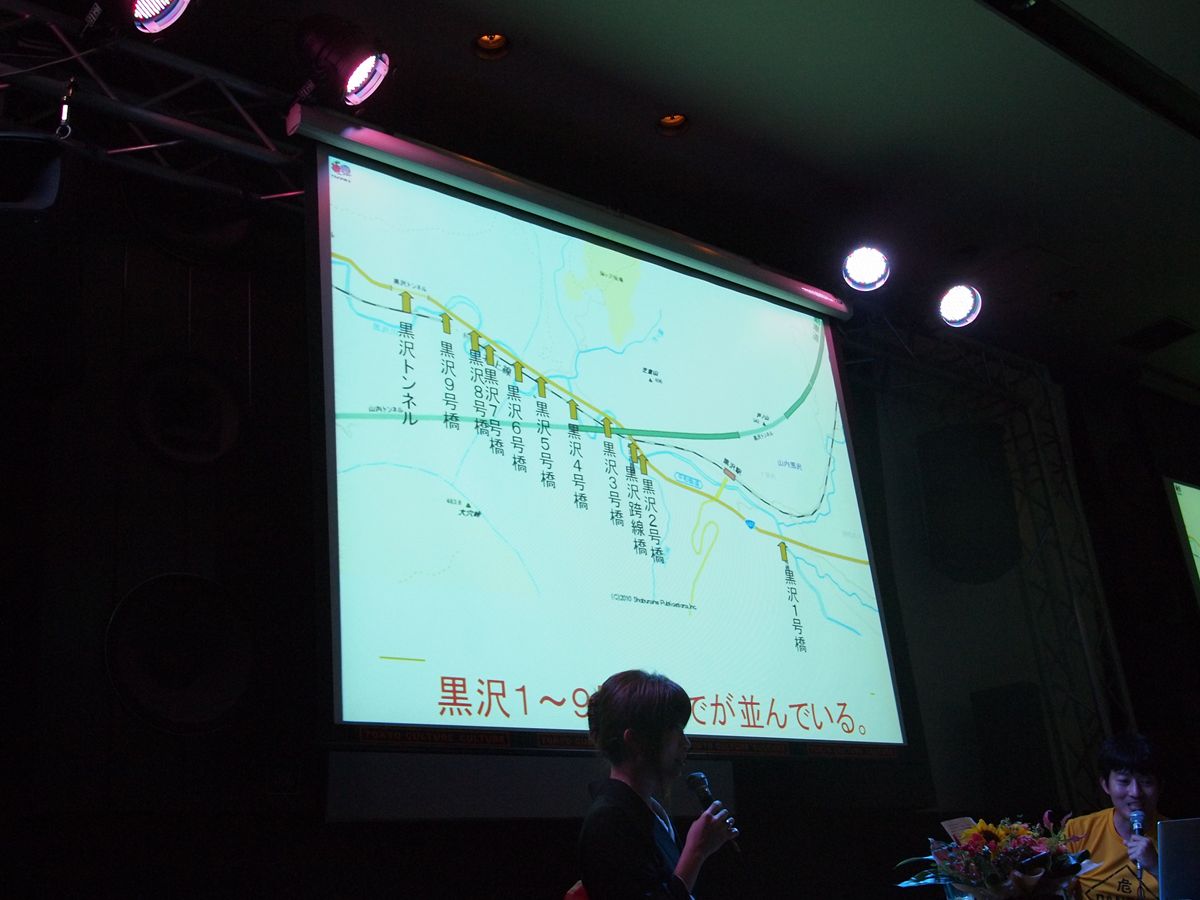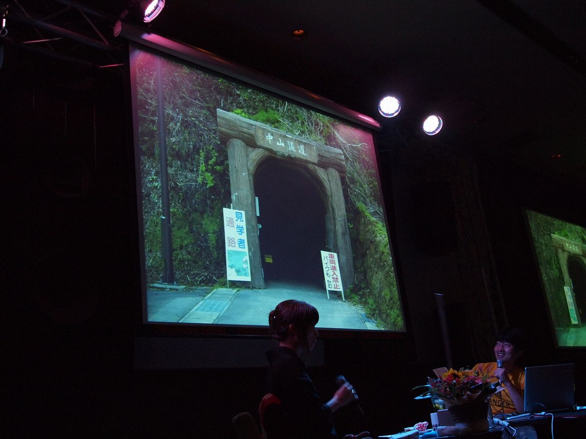 これは、有峰林道小見線のある隧道で、全線にわたって改良が進められている有峰林道の隧道群のうち、比較的最後まで残っているグループだ。現在は新道が開通しており、この坑門がどうなったのかはわからない。 有峰林道小見線は、地形図を見ればわかるとおり、とても興味深い道である。ニンニク隧道を含めて『日本の廃道』43号(2009年11月号)にレポートしたので、ぜひご覧いただきたい。→購入(私にお金が入るわけではありません^^) 私が訪れたのは2009年7月。幅員の狭さゆえに片側交互通行であるこの狭小の隧道区間を改善すべく、新隧道の工事中だった。別に旧道に入ることにためらいを感じるような状況でもないのだが、監視員がいるために控えておいた。その秋、この近くで大規模な崩壊が起き、翌2010年は通行止めが続いていたような気がする(←まったくのうろおぼえ)。 新隧道はこんな状態だった。 新隧道の開通は、今年(2011年)の6月1日。富山県のサイトに開通式についてのPDFが残っている。 ついでに、ニンニク雪害ガード。 過去のイベントレポートはこちらに。 廃道ナイト!(メインはORJにて<PDF>) 廃道ナイト2 廃道ナイト3!!! 今回は、チケット発売が確か7月15日。しかし、18日にはチケットが完売していたと思う。カルカルで開催された過去3回はすべてチケット完売だったが、この早さは過去最速。異常。早すぎてチケット取れなかった方が、私の友人たちにも何人もいた。ざんねん! ざんねんさん!(後述) 18時、まだ外が明るいうちに、スタート! まずはヨッキさん入場、第1回と同様、自転車にて! 本当は、横山店長から「客席を突き抜けて厨房(舞台に向かって左端)に突っ込んで折り返してこようか」という提案があったらしい。 続いて、トリさんの入場。 クルマでしか隧道に入ったことがない人は、ピンとこないかもしれない。隧道は、寒いのだ。とくに峠を抜ける隧道は、あちらとこちらで気温差も標高差もあるために風の通路になっており、気温が低いだけでなく風により体感温度も下がる。 今回、ミリンダ細田氏と、まずは現役の国道隧道で調査し、廃線跡の廃隧道で調査し、道路の閉塞廃隧道にたまった水の温度を調査し、最後に仙岩トンネルを調査した。その驚くべき考察。 普通に考えると、隧道の中央部がもっとも気温が低くなりそうな気がする。しかし、そうではなく、偏りがある。また、坑口近くでは、気温の下がり方が急激である。こうしてグラフだけを見るとなんてことないけれど、なんという「疑問力」と「考察力」だろう。これこそヨッキれんさんの真骨頂。 続いて好例の『道路ファンが選ぶ残念&粋な風景』。「ふれあい橋」やら道路にある看板やらの「残念」なものに注目していくもので、事前に募集がかけられていた。いくつか発表された中から、かいわれ氏のものを。 なお、帰宅後検索すると、「残念さん」は、幕末には一般名詞化していたようだ。参考→残念さん 続いて。 ところがトリさんが地元の人に話を聞くと「坑門が延長されて落雪の被害もなくなってよかった」というような反応が来たそうだ。鑑賞者と実用者(ただし、この発言は地元の人ではあるが、ぺらぺら話したがりの人らしい)との意識の差が出た一瞬。 第3幕は、noganaさんによる発表。 次は「粋な動画」。 バアアーーーン! なんかすごいの来たよ! 栗子隧道が現役だ! 当然、路面はダート。いまでもダートだしな。この程度の旧曲線でもバスやトラックをフレームに収め切れていない。これが撮影された昭和30年代前半(たぶん)の機材の事情もわかろうというもの。 この動画で現役当時の姿を店ながら、その合間に現在の姿の画像を挟む。とてもわかりやすい、興味深い動画だった。なお、このフィルムでも、すでに山形側坑口は改修されて直線状になっており、初代坑口は「廃」として採り上げられていた。 次は「夏のオブローダー自由発表」と題して「連番名称の愉しみ」。 なお、鉄道では、おそらく山田線の閉伊川橋梁が「第三十四」まであり、最多ではなかろうか。そして、その第三十四閉伊川橋梁は、東日本大震災による津波で流失している。 いくつか例が出たのだが、これはちょっと残念な例。 ここで第一部終了。の前に、トリさんが作ったグッズの紹介。これでまた、物販コーナーもおおいそがしに。 第2部は、『熱中スタジアム』に出演したトリさんに聞く裏話。15分ほどの番組だったが、5日もロケをしたとか。トリさんは身軽にひょいひょいと廃道をあるき、道がない場所にも踏み込もうとすると、スタッフから「カメラがあるから無理…」(もしかしたら、安全への配慮かも)と言われて行けなかった場所がある等、こうした場ならではの裏話。 続いてあづさ2号さんのレポ。 そして、いよいよ廃道ナイトのメインイベント、後述レポート。だ。 いつも通り(?)時間もオーバーし、なごやかにラスト。『トリの隧道連想クイズ』 第1問は、とても簡単。三島通庸の写真や地図が3つ表示され、答え
