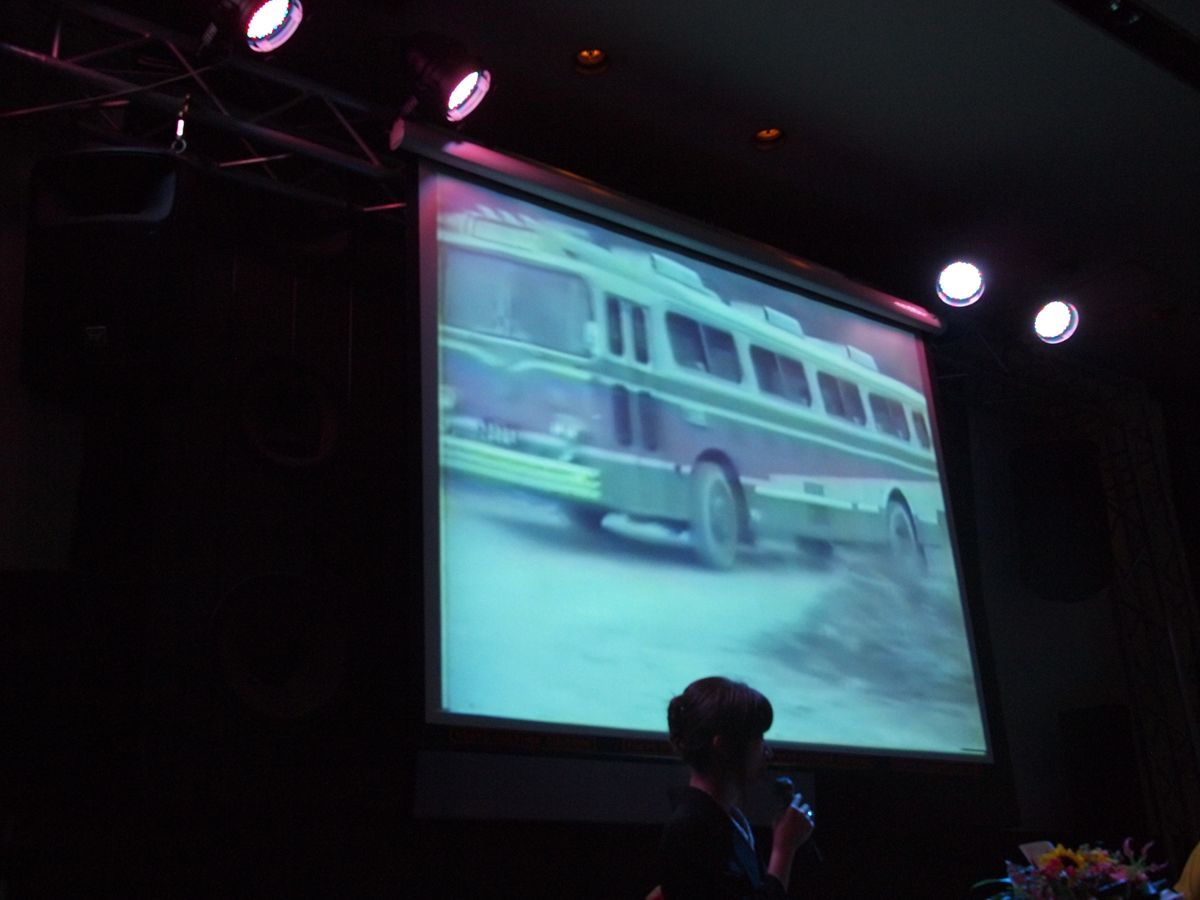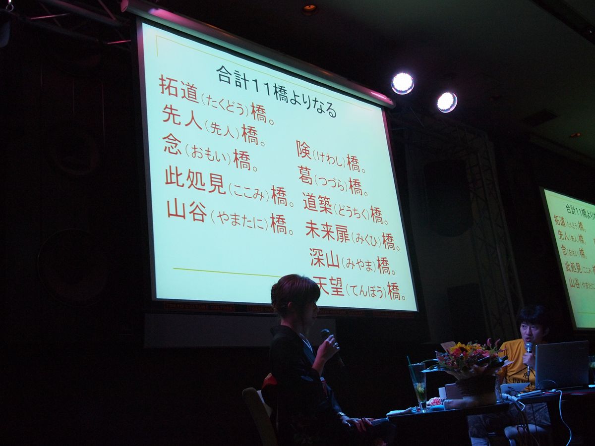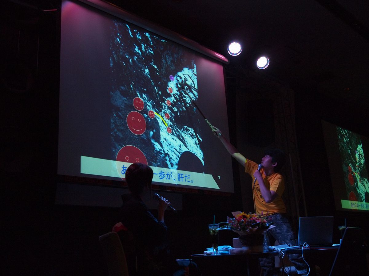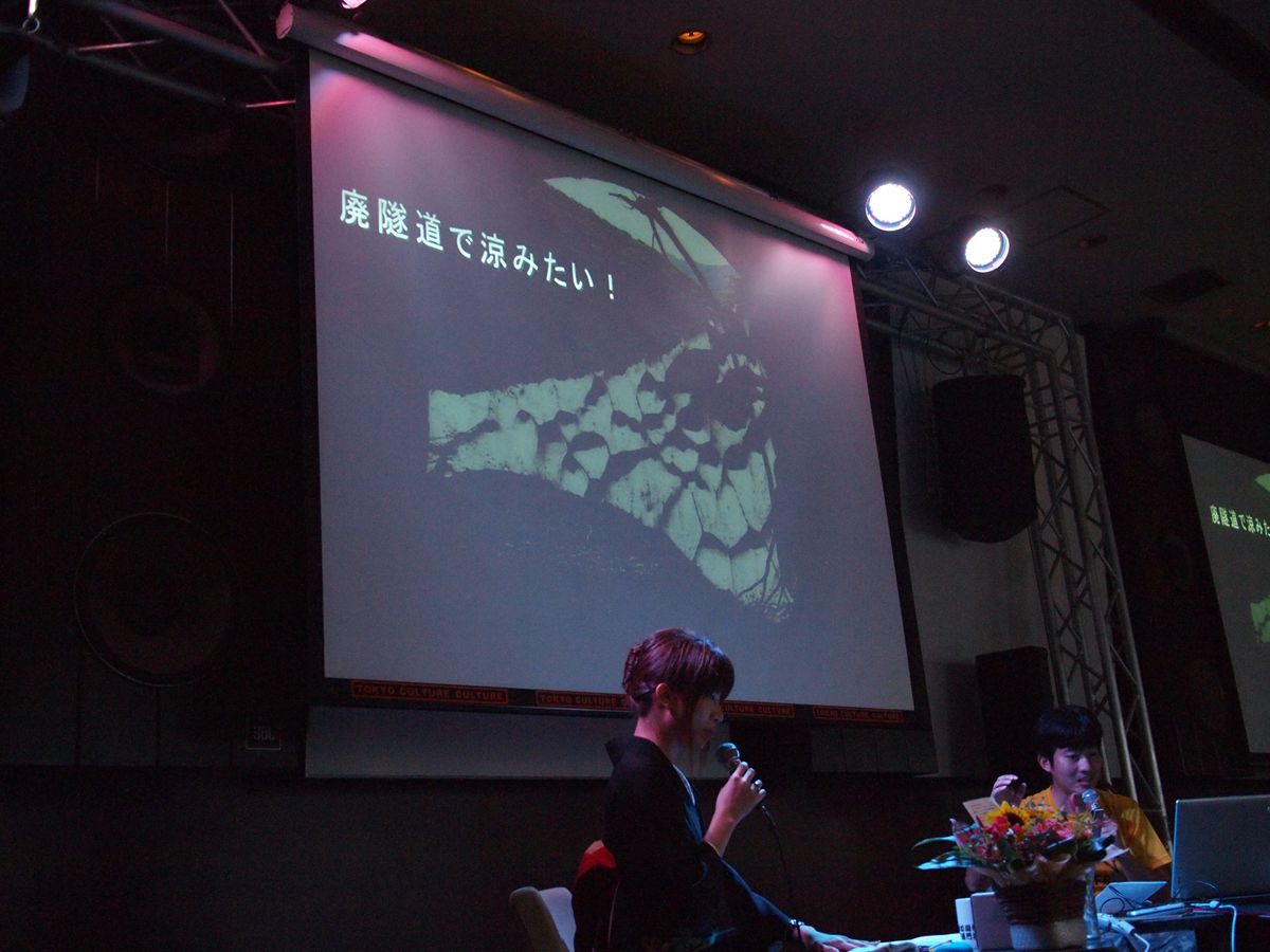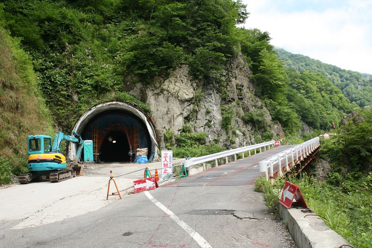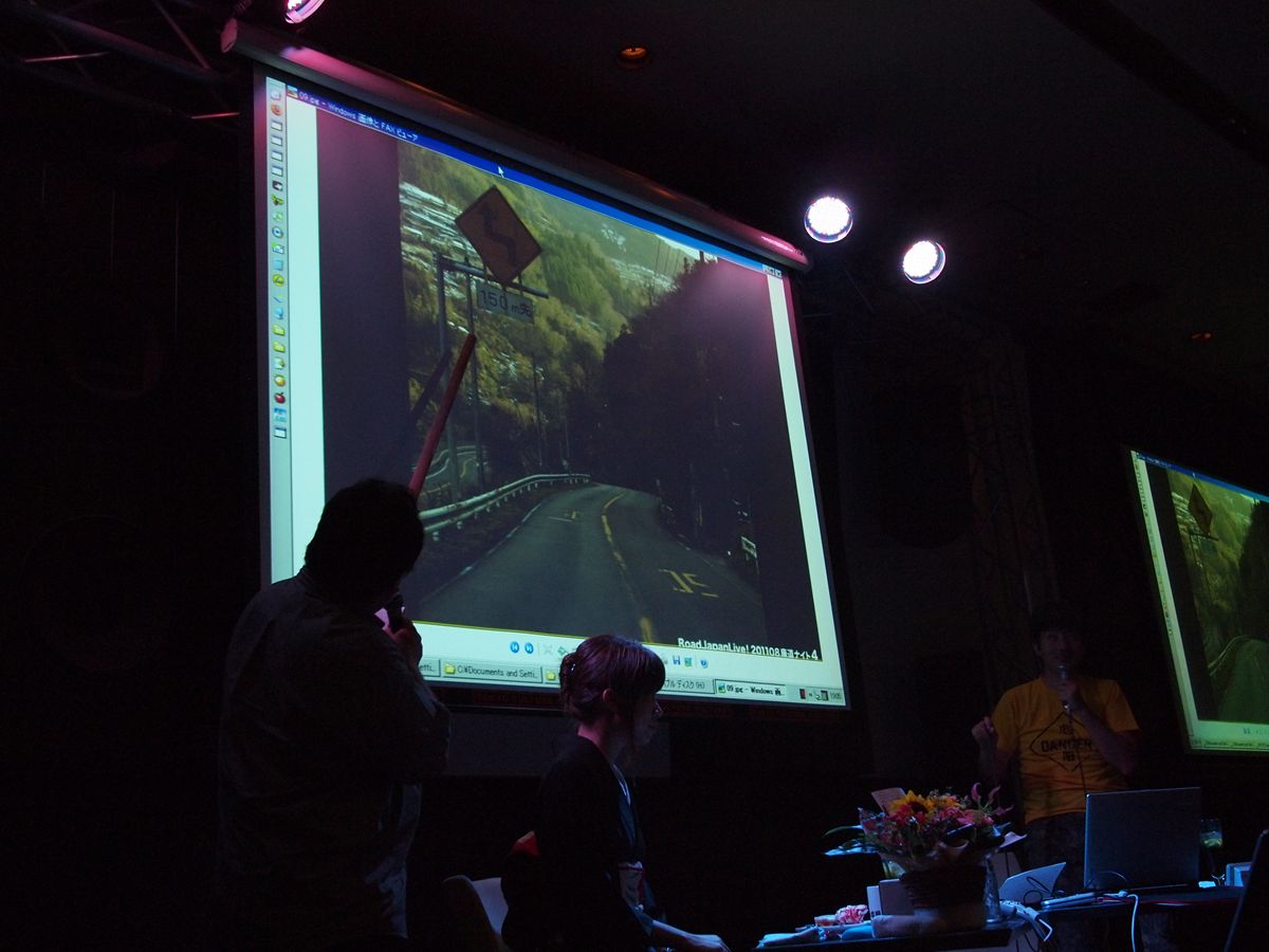 これは、有峰林道小見線のある隧道で、全線にわたって改良が進められている有峰林道の隧道群のうち、比較的最後まで残っているグループだ。現在は新道が開通しており、この坑門がどうなったのかはわからない。 有峰林道小見線は、地形図を見ればわかるとおり、とても興味深い道である。ニンニク隧道を含めて『日本の廃道』43号(2009年11月号)にレポートしたので、ぜひご覧いただきたい。→購入(私にお金が入るわけではありません^^) 私が訪れたのは2009年7月。幅員の狭さゆえに片側交互通行であるこの狭小の隧道区間を改善すべく、新隧道の工事中だった。別に旧道に入ることにためらいを感じるような状況でもないのだが、監視員がいるために控えておいた。その秋、この近くで大規模な崩壊が起き、翌2010年は通行止めが続いていたような気がする(←まったくのうろおぼえ)。 新隧道はこんな状態だった。 新隧道の開通は、今年(2011年)の6月1日。富山県のサイトに開通式についてのPDFが残っている。 ついでに、ニンニク雪害ガード。 過去のイベントレポートはこちらに。 廃道ナイト!(メインはORJにて<PDF>) 廃道ナイト2 廃道ナイト3!!! 今回は、チケット発売が確か7月15日。しかし、18日にはチケットが完売していたと思う。カルカルで開催された過去3回はすべてチケット完売だったが、この早さは過去最速。異常。早すぎてチケット取れなかった方が、私の友人たちにも何人もいた。ざんねん! ざんねんさん!(後述) 18時、まだ外が明るいうちに、スタート! まずはヨッキさん入場、第1回と同様、自転車にて! 本当は、横山店長から「客席を突き抜けて厨房(舞台に向かって左端)に突っ込んで折り返してこようか」という提案があったらしい。 続いて、トリさんの入場。 クルマでしか隧道に入ったことがない人は、ピンとこないかもしれない。隧道は、寒いのだ。とくに峠を抜ける隧道は、あちらとこちらで気温差も標高差もあるために風の通路になっており、気温が低いだけでなく風により体感温度も下がる。 今回、ミリンダ細田氏と、まずは現役の国道隧道で調査し、廃線跡の廃隧道で調査し、道路の閉塞廃隧道にたまった水の温度を調査し、最後に仙岩トンネルを調査した。その驚くべき考察。 普通に考えると、隧道の中央部がもっとも気温が低くなりそうな気がする。しかし、そうではなく、偏りがある。また、坑口近くでは、気温の下がり方が急激である。こうしてグラフだけを見るとなんてことないけれど、なんという「疑問力」と「考察力」だろう。これこそヨッキれんさんの真骨頂。 続いて好例の『道路ファンが選ぶ残念&粋な風景』。「ふれあい橋」やら道路にある看板やらの「残念」なものに注目していくもので、事前に募集がかけられていた。いくつか発表された中から、かいわれ氏のものを。 なお、帰宅後検索すると、「残念さん」は、幕末には一般名詞化していたようだ。参考→残念さん 続いて。 ところがトリさんが地元の人に話を聞くと「坑門が延長されて落雪の被害もなくなってよかった」というような反応が来たそうだ。鑑賞者と実用者(ただし、この発言は地元の人ではあるが、ぺらぺら話したがりの人らしい)との意識の差が出た一瞬。 第3幕は、noganaさんによる発表。 次は「粋な動画」。 バアアーーーン! なんかすごいの来たよ! 栗子隧道が現役だ! 当然、路面はダート。いまでもダートだしな。この程度の旧曲線でもバスやトラックをフレームに収め切れていない。これが撮影された昭和30年代前半(たぶん)の機材の事情もわかろうというもの。 この動画で現役当時の姿を店ながら、その合間に現在の姿の画像を挟む。とてもわかりやすい、興味深い動画だった。なお、このフィルムでも、すでに山形側坑口は改修されて直線状になっており、初代坑口は「廃」として採り上げられていた。 次は「夏のオブローダー自由発表」と題して「連番名称の愉しみ」。 なお、鉄道では、おそらく山田線の閉伊川橋梁が「第三十四」まであり、最多ではなかろうか。そして、その第三十四閉伊川橋梁は、東日本大震災による津波で流失している。 いくつか例が出たのだが、これはちょっと残念な例。 ここで第一部終了。の前に、トリさんが作ったグッズの紹介。これでまた、物販コーナーもおおいそがしに。 第2部は、『熱中スタジアム』に出演したトリさんに聞く裏話。15分ほどの番組だったが、5日もロケをしたとか。トリさんは身軽にひょいひょいと廃道をあるき、道がない場所にも踏み込もうとすると、スタッフから「カメラがあるから無理…」(もしかしたら、安全への配慮かも)と言われて行けなかった場所がある等、こうした場ならではの裏話。 続いてあづさ2号さんのレポ。 そして、いよいよ廃道ナイトのメインイベント、後述レポート。だ。 いつも通り(?)時間もオーバーし、なごやかにラスト。『トリの隧道連想クイズ』 第1問は、とても簡単。三島通庸の写真や地図が3つ表示され、答え