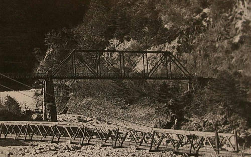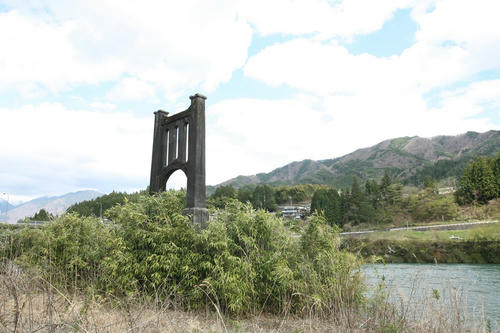 野尻森林鉄道 Iビーム桁橋(長野県)の続き。 現在、上記地図の中心点には「野尻向橋」がかかっている。下記写真で手前に見えている橋だ。 その橋に立つと、すぐ近く怪しげな痕跡が見える。 いかにもここに橋がありました、という感じ。周囲は少し盛り土してあり、ここがT字路になっていた。対岸には、この橋跡と対になるような痕跡と、その左側に吊橋の主塔が見えた。 となると、親柱が残っているのは旧橋、主塔が残っているのはさらにその旧橋ということになろうか。旧橋の橋台の左側には、川に降りる階段のようなものが見える。 対岸に渡る。 床版と橋脚の隙間が吹き抜けになって折らず、シェルターのようになっている。 古い航空写真で確かめた。青い矢印は野尻森林鉄道の木曽川橋梁。 1977年となると、すでに吊橋ではない。いまは撤去された橋に移行している。 その吊橋の現役時代の姿が、やはり『写真で見る100年』にあった。 旧橋を建設中? この旧旧橋の主塔がコンクリート製であるということは、その建設はせいぜい大正時代に入ってからではないかと思うのだが、大正10年には早くも旧橋に架け替えに着手するというのはちょっと考えがたい。 となると、見えているのは建設中の橋ではなく、単に桟橋に荷物が積み上がっているだけではないか? 旧橋は、その桟橋状のものを転用して架けられたのではないか。 階段が湖底に続いているようにも見えるが、なぜかこの階段は、現在残っているものよりも角度が相当にゆるい。現在残る階段が何のためのものなのかは不詳である。
