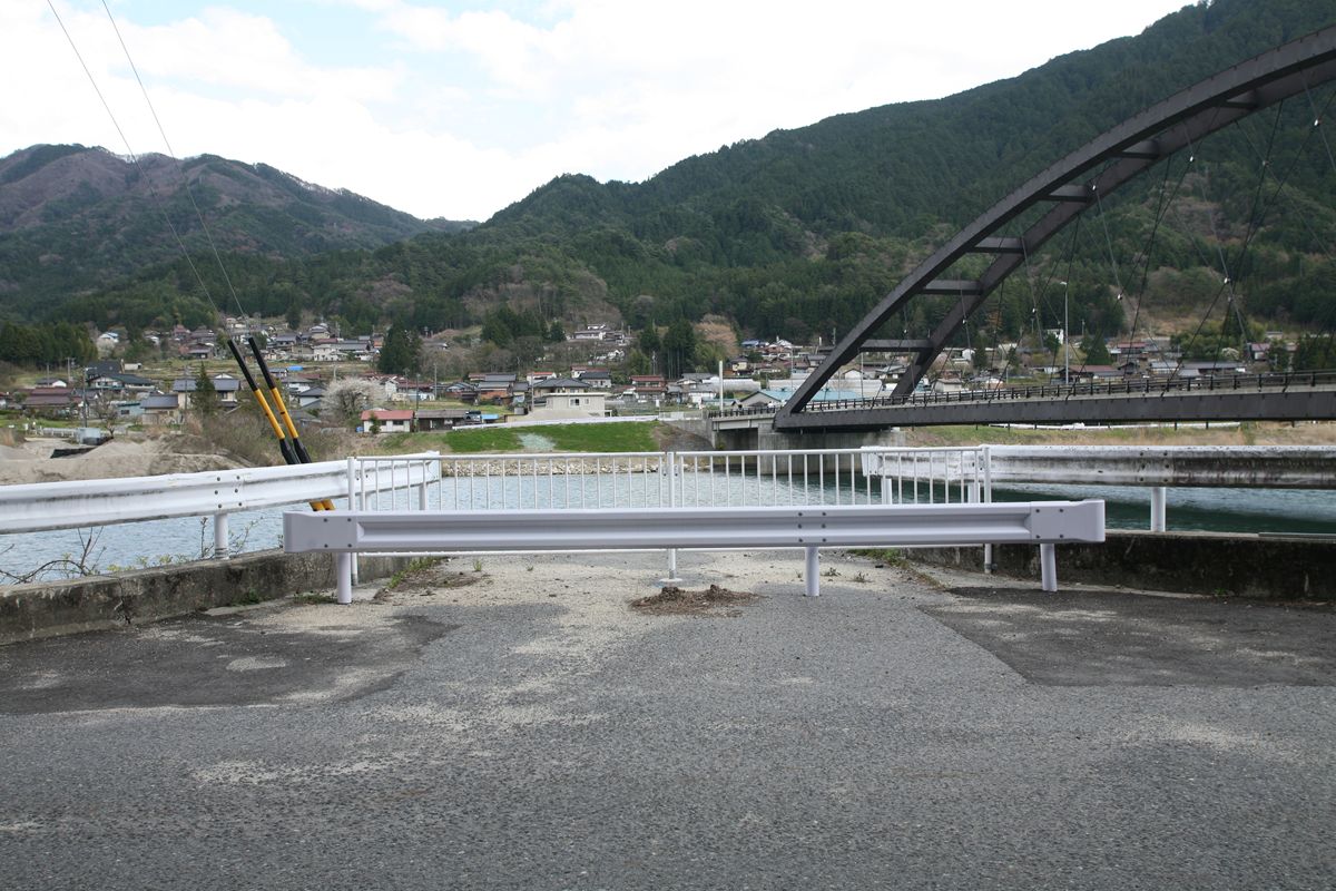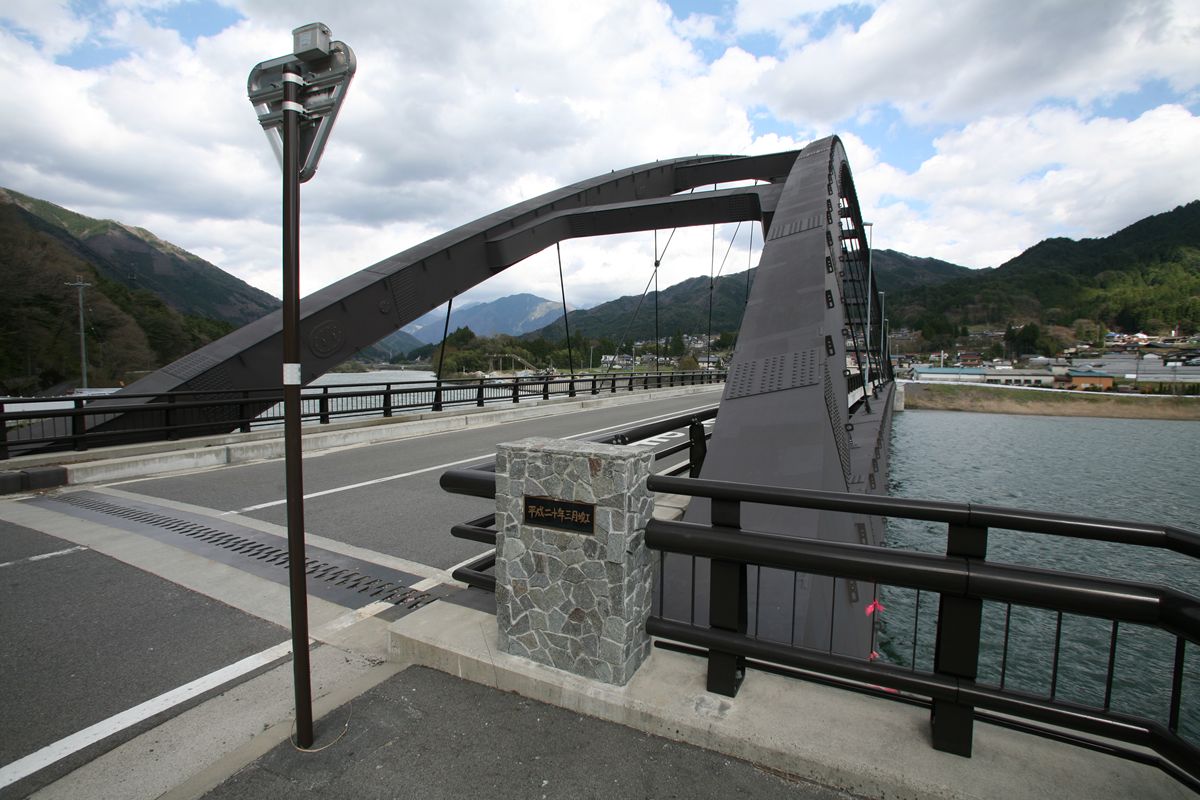 下記動画もあわせてご覧いただきたい。 1分08秒付近で、一番星とジョナサンが、赤いプラットトラスを渡る、その橋だ。「阿寺渓谷」と書いてある橋で推測した場所に架かっている橋であることをつきとめた。 この成果は、全面的にtyafficさん(@fusamofuさん)に依る。前掲記事に対して当時何度かやりとりし、そして最近、映画と同アングルでランガー桁が架かっている画像を教えてくださった(こちらのページ)。背景の山の感じがそっくりなのである。そして、そこに大きなヒントがあった。『写真で見る大桑町100年史』云々。 その本が、現地から少し離れた須原地区の大桑村スポーツ公園内にある大桑村歴史民俗資料館にある、ということを、やはりtyafficさんからうかがったので、行ってみた。ありましたよ。。。 後日、このプラットトラスは道路橋に転用される。阿寺の森林鉄道の終焉が昭和40年(1965年)というから、転用されたのはほぼそれと同時期と見ていいだろう。 このプラットトラスの規格はわからないが、木曽森林鉄道の鬼淵橋梁がTL-14すなわち14t制限。後日紹介する野尻森林鉄道の木曾川橋梁が10t機2両分。ということで、一番星号(11t車)とジョナサン号(4t車)が通過する分にはOK。 そして、いつまでこのプラットトラスが使われたかというと、隣接してランガー桁「阿寺川橋」が竣工したのが平成5年(1993年)11月。ここから遠からず、プラットトラスは撤去されたに違いない。また、吊橋は昭和35年(1960年)に2連のワーレントラスに置き換えられたあと、平成20年竣工のニールセン・ローゼ桁「阿寺橋」となっている。 この、昭和35年のものが、いまでもYahoo!地図の衛星画像にある。 現在の姿。 ●阿寺川橋(ランガー桁)