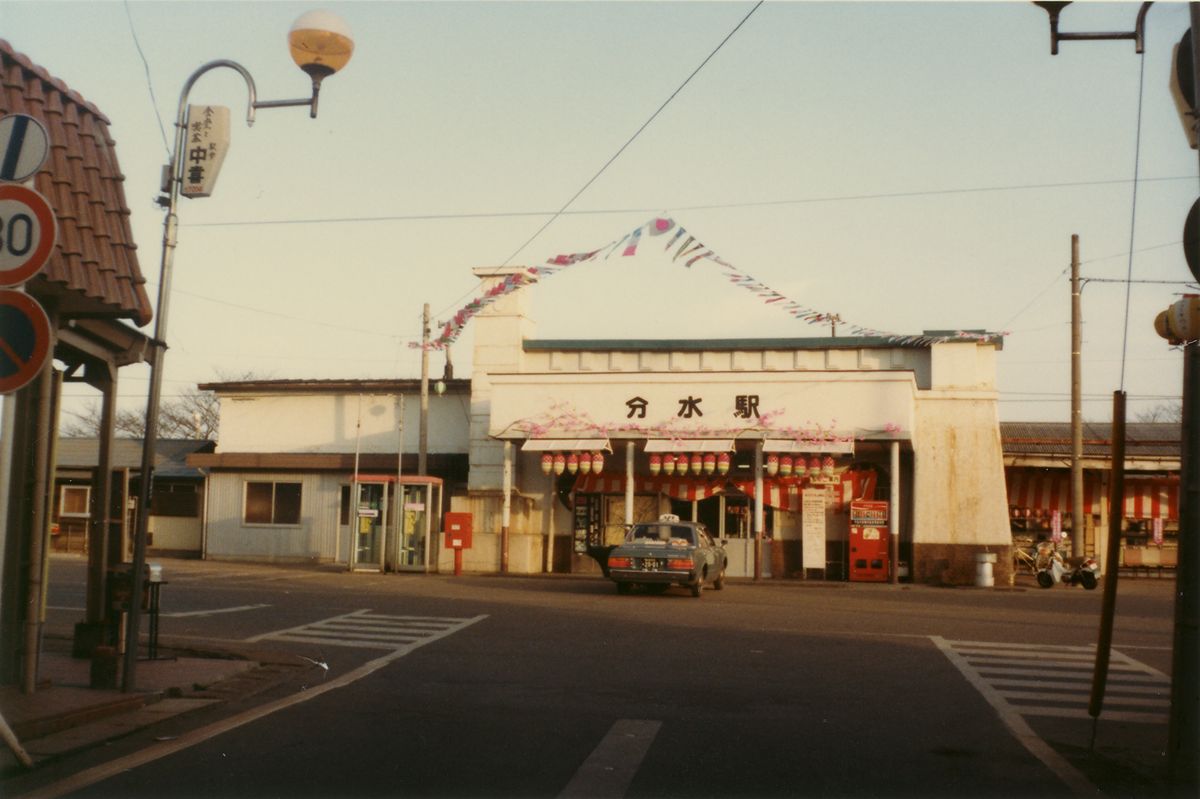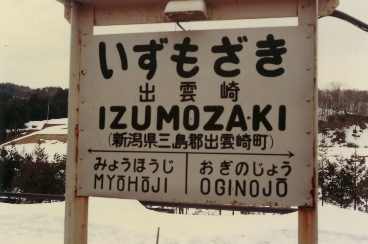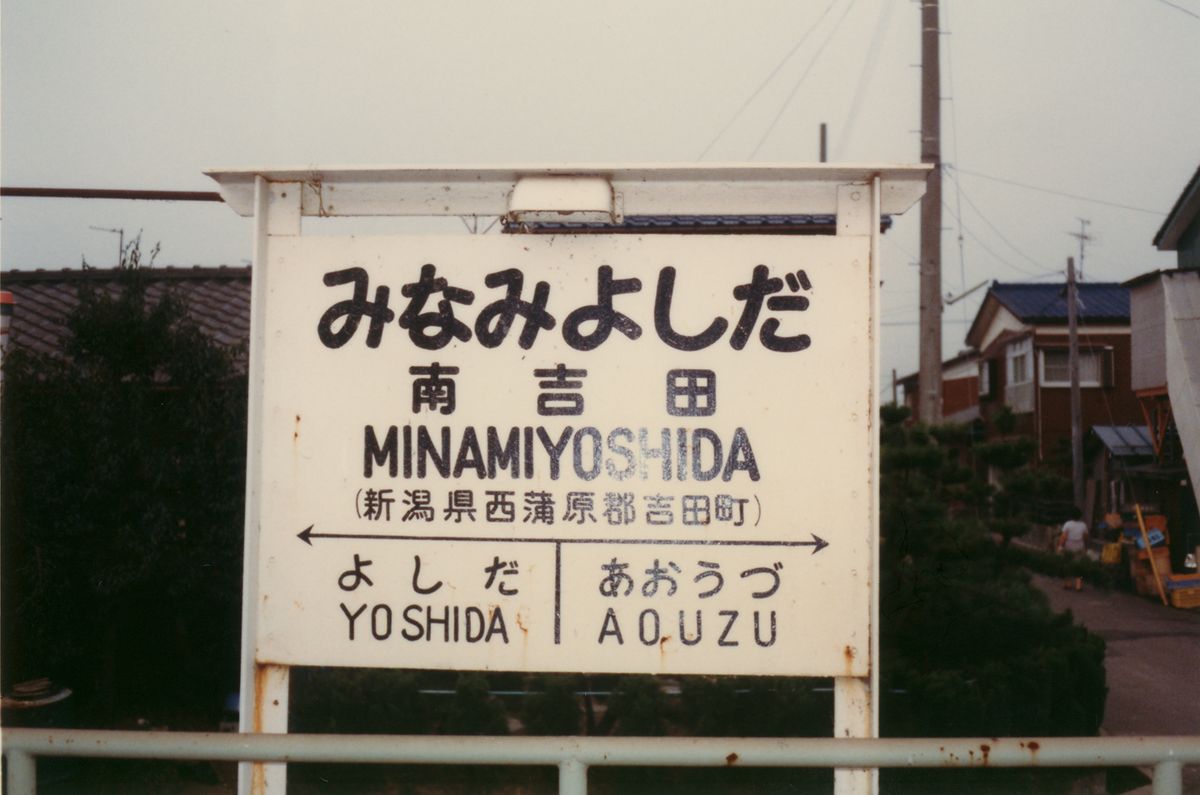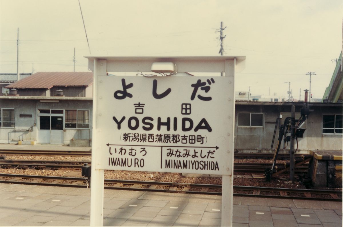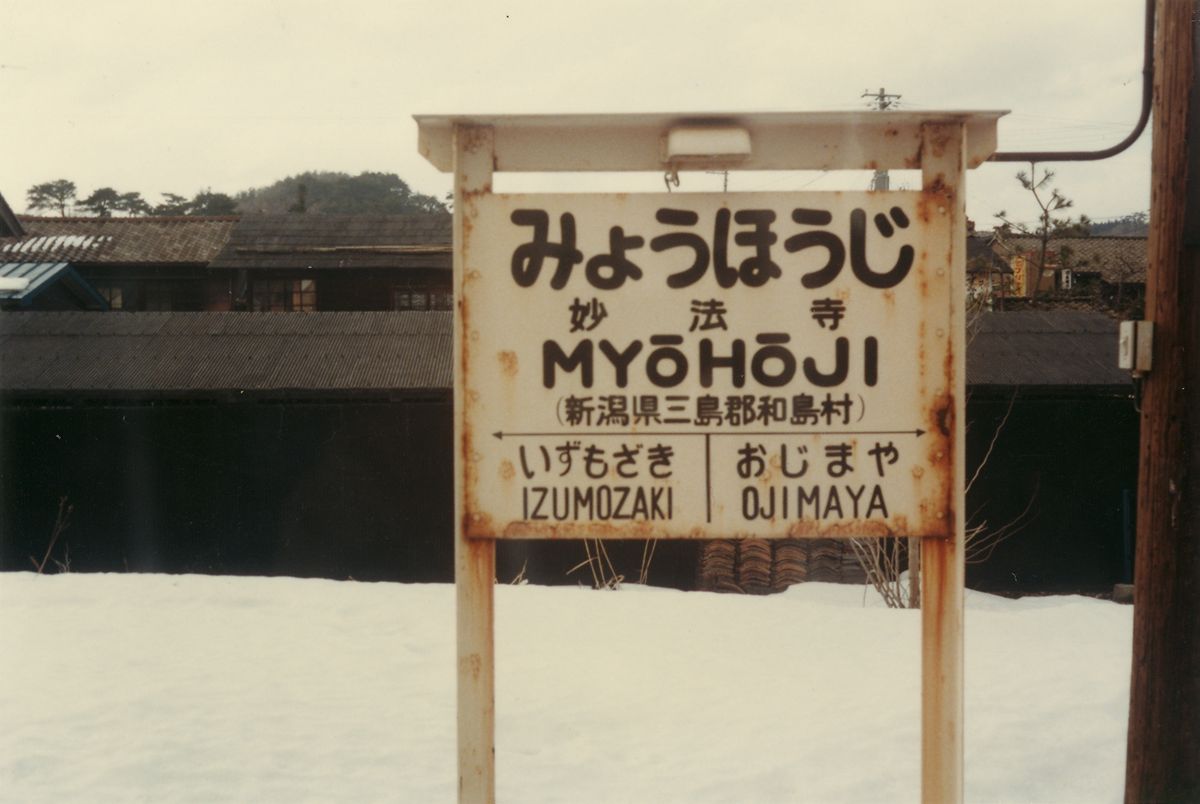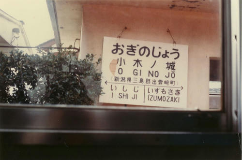 ●南吉田駅 ●粟生津駅 「AÔZU」 と、「おう」が長音になる! これを初めて見たとき驚いた。駅名標が好きだったので、ローマ字は読めたのだが、こう来るとは。 「う」の形が違うので、南吉田とは異なる筆跡である。 ●地蔵堂駅(現:分水駅) そして AÔZU! ÔKÔZU! 古レールでできた駅名標に5つも長音記号がある。 ●分水駅(改称) この時代はまだ手書きであるのがよくわかる。前日には駅名標は書き換えられており、上に「じぞうどう」と書いた張り紙がしてあった。 ●大河津駅(現:寺泊駅) 鳥居自害は古レール型。 ●桐原駅 この鳥居いは照明がない。 ●小島谷駅 漢字表記の「谷」だけ、ちょっと書き直したようにも見える。 偶然か、鳥居の形状も同系統。風格のサビ。 ●妙法寺駅 「桐原」と同系統。もっとも好きな系統。 ●出雲崎駅 ●小木ノ城駅 昭和50年代の駅名標(越後線)その3に続く。 PR 19歳まで新潟に住んでいた。そして母方の実家が柏崎だったため、日頃は急行「しらゆき」または「赤倉」をよく利用していた。「とがくし」は、利用時間が都合が悪かったのか、1回しか乗った記憶がなく、気動車急行が非冷房で窓全開だったのに対し、冷房が寒すぎた記憶がある。もちろん、自由席にしか乗ったことがない。 昭和55年、なぜかは知らないが、越後線で行った。急行なら柏崎まで1時間半のところ、越後線の各停は3時間かかる。吉田を過ぎると子供心にエキゾチックな駅名が続き、興味をそそられた。その時の写真が、上のキハ55である。これは母がカメラを持っていて(ミノルチナSという)、母が撮った。 それから少し経って、ミノルチナが壊れた。シャッターが下りなくなった気がする。もともと写真など撮る家ではなかったので、私がへたくそな小学生らしい写真を撮るために、お年玉でミノルタハイマチックSというカメラを買った。それで駅名標を撮った。間違いなく、種村直樹『鈍行列車の旅』巻末の、森嶋孝司さんの824列車全駅名標撮影、が大きく影響している。そのため「鳥居型」に絞って撮った。 総じて、越後線の鳥居型駅名標には木製ので鳥居型に組んだものはなく、すべて鉄製であったと思う。L字型のアングルか、古レールを組み合わせていた。興味深いのは書体である。すべて手書きであるため、個人のクセが出ている。文字にも、矢印にも、罫線にもクセが出る。そのおかげで、同じ人が書いたと推測できる複数の駅名標がある。そうした観点で見て行く。 なお、定型は、 ひらがな
