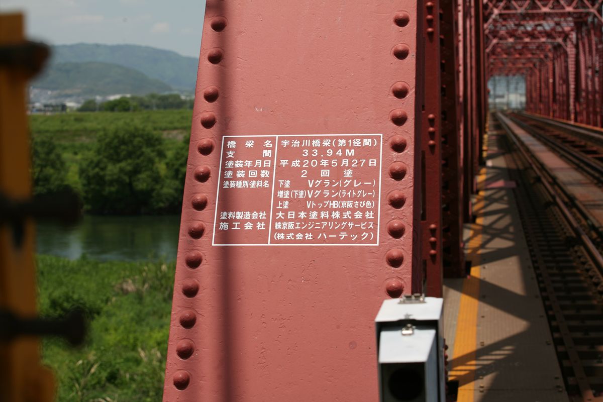支間:33.94M 塗装年月日:平成20年5月27日 塗装回数:2回塗 塗装種別・塗料名:下塗 Vグラン(グレー) 増塗(下塗) Vグラン(グレー) 上塗 VトップHB(京阪さび色) 塗料製造会社:大日本塗料株式会社 施工会社:(株)京阪エンジニアリングサービス (株式会社ハーテック) ここで支間がわかる。また、塗装の色が「京阪さび色」という名称であることもわかる。 ではその支承へ。 また、塗装がきちんと塗り分けられているのが興味深い。そして、トラスがリベット結合であるのに対し、支承はボルトが多用されているので、後年の補修とわかる。 やはりボルトが使われている。向かって右に所在なげに立っているボルトは、かつての支承を支えたボルトだろうか。 京阪電気鉄道株式会社