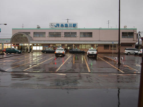 概要は地図をご覧いただきたい。 より大きな地図で 神戸水道 を表示 福知山線の旧ルートにある分格トラス、第二武庫川橋梁を見に行ったとき、偶然、この神戸水道の水道橋を目にして驚いた。ボーストリングトラス!?(この橋を便宜上「レポートの(1)」とする。冒頭地図の黄色アイコン)。 橋脚は石積み。この区間の建設工事は1914年(大正3年)以降である。なお、廃止となった福知山線(旧線)の開通は1899年(明治32年)。すでに稼働していた鉄道隧道の下に水路隧道を掘ったことになる。 ここは、写真に見えている隧道をくぐると第二武庫川橋梁にぶちあたるのだが、隧道は水路隧道と交差しており(鉄道が上)、鉄道隧道を抜けると水道橋のはるか向こうに行ってしまう。これ以上近づくには河原に降りるしかない(降りてる人はいた)。 実は両者を明確に分ける定義を私は知らない。両者は形態の差異による強度の違いでしかなく、荷重を負担する構造としては両者とも同じトラス構造である(と理解している)。 ボーストリングトラスだと考えてみた場合、その特徴(短所)である「橋門構を持たないので端部の強度が弱い」ということに外れる。橋門構はある。また曲弦プラットトラスだと考えた場合、あまりに扁平すぎないか(どこまでの扁平を許容するかは知らない)。端部の斜材は確実に45度以下だ。ワーレントラスでも45度程度が最小なのに。ここでは話を膨らませるためにボーストリングトラスということにして進める。 このあと、河原まで降りることはせずに第二武庫川橋梁まで往復し、停めておいたクルマをUターンさせようと武田尾駅に向かったそのとき、これが目に入った。 さて、冒頭の地図のとおり、ここで紹介した以外にも2ヶ所、このトラスが架かっているようだ。一つ目は水源地側、千苅ダムの西、川下川ダムの堰堤の手前。冒頭地図の水色アイコンの場所だ。 衛星写真で見ると、ちゃんとトラスが見える。川下川ダムは1977年(昭和52年)竣工なので、古い航空写真を見るとまだ造成中だったりする。水道橋は推定標高140m(等高線から)、ダム水面は標高164m、ダムの放水路はおそらく水道橋の10m以上下。 もう一ヶ所は福知山線宝塚駅-生瀬駅間で武庫川を渡る場所(冒頭地図の朱色のアイコン)。ここはストリートビューで見ることができる。 大きな地図で見る 上のストリートビューは右岸から。そして、水道橋で武庫川を渡ると、神戸水道は地中に潜っていくのがこのストリートビューでわかる。 その後、国土地理院の地形図を見る限り、何回か谷や川と交差するのであるが、水道橋で渡っている部分はなさそうである。おそらく地下を通っているものを考える。 廃線跡で偶然見つけた水道橋が、思いも寄らずに神戸市民の上水として由緒のあるものだったことは感慨深い。惜しむらくは、上記「レポートの(2)」の写真をもっと撮っておくべきだったことだ。大きな反省点だ。 いや、最大の反省点は「ボーストリングトラスと扁平な曲弦トラスの違いを言えない」ことだろう。この点について、ご存知の方はぜご教示いただきたく、お願い申し上げます。 先日、駅改築による駅前広場の出現というポストで、鉄道路線の高架化で駅舎が改築され、さまざまなものが失われたことの例を、小松駅、東舞鶴駅、西舞鶴駅について書いたが、ここ糸魚川駅もまたそうなる予定である。しかし、いまはまだ、駅が駅らしい存在感を持っている。率直に言って、その存在感に驚いた。糸魚川駅と言えば、駅裏(あえて「裏」という)にあった煉瓦造りの矩形機関庫が取り壊されたことが話題に上るが、私はそっちよりも表側に関心を持った。 1957年(昭和32年)に改築されたという現駅舎は、向かって左手、分度器みたいな屋根の下が待合室。その右、白飛びしている3枚のドアがコンコース。ドアを直進すると改札口だ。そこから右すべては運営側の施設。向かって左手にコンビニが続いているが、基本的には国鉄時代と変わらぬレイアウトだ。 待合室にはイスがたくさんあり、列車を待つ人がいる。地元らしい、長ズボンに黒いゴム長靴を履いたおじさんもいれば、時節柄(訪ねたのは12月29日)帰省客もいる。中学生や高校生もたむろしている。 駅というのは人が集まる場所である。いつまでいてもいいような、でも監視の目もある公共の場。そんな場所だから、鋳鋼製中高生が帰らずにだらだら話をしていても、とくに嫌な光景にはならない。一方、先日書いたような高架駅では人々がとりつく島がなく、監視の目もあってないがどときなので、非常に嫌な光景になる。そんな意味で、この糸魚川駅は昔ながらの構造が非常に好もしい空間を作り上げていた。 駅前に出た。真正面を見る。 駅前のタクシーはほどほど。こぢんまりしたタクシープールがちょうど駅の規模にあっているように見える。 左にカメラを振る。 駅前に書店があり、ホテルがあり、地元の旅行会社がある。それらが現役であることのうれしさ。さらに左には、アヤシゲ