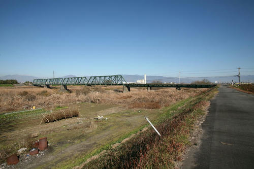 身延線は全線、富士身延鉄道が開通させたもので、この区間は最後の開通区間となる。市川大門から甲府間の開通を以て、現在の身延線が全通したのだ。身延以北は政府が建設するとの話もあったことからか、規格は国鉄(当時は鉄道院)のもので建設され、この笛吹川橋梁も、設計は鉄道院の規格のようである(『歴史的鋼橋集覧』にそのような推定がある)。 笛吹川は富士川の支流。山梨市駅真北の国師ヶ岳の東面に発し、国道140号秩父往還に沿って南下、石和で他の支流とあわさって甲府市外の南を西流し、この 笛吹川橋梁をくぐってしばらく行くと、長野・山梨県境に発して中央本線沿いに東南に流れる釜無川と合流する。釜無川は富士川の本流だが、地形図ではこの合 流地点から下流を富士川と表記している。 東京