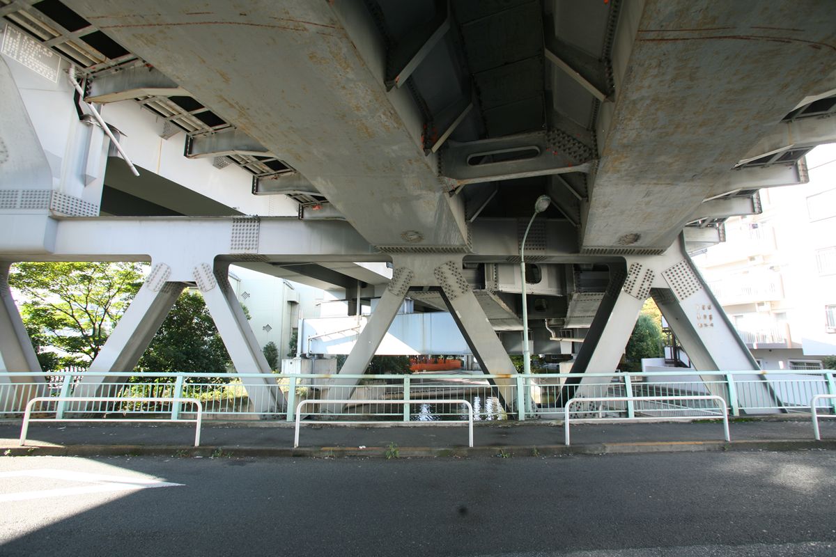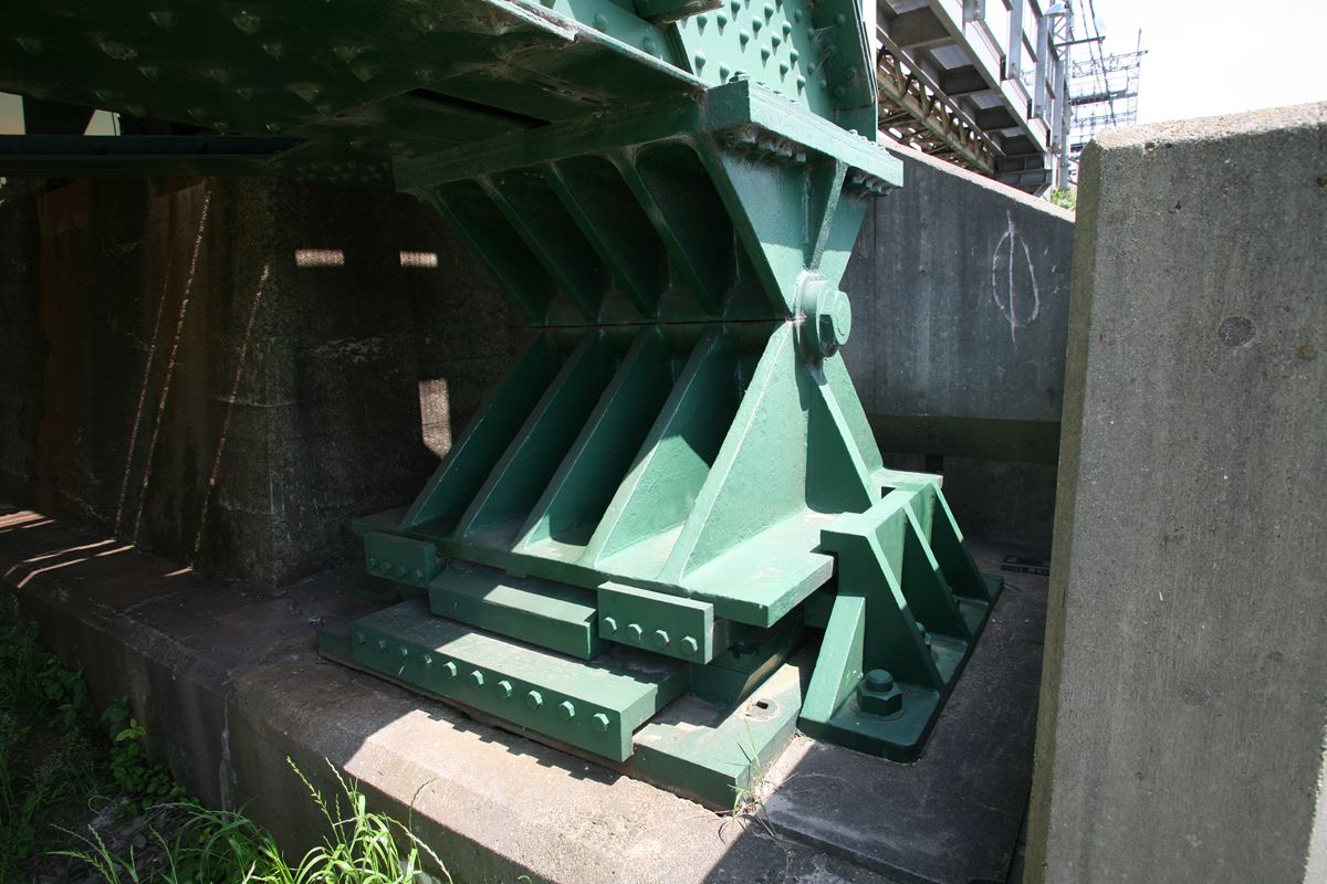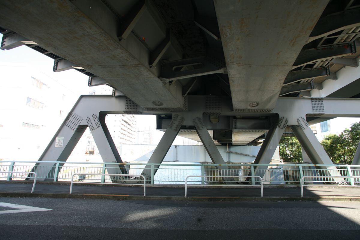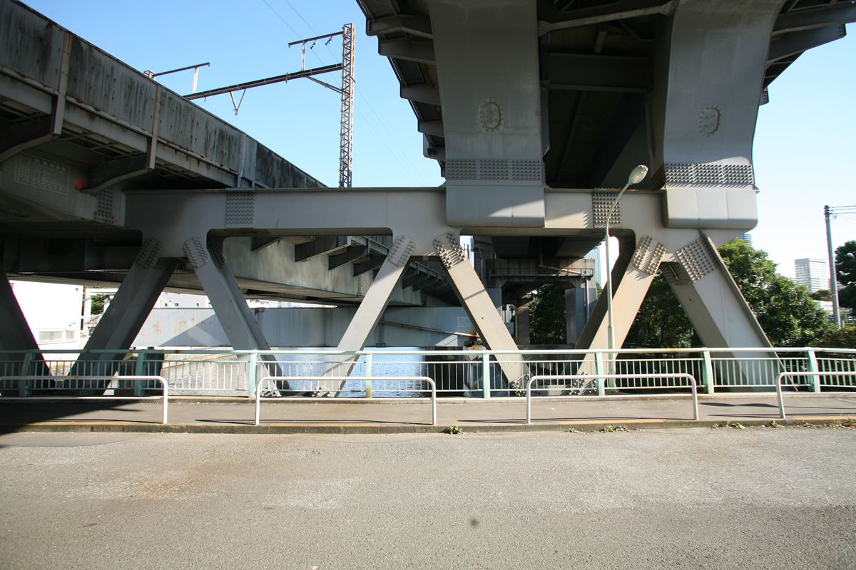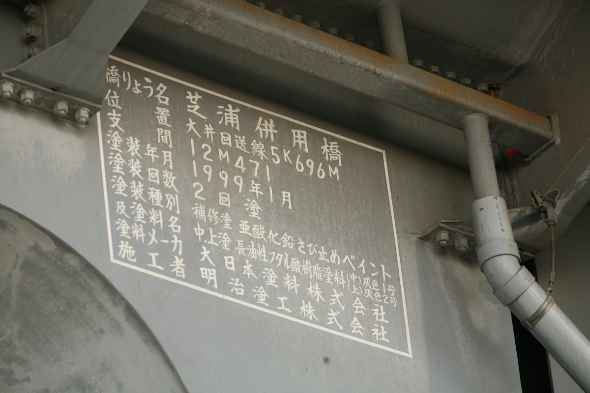 位置 元汐留-東京貨物(タ)3K847M84 支間 28M500 塗装年月 1991年6月 塗装回数 3回塗り 塗装種別及塗料名 下塗 シアナミド鉛さび止めペイント 中上塗 長油性フタル酸樹脂塗料 塗料メーカ 日本ペイント株式会社 施工者 建設塗装工業株式会社 1991年の時点では、汐留駅はなくなっていたがこの路線は生きていた。それが標記に現れ「元汐留」となっているのだろうか。 銘板。 SS46 宮地鉄工所 東京工場 おお、宮地! なぜここで宮地なんだ。周辺の桁は全部横河橋梁なのに、なぜこのビームだけ異なるんだ。 そして、KS-18。新幹線の桁は、上記の通り、別に設けた橋脚に乗っかっているから考慮する必要がない、というわけだ。 以上、周辺情報。 タグを一つしかつけられないのがもどかしい橋。高浜西運河にかかる道路橋の「芝浦橋」、その上にかかるのが東海道新幹線大井回送線の「芝浦併用橋」(手前)と休止状態の貨物線「芝浦併用橋」(奥)だ。 ここで「併用橋?」と思った方はするどい。(鉄道・道路)併用橋とは、鉄道と道路がともに同じ桁を走行する橋である。有名なものでは東京の勝鬨橋(都電)、愛知の犬山橋(名鉄)、岐阜の忠節橋(名鉄、右写真、 GNU Free Documentation License )がある(どれも鉄道は既に走っていない)。この橋は、道路部分と鉄道部分が同じ面に乗っているわけではないのに、「併用橋」と名付けられている。つまり、ひとつの桁を、道路と鉄道が供用しているということが名称からわかるわけで、分類としてはそうなるわけだ。また、この芝浦橋を見た人は、関西本線第四大和川橋梁(大阪府)を連想するに違いない。こういう橋だ。ここに見えるトラスは「桁受トラス」と呼ばれ、通常は鋼製の箱を渡してビームとするのだが、ここではどうしたわけか、トラスがその代わりをしている。その理由が明記された文献にはいまだあたっていない。 さて、芝浦橋はここにある。東京都の海っぺり、運河にかかる橋だ。 より大きな地図で 芝浦橋 を表示 先に整理する。 道路橋の芝浦橋は、1970年5月、東京都港区建造。一等橋。 新幹線の芝浦併用橋は、1970年、日本国有鉄道。NP-18。1973年9月1日開通。 貨物線の芝浦併用橋は、1972年、日本国有鉄道。KSー18。1973年10月1日開通。現在休止中。 三橋とも、横河橋梁製だ。貨物線の桁のみ製造年が異なるが、設計は一体でやっていたと考えるのが自然だろう。 それ以前は、細い橋がかかるだけだったようだ。国土変遷アーカイブより転載。 どんどんディテールを見て行こう。 そもそも、この程度の長さの橋なら、一等橋(活荷重の基準の一つ)とはいえ、トラス橋にする必要などないだろう。単純な上路プレートガーダー橋で十分だと思う。それなのに、この橋の側面にトラスがあるのは、トラスがその上を横切る桁の橋脚の役割を果たすからだろう。 真横(西から東側のトラスを見る)から。 左側が貨物線の桁、右側が新幹線の橋脚。貨物線は、トラスを橋脚として使用し、新幹線は橋脚を介してトラスに接続している。また、貨物線に架線が張っていないのがわかるだろうか。 反対側(西側) これも横から(東から西側のトラスを見る) こちらから見ると、左が新幹線、道が貨物線。トラスへの乗っかかり方は変わらない。 寄ってみる。まずは新幹線の桁を支えるほう。 貨物線のほう。 橋の上から、公園が見えた(地図参照)。そこに行ってみると、このように西側が見える。 地図に示した公園から、支承を見る。 北側。 これらのすべてに銘板があるので、掲載する。 ●芝浦橋(道路橋) ●新幹線の桁 ●貨物線の桁 続いて塗装標記。 ●新幹線の桁
