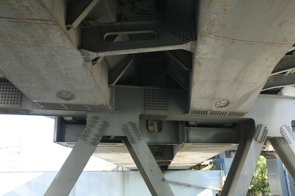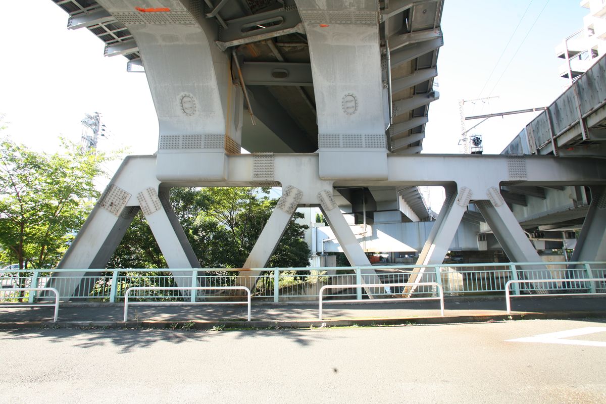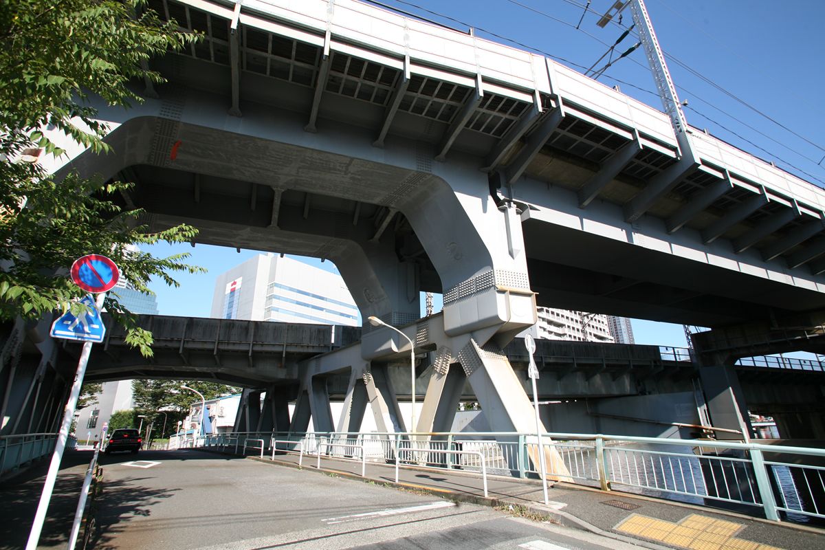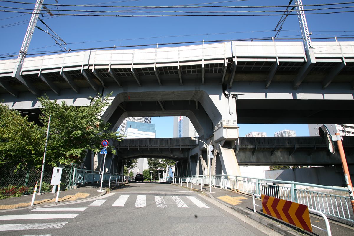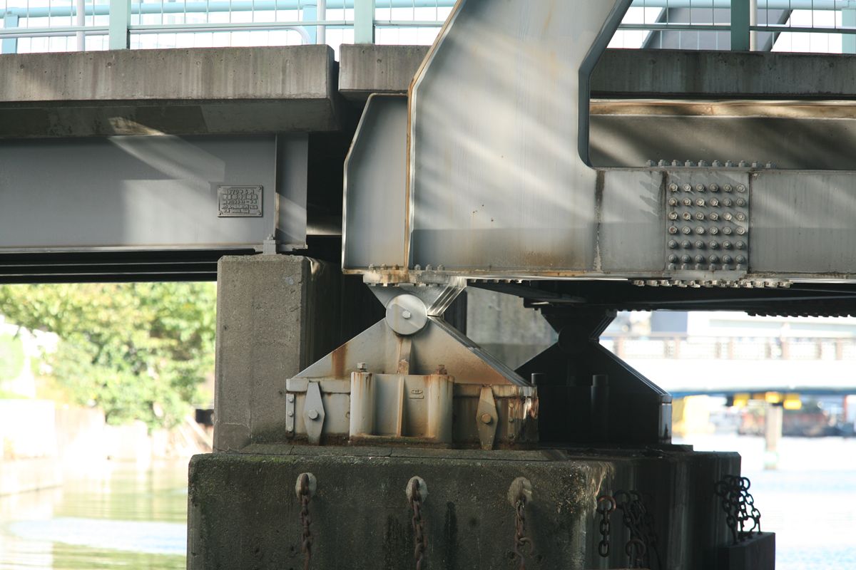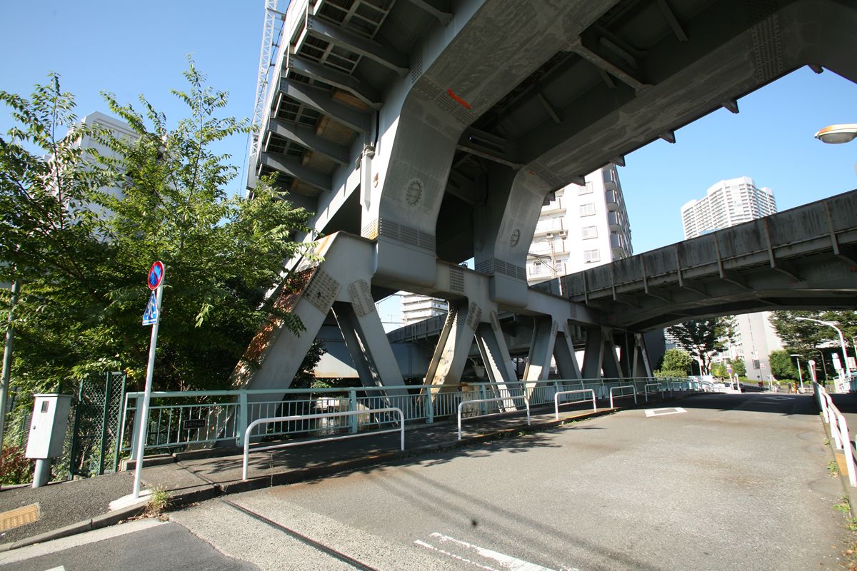 位置 元汐留-東京貨物(タ)3K847M84 支間 28M500 塗装年月 1991年6月 塗装回数 3回塗り 塗装種別及塗料名 下塗 シアナミド鉛さび止めペイント 中上塗 長油性フタル酸樹脂塗料 塗料メーカ 日本ペイント株式会社 施工者 建設塗装工業株式会社 1991年の時点では、汐留駅はなくなっていたがこの路線は生きていた。それが標記に現れ「元汐留」となっているのだろうか。 銘板。 SS46 宮地鉄工所 東京工場 おお、宮地! なぜここで宮地なんだ。周辺の桁は全部横河橋梁なのに、なぜこのビームだけ異なるんだ。 そして、KS-18。新幹線の桁は、上記の通り、別に設けた橋脚に乗っかっているから考慮する必要がない、というわけだ。 以上、周辺情報。 タグを一つしかつけられないのがもどかしい橋。高浜西運河にかかる道路橋の「芝浦橋」、その上にかかるのが東海道新幹線大井回送線の「芝浦併用橋」(手前)と休止状態の貨物線「芝浦併用橋」(奥)だ。 ここで「併用橋?」と思った方はするどい。(鉄道・道路)併用橋とは、鉄道と道路がともに同じ桁を走行する橋である。有名なものでは東京の勝鬨橋(都電)、愛知の犬山橋(名鉄)、岐阜の忠節橋(名鉄、右写真、 GNU Free Documentation License )がある(どれも鉄道は既に走っていない)。この橋は、道路部分と鉄道部分が同じ面に乗っているわけではないのに、「併用橋」と名付けられている。つまり、ひとつの桁を、道路と鉄道が供用しているということが名称からわかるわけで、分類としてはそうなるわけだ。また、この芝浦橋を見た人は、関西本線第四大和川橋梁(大阪府)を連想するに違いない。こういう橋だ。ここに見えるトラスは「桁受トラス」と呼ばれ、通常は鋼製の箱を渡してビームとするのだが、ここではどうしたわけか、トラスがその代わりをしている。その理由が明記された文献にはいまだあたっていない。 さて、芝浦橋はここにある。東京都の海っぺり、運河にかかる橋だ。 より大きな地図で 芝浦橋 を表示 先に整理する。 道路橋の芝浦橋は、1970年5月、東京都港区建造。一等橋。 新幹線の芝浦併用橋は、1970年、日本国有鉄道。NP-18。1973年9月1日開通。 貨物線の芝浦併用橋は、1972年、日本国有鉄道。KSー18。1973年10月1日開通。現在休止中。 三橋とも、横河橋梁製だ。貨物線の桁のみ製造年が異なるが、設計は一体でやっていたと考えるのが自然だろう。 それ以前は、細い橋がかかるだけだったようだ。国土変遷アーカイブより転載。 どんどんディテールを見て行こう。 そもそも、この程度の長さの橋なら、一等橋(活荷重の基準の一つ)とはいえ、トラス橋にする必要などないだろう。単純な上路プレートガーダー橋で十分だと思う。それなのに、この橋の側面にトラスがあるのは、トラスがその上を横切る桁の橋脚の役割を果たすからだろう。 真横(西から東側のトラスを見る)から。 左側が貨物線の桁、右側が新幹線の橋脚。貨物線は、トラスを橋脚として使用し、新幹線は橋脚を介してトラスに接続している。また、貨物線に架線が張っていないのがわかるだろうか。 反対側(西側) これも横から(東から西側のトラスを見る) こちらから見ると、左が新幹線、道が貨物線。トラスへの乗っかかり方は変わらない。 寄ってみる。まずは新幹線の桁を支えるほう。 貨物線のほう。 橋の上から、公園が見えた(地図参照)。そこに行ってみると、このように西側が見える。 地図に示した公園から、支承を見る。 北側。 これらのすべてに銘板があるので、掲載する。 ●芝浦橋(道路橋) ●新幹線の桁 ●貨物線の桁 続いて塗装標記。 ●新幹線の桁