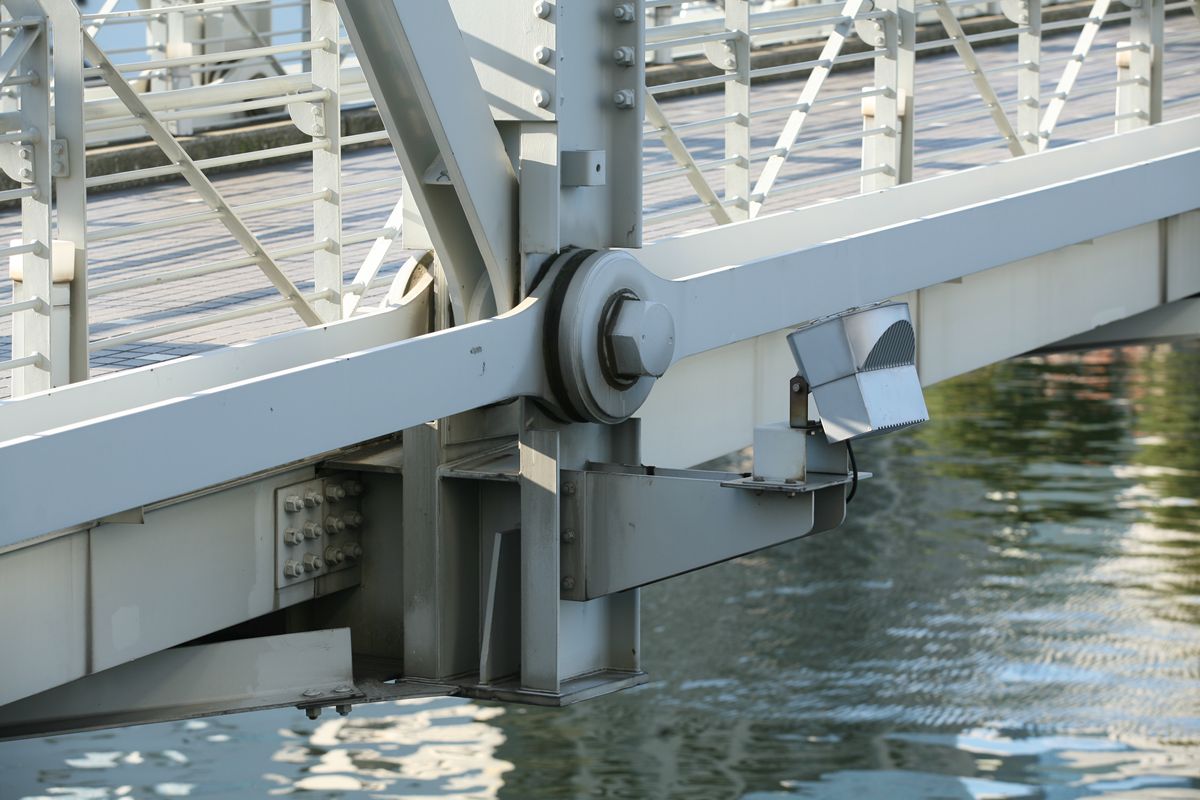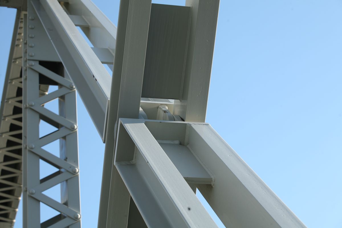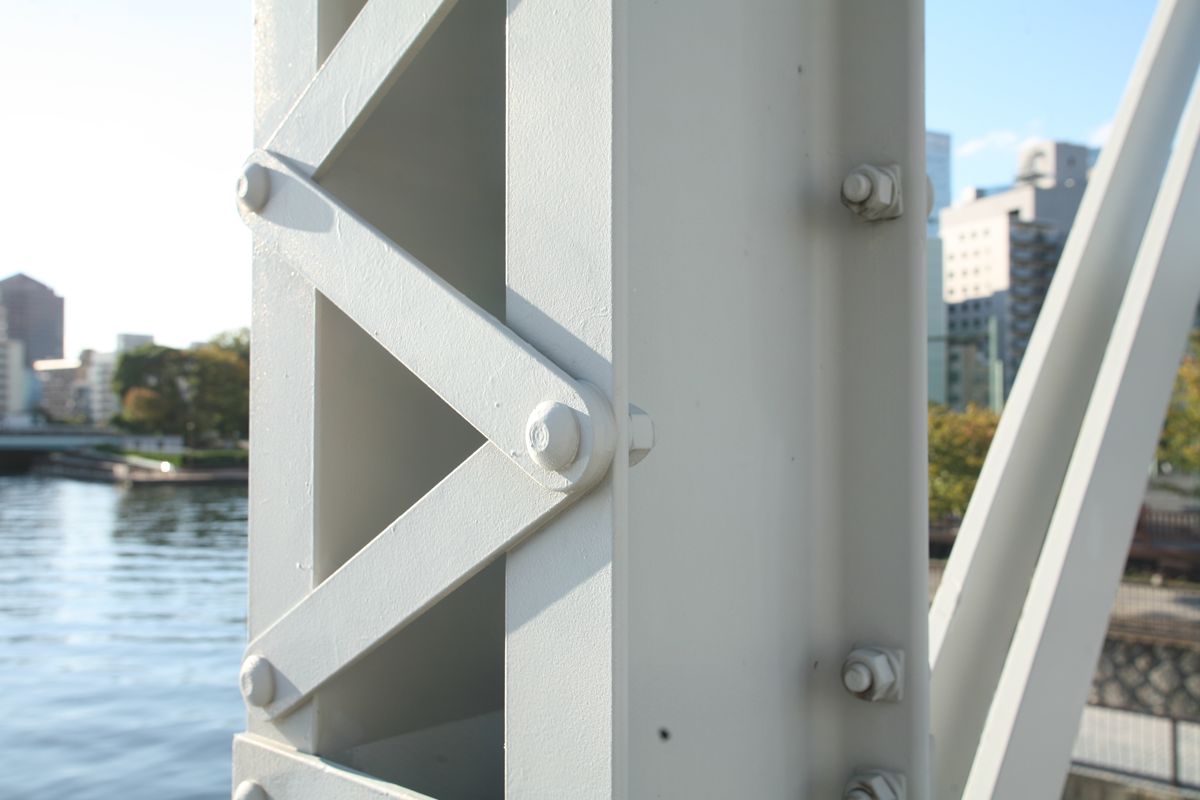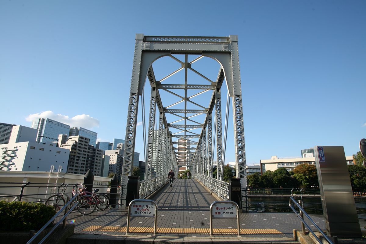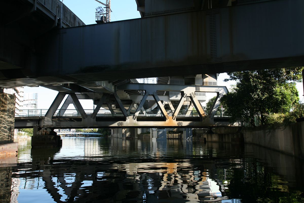 位置 元汐留-東京貨物(タ)3K847M84 支間 28M500 塗装年月 1991年6月 塗装回数 3回塗り 塗装種別及塗料名 下塗 シアナミド鉛さび止めペイント 中上塗 長油性フタル酸樹脂塗料 塗料メーカ 日本ペイント株式会社 施工者 建設塗装工業株式会社 1991年の時点では、汐留駅はなくなっていたがこの路線は生きていた。それが標記に現れ「元汐留」となっているのだろうか。 銘板。 SS46 宮地鉄工所 東京工場 おお、宮地! なぜここで宮地なんだ。周辺の桁は全部横河橋梁なのに、なぜこのビームだけ異なるんだ。 そして、KS-18。新幹線の桁は、上記の通り、別に設けた橋脚に乗っかっているから考慮する必要がない、というわけだ。 以上、周辺情報。 タグを一つしかつけられないのがもどかしい橋。高浜西運河にかかる道路橋の「芝浦橋」、その上にかかるのが東海道新幹線大井回送線の「芝浦併用橋」(手前)と休止状態の貨物線「芝浦併用橋」(奥)だ。 ここで「併用橋?」と思った方はするどい。(鉄道・道路)併用橋とは、鉄道と道路がともに同じ桁を走行する橋である。有名なものでは東京の勝鬨橋(都電)、愛知の犬山橋(名鉄)、岐阜の忠節橋(名鉄、右写真、 GNU Free Documentation License )がある(どれも鉄道は既に走っていない)。この橋は、道路部分と鉄道部分が同じ面に乗っているわけではないのに、「併用橋」と名付けられている。つまり、ひとつの桁を、道路と鉄道が供用しているということが名称からわかるわけで、分類としてはそうなるわけだ。また、この芝浦橋を見た人は、関西本線第四大和川橋梁(大阪府)を連想するに違いない。こういう橋だ。ここに見えるトラスは「桁受トラス」と呼ばれ、通常は鋼製の箱を渡してビームとするのだが、ここではどうしたわけか、トラスがその代わりをしている。その理由が明記された文献にはいまだあたっていない。 さて、芝浦橋はここにある。東京都の海っぺり、運河にかかる橋だ。 より大きな地図で 芝浦橋 を表示 先に整理する。 道路橋の芝浦橋は、1970年5月、東京都港区建造。一等橋。 新幹線の芝浦併用橋は、1970年、日本国有鉄道。NP-18。1973年9月1日開通。 貨物線の芝浦併用橋は、1972年、日本国有鉄道。KSー18。1973年10月1日開通。現在休止中。 三橋とも、横河橋梁製だ。貨物線の桁のみ製造年が異なるが、設計は一体でやっていたと考えるのが自然だろう。 それ以前は、細い橋がかかるだけだったようだ。国土変遷アーカイブより転載。 どんどんディテールを見て行こう。 そもそも、この程度の長さの橋なら、一等橋(活荷重の基準の一つ)とはいえ、トラス橋にする必要などないだろう。単純な上路プレートガーダー橋で十分だと思う。それなのに、この橋の側面にトラスがあるのは、トラスがその上を横切る桁の橋脚の役割を果たすからだろう。 真横(西から東側のトラスを見る)から。 左側が貨物線の桁、右側が新幹線の橋脚。貨物線は、トラスを橋脚として使用し、新幹線は橋脚を介してトラスに接続している。また、貨物線に架線が張っていないのがわかるだろうか。 反対側(西側) これも横から(東から西側のトラスを見る) こちらから見ると、左が新幹線、道が貨物線。トラスへの乗っかかり方は変わらない。 寄ってみる。まずは新幹線の桁を支えるほう。 貨物線のほう。 橋の上から、公園が見えた(地図参照)。そこに行ってみると、このように西側が見える。 地図に示した公園から、支承を見る。 北側。 これらのすべてに銘板があるので、掲載する。 ●芝浦橋(道路橋) ●新幹線の桁 ●貨物線の桁 続いて塗装標記。 ●新幹線の桁