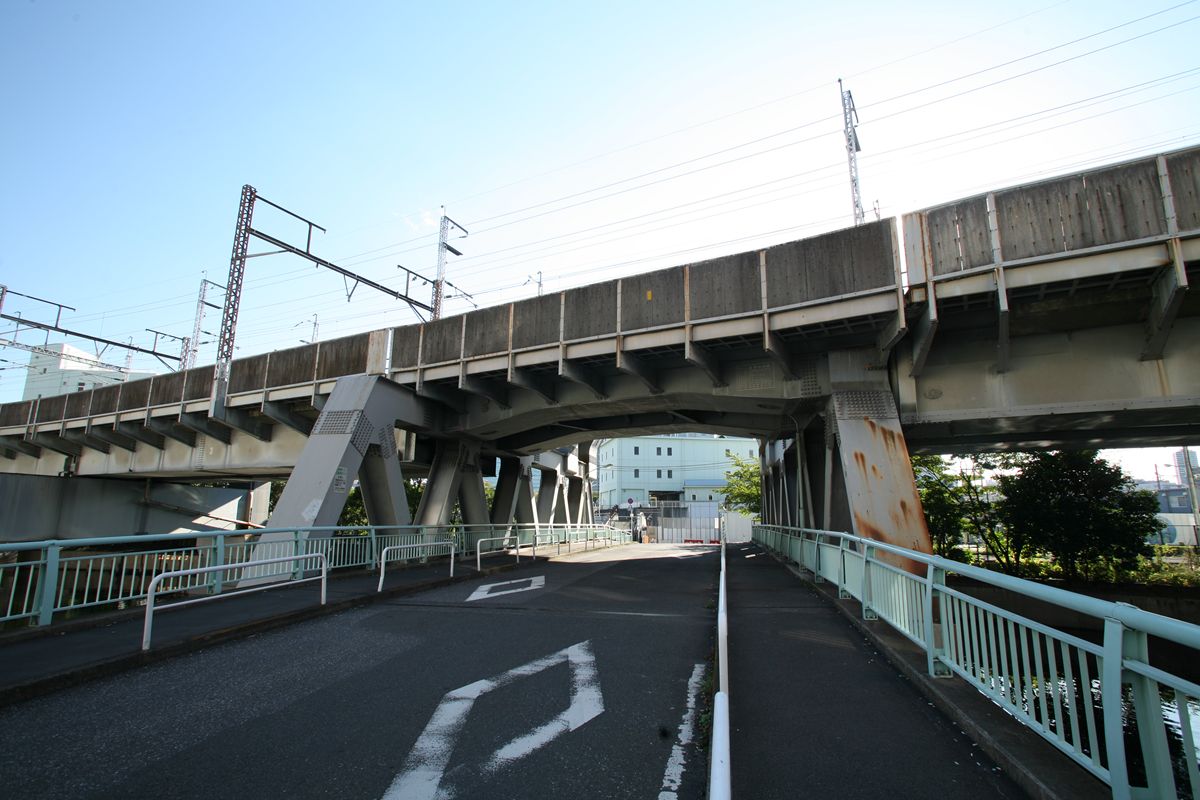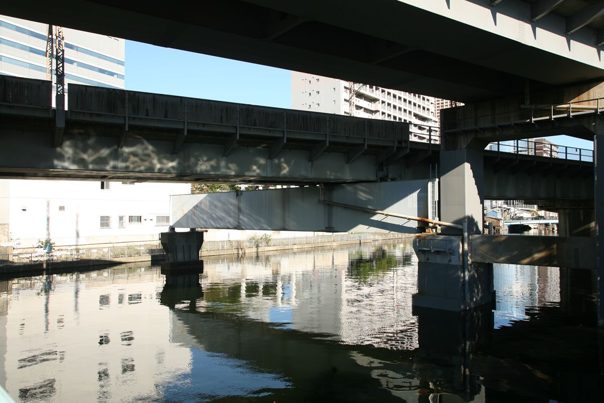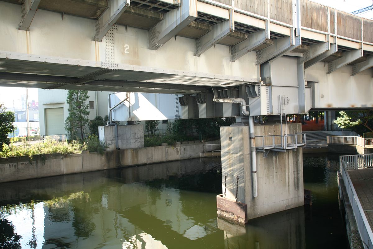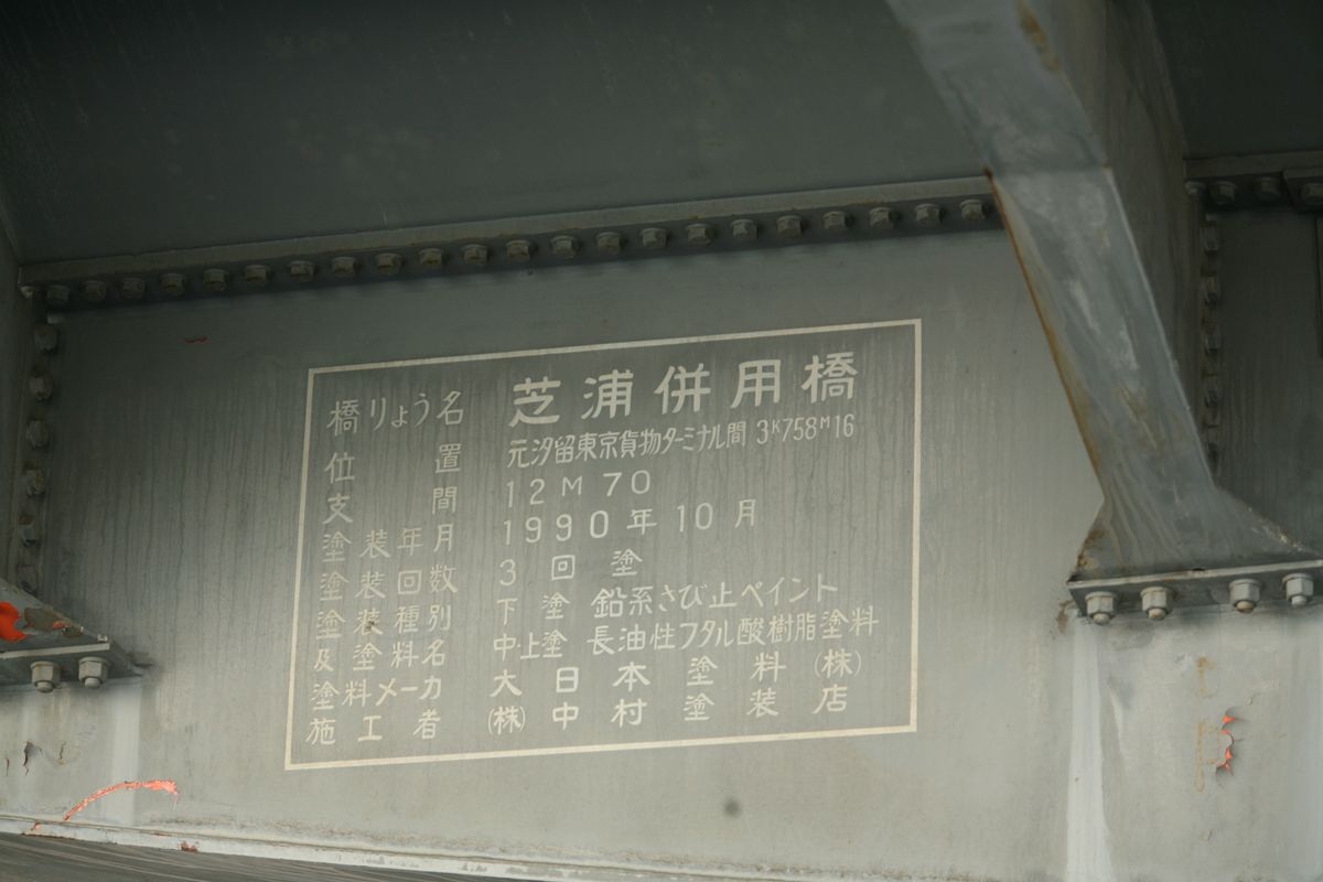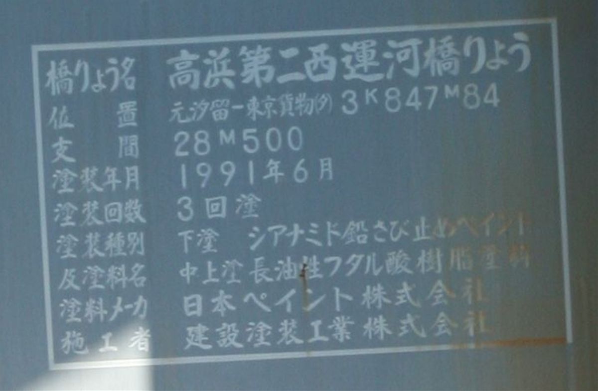 位置 大井回送線 5K696M 支間 12M471 塗装年月 1999年1月 塗装回数 2回塗 塗装種別及び塗料名 補修塗 亜酸化鉛さび止めペイント 中.上塗り 長油性フタル酸樹脂塗料(中)灰色1号 (上)灰色2号 塗料メーカ 大日本塗料株式会社 施工者 明治塗工株式会社 ●貨物線の桁 位置 元汐留東京貨物ターミナル間 3K758M16 支間 12M70 塗装年月 1990年10月 塗装回数 3回塗 塗装種別及塗料名 下塗 鉛系さび止めペイント 中・上塗 長油性フタル酸樹脂塗料 塗料メーカ 大日本塗料(株) 施工者 (株)中村塗装店 「元汐留」というのがなぜそうなったのか、知りたい。 とりあえずここまで。 この橋の紹介は『横河橋梁技報』創刊号(1972年1月号)に記載があるはずだ。いつか目にしてみたい。 参考サイト:『水路をゆく・第二運河』