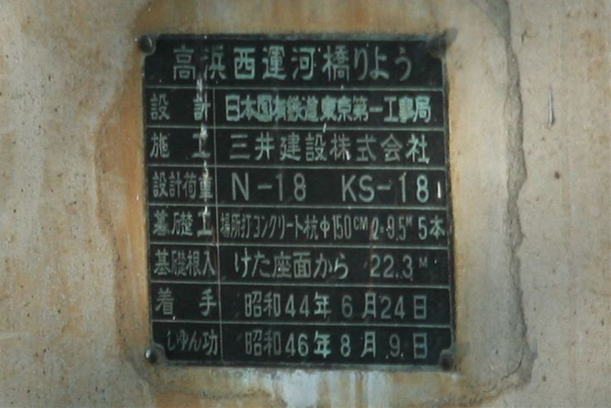 着手 昭和44年6月24日 しゅん工 昭和46年8月9日(注:1971年) そうか、橋脚にも活荷重があるのか。あたりまえといえばあたりまえだが、上に乗る桁の重量(RC製のほうが鋼製よりも重いはず)にも左右されるし、いまある桁の重量を前提に設計されているのだろうか。また、表記が、塗装標記や橋梁制作会社の表記と異なる点も興味深い。この当時から「橋りょう」だったのだな。 いや、それよりもN-18という標記に注目。N荷重だ。新幹線貨物を想定した、車体長13.5mの活荷重だ。ということは、1970年代まで、新幹線貨物は、土木構造物において、一応は想定されていたのだ。状況証拠から、思わぬことを発見してしまったのでフォントを赤くしてしまった。KS-18標記は在来線の活荷重であるから、この橋脚は、新幹線(貨物)と在来線のふたつを想定していることがわかる。 ●東側のビーム 橋りょう名 高浜第二西運河橋りょう