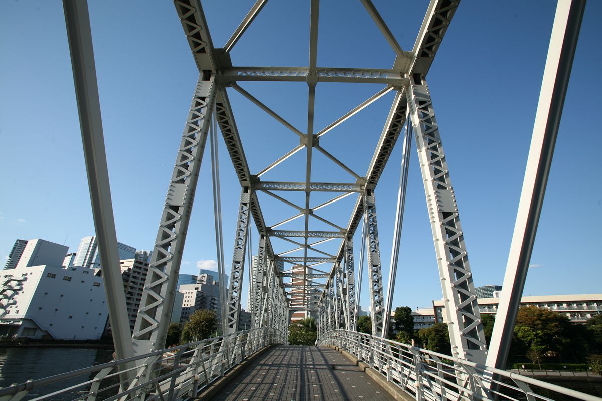 × [PR]上記の広告は3ヶ月以上新規記事投稿のないブログに表示されています。新しい記事を書く事で広告が消えます。 より大きな地図で 天王洲ふれあい橋 を表示 首都高羽田線を走っていると、天王洲付近で内陸側にピン結合のプラットトラスが見えて驚いたことはないだろうか。それが、天王洲ふれあい橋。先に紹介した芝浦橋から旧海岸通りを南下し、天王洲運河を渡るときに東側(左側)に見える。 この橋は、近年建造されたピン結合のプラットトラスであるという点で、おそらくそんなものはこれひとつしかない。名称が、なんの謂われもない、かえって無個性なふれあい橋であることだけが非常に残念だ。 休日の午後だったからか、人が途切れることがない。渡った向こうは東京海洋大学(昔の商船大学)、周辺は品川駅近くで住宅街でもある。また、運河に沿って遊歩道があり、開放感あふれたスペースになっている。この写真でいえば左側にオサレなカフェがあり、とてもいいにおいのパンを売っていて、中あるいはテラスでお茶ができる。スノッブな休日の午後を楽しむには非常にいい感じだった。 さて、ピン結合部を見る。 なんということだ、うっかりと裏側を撮らなかったのだが、こうして見る限り、ピン結合プラットトラスのセオリー通り、左右の垂直材が上下で結合されて軸方向が□型となり、それをアイバーがつないている構造になっているようだ。床版は、下横構の上に縦桁を渡し、その上に設置されていると思うが、それは確認していない。迂闊! 北側に渡って、東側を撮る。 また戻って垂直材。 以下は私の勝手な想像である。 このふれあい橋は、もともとは天王洲アイルから品川駅に行くための近道として設置された人道橋である(天王洲開発協議会による)。通常、こうした人道橋は、開放的な橋にする。橋長69.3m。プレートガーダーでできないスパンではない。あるいは斜張橋が採用されやすいスパンかもしれない。 なにしろ人が歩く道だ。トラス橋は、中を歩く人にとっては檻のように感じることもあるだろう。天蓋も部材で覆われているので、人道橋としてはもっとも敬遠される。それなのにトラス橋が採用されたのは、レトロ感を演出するために違いない。そういう意味で、現代の技術で作る「形鋼をガセットプレートで剛結したトラス橋」ではまったく意味がなく、「レーシングのある、リベットを多用したトラス橋」でなければならないのだ。それを徹底的に作り込むと、ピン結合のプラットトラスとなる(プラットトラスは、ピン結合に向いた形式である)。 たしかに「運河」という空間には、近代的な斜張橋よりも、こうしたレトロなイメージを持つ鋼橋のほうが似合う気がする。また、新築されたビルが林立する天王洲アイルという土地柄にこのようなレトロなイメージを持つ鋼橋があると、浮ついた印象がかなり減る。歴史があった場所を再開発した、というような印象になる。横浜の赤レンガ倉庫や汽車道と同じ手法だ。 実際に歩いてみると、鋼材の圧迫感などはまったく気にならない。横浜の汽車道も、三つの古い鋼橋が残されてアクセントとなっており、そこで写真を撮る人も多い。 このリベット風のボルトについてはこちらのブログに詳細がある。その前のエントリにはトラスの解析もある。この「トルシア形高力ボルト」については、こんな蘊蓄もあった。いままで、橋のボルトに注意したことはなかったが(リベットかボルトのどちらかだと思っていた)、この形式のボルトかどうかも今後、見て行きたいと思う。 最後に、施工した宮地鉄工所のサイトをご覧いただきたい。意外にも、このふれあい橋はポンツーン工法で架けられた。このサイトを見て私が不思議に思ったのは、ポンツーンの艀における橋桁の受け方だ。橋桁というのは両端下部の支承で支えるようにできているのだが、こうしたピントラスが艀に乗る場合は下弦か、下弦を左右に結ぶ下横構が支点となって桁全体を支える。そうしたときに、どこかしら破断が生じたりしないのだろうかということだ。そこらへんも踏まえた上で設計されているはずだが、光景としては不思議な感じがする。 PR