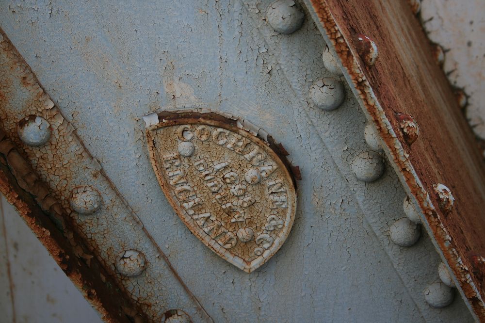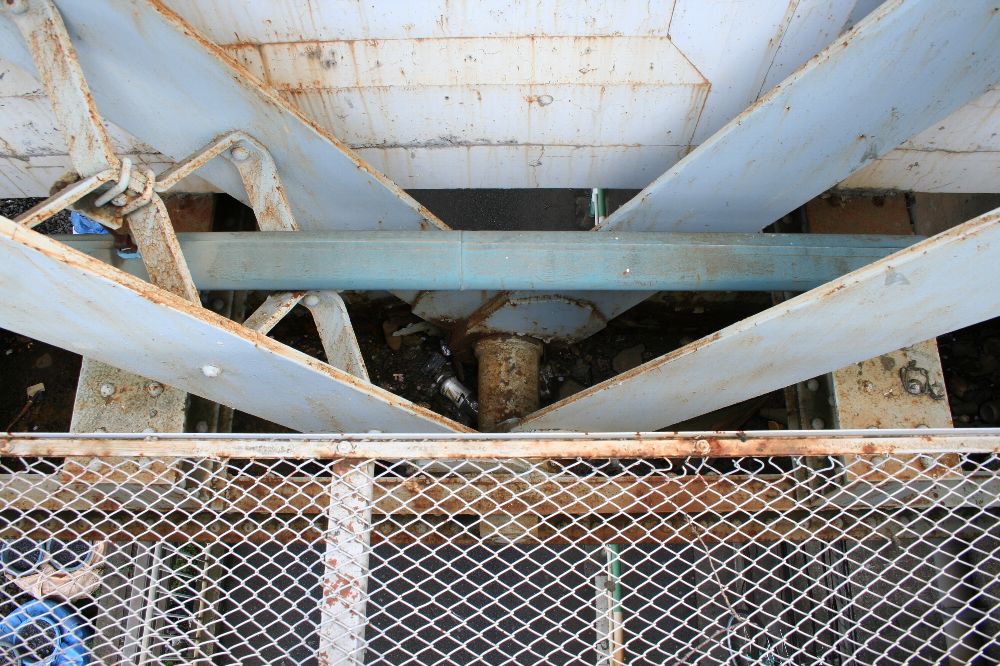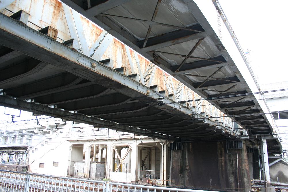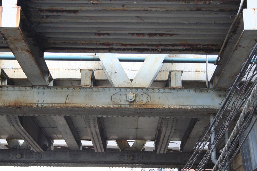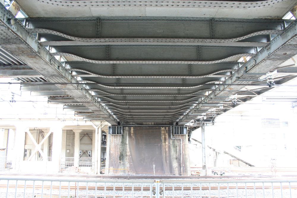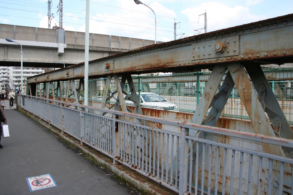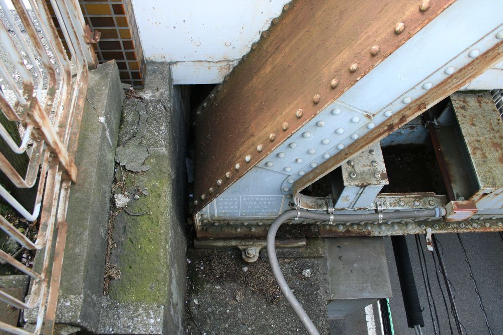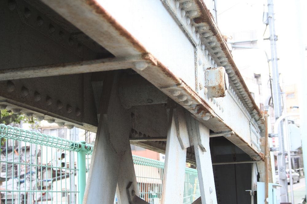 緩やかなRを持ち、中央部が幅広になっているこの横桁が並ぶと、三葉虫の背面部のようにも見える。この部分は車道で、左右の三葉虫の足みたいな部分が歩道のための別桁である。 で、この十条跨線橋の横桁の形は、今回の英国系ポニーワーレントラスの横桁に関心を持つきっかけとなった伊達橋(木曜に見に行くぜ)の横桁とは異なる。異なるのはRの形状と、縦リブの数、位置である。 <参考>(『日本の廃道』47号「伊達橋」by TUKA氏) 横桁の側面を見てみよう。I字形の断面に、長方形の鉄板をつけている。これは、全製造期間内で、相対的に後期のものである(支障の部分も参照)。 また、横桁の間にさらに1本横桁を通し、北側の歩道の支えにしている。南側の歩道はひとつの独立した桁だ。 橋梁名が「東十条地蔵坂Bo」とある。また、塗装は1984年6月、すなわちまだ国鉄の時代である。塗料は関西ペイント、施工は株式会社河野塗装店。たぶんこの会社。 ここで見えている横桁で、横桁の構造がわかる。I形鋼のウェブ(Iの縦棒部分)に、鉤状(「型)チャンネルを4本リベット留めし、ウエブに沿ってできたスペースには同じ厚さの鉄板を挟んでいる。 銘板。コクレーンのものが、北西側(交番前)と南東側にそれぞれついている。 この橋の素性を書く。1895年に製造されたトラス桁であって、実は何線のどこのものであるのかはわからない。わからないが、例の論文に記されているもののうち、1895年以降開通の路線を抜粋する。 ●1896年に開通した路線 ・日本鉄道(金町-松戸)1912年撤去 ・東海道本線(摂津富田-茨木) 1912年撤去 ●1898年 ・東海道本線(西大路-向日町)1912年撤去 ということは、このどちらかの転用の可能性があるといえる。 最後に全景。 なかなか横桁について「これはこうだ。いつからはこうだ」みたいに定義づけることができない。適当だったわけはないと思うのだが。