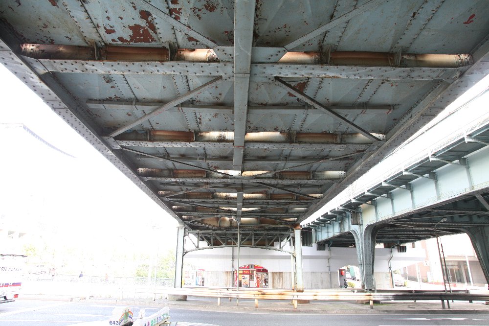 ニコラ・テスラとは、少しばかり因縁がある。 ひとつは、ウォーデンクリフ・タワー。 アラン・ホールズワースのアルバムタイトルにもなっており、 その存在を知ったのは、たぶんライブで来日した1993年のことだ。 もうひとつは、ジョン・ピアポント・モルガン。 ピアポントは、このウォーデンクリフ・タワーに出資していた。 元々はアメリカのディーゼル機関車について読みふけっていたら、 いつのまにかディーゼル機関車史、 それを使用したアメリカの鉄道会社とアメリカ鉄道史、と踏み込んでいき、 そうなるとアメリカ経済史まで知る必要があるため、 BNSF鉄道について調べていたら、 その前身のひとつ、バーリントン・ノーザン鉄道を、 さらにその前身のひとつ、ノーザン・パシフィック鉄道を把握せねばならず、 すると「ノーザン・パシフィック・コーナー」という株式買い占め事件に行き当たる。 ここで、ピアポントが大きく関わってくるため、モルガンの伝記等も読む羽目になった。 そんななかに、ウォーデンクリフ・タワーとニコラ・テスラの記述が出てくる。 ふと思う。 深町純は、ニコラ・テスラ的じゃないか、と。 氏が創造したといっていいジャンルは、それにのっかった人たちが席捲してしまい、 また、果たした役割があまりに大きすぎるがゆえに、世間に見てもらえない。 テスラ研究家の新戸雅章氏ならば、深町純をどう見るだろうか。 中央線の都心部は無骨な橋梁の宝庫。 水道橋周辺もまた素敵なエリア。 以前は毎朝、ここを自転車で通って通勤していた。 いや、ここを通らないときは、小石川通り架道橋の下を通っていた。 小石川通り架道橋については後日書く。 今回は新水道橋架道橋である。 その、各駅停車(通称:総武線)の線路が白山通りをまたぐ部分が、 ハーコート製の橋梁である。北側である。 この場所でこの橋梁を視界に入れた方は恐ろしい数がいるはずだ。 普通に普通の後継としてなじんでいる。 まさかこれが、1904年ドイツ製の鈑桁だとか、 甲武鉄道の発注によるものだとは誰も思うまい。 これは南側からみた写真。 写真右端に見えるのが中央快速線で、完全に桁が別。 上の写真それぞれに、銘板が2枚ずつ見えるだろうか。 北側、南側それぞれに、ハーコートと日支貿易の銘板がある。 (支を変換するときシナと打ったら変換しなかった。atokよ、歴史用語だろう!) 横断歩道が青のうちに撮ったから、焦って水平が。 といいわけしておく。 画面左端の白いのは、クルマかなあ。 視野率100%じゃないといやねえ(←トリミングしろってか) 鈑桁がゆがんで見えるのはレンズのせいではありませんが、 モアレのように見えるのは感度を640で撮影してしまったためです。 これを含めて周辺のハーコート製橋梁についてはいろいろ文献があるので 詳細はそちらに任せて、とりあえず写真のみupでした。