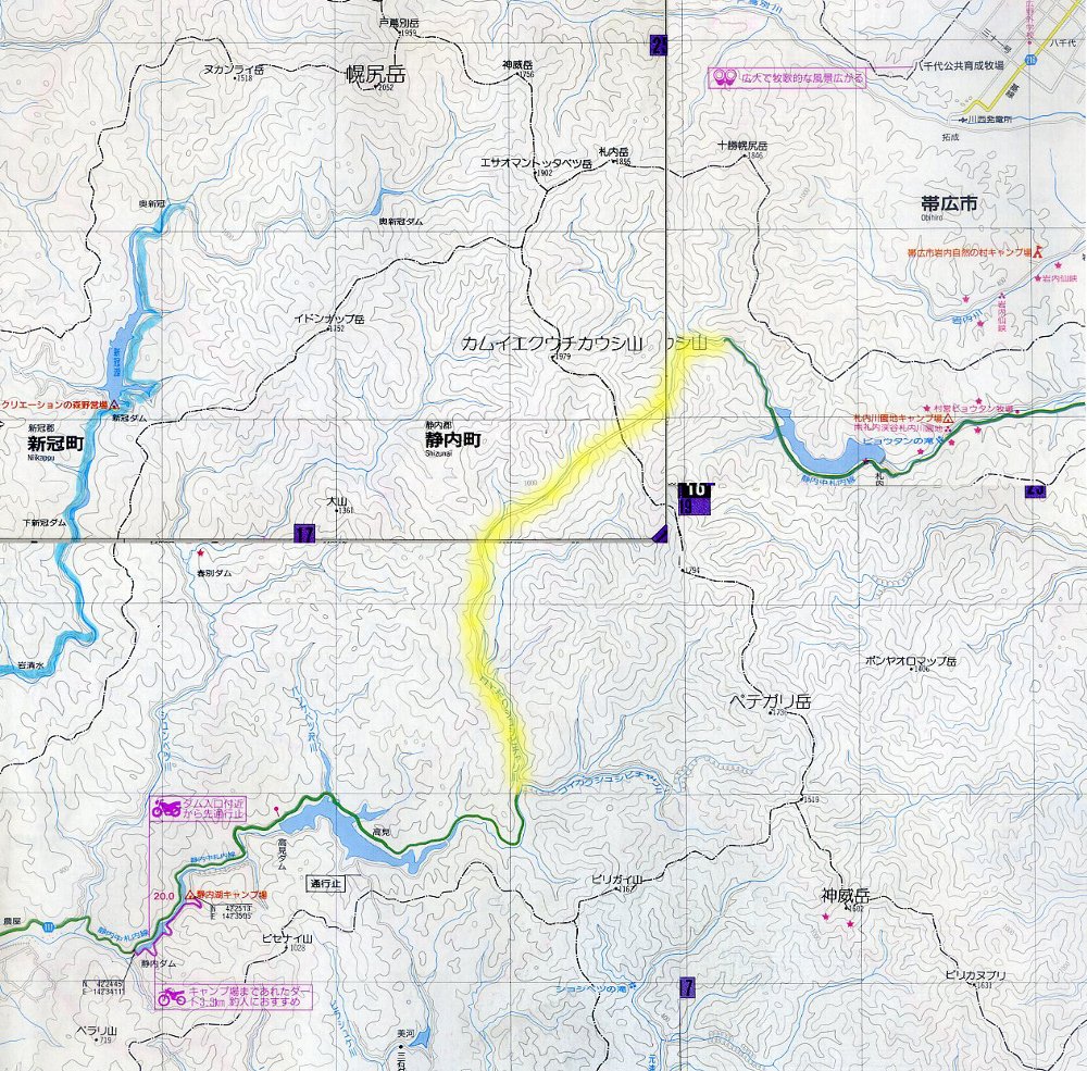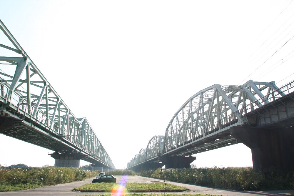 PR 上記衛星写真で、白い帯になっているのが、レサの廃車体である。 側手すりの位置から、一見、レム級を正確に2コイチにしたようにも見えるが、 レサはもともとそうなっている。 台車がないため、レサ5000か10000かは不明だが、 国鉄が車両を倉庫として売り出し始めたのが1980年代前半、 東北筋、とりわけ八戸で使われていたレサ5000の末期もそのころ、ということで レサ5000であろう。 現在は七戸農協の倉庫となっており、セコムのステッカーも輝かしい。 右手前から順番に1、2、・・・6と番号が振られ、 左手のものは手前から順に7、8とある。 合計8両である。 冷蔵車を転用したものであるが、種車は冷蔵設備を持っているわけではなく、 断熱材で仕切られた車内にドライアイスを置いて低温を保っていただけである。 そのため、ここで冷蔵倉庫として使われているとは考えづらい。 単なる倉庫なのであろう。 なかなかヒキがとれず、またイベント中ということもあり、 下段写真の虎ロープをくぐって敷地内に入ることもできず、 17mmでいっぱいいっぱいに撮ったのが精一杯であった。 (ツーリングマップル北海道 P17・18、24・25を加工・転載。Copyright 昭文社、2000) ツーリングマップル北海道の有名な謎として、この日高横断道路があった。 静内中札内線も、前述の夕張新得線と並んで未成道道として有名である。 それが、なぜこんなことになったのだろう? 2001年だったか、中札内側を行ったことがあるが、 札内川ダムあたりだったか、「この先通行止め」みたいな看板があって、 その先にゲートがあって、そこで引き返した記憶がある。 フィルムの時代、しかもポジを装填していたゆえ、記録はない。 それにしても、一体、どうしたというのだろうか、この地図は。 まるで高速道路のように、等高線を無視して、 カムイエクウチカウシ山とペテガリ岳の間を通っている。 しかも、鞍部ではなくひとつのピークを通過している。 他社による転載を警戒して入れるトラップではないことは確かだ。 国交省の航空写真が公開されはじめた当時、 この道が実在するのかどうか、あたってみたことがある。 札内川ダムすらない昭和53年度の撮影ということもあり、 こんな道などはその芽すらもなかった。 ああ。中札内側に行ったときに立ち寄った、忠類村のナウマン象の鳴き声が 脳裏によみがえってきた。。。 ツーリングマップルに「通行止」と同時に 「川渡りと荒れた道あり」と書いてあった、夕張新得線。 当時でも、オフ車乗りの間では「通れる」「通れない」という話題があったが、 「通った」「行ってみた」という人は皆無だった。 その道に、新得側からトライしてみた。 行って引き返したところで、ニニウ(鬼峠さんのサイトで有名です)から往復20km、 てことで行ってみたらこのありさま。 一応、工事中らしい。 それでも、道は続いている。 ネガプリントをスキャンしたので、コントラストが強すぎるのは勘弁。 この道は現在、地理院の地形図では点線道となっている。 当時でも、こんなバイクでこんなタイヤでもゲロ道へは行っていたが、 このときはなぜかそんな気はおきず、引き返した。 後日、夕張側からも行き止まり地点まで往復した。 この周辺にはいろいろ思い入れがあるが、またいずれ。 #この道、廃道カテとしたが、未成としたほうが適切だな。 ここにはこのようにトラス橋が3列並行している。 パッと見ただけでは、なにがなんだかわからないと思う。 画面奥、一段高くなっているのが、緩行線の複線ワーレン。 手前の直弦ワーレンは、快速線の下り線。 それらに挟まれるようにしてある曲弦プラットが、快速線の上り線である。 この上り線の橋梁の架け替え工事がまもなく始まる。 200フィート(62メートル)の曲弦プラット8連を目の当たりにできたら さぞ美しいかろうが、上述のように、遠く、たとえば北側の国道6号からはまったく認識できない。 橋梁の真下に行って、ようやく姿を拝めるのである。 真下に行くと、このようになる(逆光なのでちょっと・・・) この、私が立って撮影した地点に新たな橋が架かる。 すなわち、一時的に4本のトラス橋が平行することになる。 ここに行ったのは、この1917年東京石川島造船所(現IHI)製のプラットトラスを見るためだったが、 実際には1980年代に入って製造された緩行線の複線トラスの、桁高さが変わる部分に圧倒された。 (製造メーカー不詳) 詳細な寸法は不詳だが、左側(方角で言えば北東。取手側)は 緩行線と同じ間隔で橋脚があるので、200フィートクラス。 右側(南西、天王台側)は緩行線2連分を一またぎにしている。 ということは400フィートクラス(支間約124メートル)。 支間が長くなれば桁の高さも大きくなる。それを連続させているのが興味深い。 しかも、この場所だけではなく、のべ4種の高さがあるのである。 航空写真を見て判断する限り、取手方から ・62m程度 4スパン(最小高) ・124m程度 3スパン(最大高) ・100m程度 2スパン(中間高) ・62m