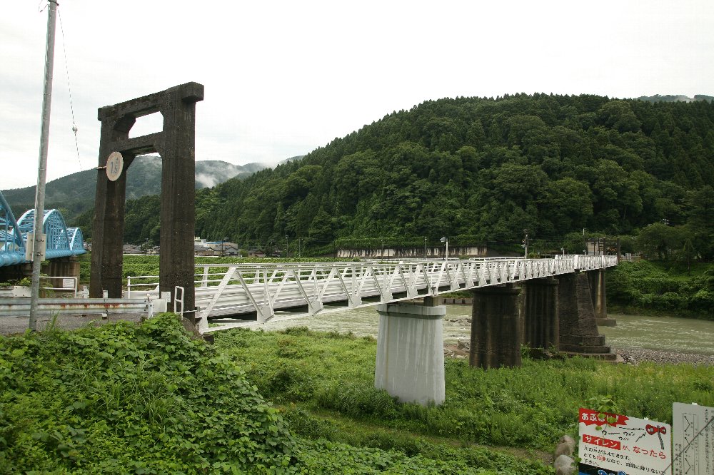 その奥に白いダブルワーレンが見えている。 それは1887年に開通した単線時代の東海道本線が使っていたもので、 1885~1886年パテント・シャフト製である。 1908年に複線化された際に道路橋に転用され、現在も使用されている。 このパテント・シャフトの橋については別の機会に書こうと思っているが、 1908年から使用された複線の橋梁が、アメリカン・ブリッジ製であった。 1906年製のパーカートラス(放物線状の曲弦トラス)だったというが、 とりあえず斜材と垂直材を明確に見分ける写真が発見できない。 クーパーとシュナイダーが日本向けに設計した橋梁はすべてプラットトラスであり、 かつ複線型下路200フィートトラスは5連しかない。 即ち本橋梁のことである。 ここでは、国交省の航空写真を掲げる。 http://w3land.mlit.go.jp/Air/photo400/75/ccb-75-27/c14/ccb-75-27_c14_25.jpg からのトリミングである。 画像下部に三つ平行して架かっている橋は、 上から初代、二代目、三代目である。 初代は前述のとおり現存。三代目は現役。 中央の二代目だけが撤去されている。 『鉄道ピクトリアル』1984年8月号「トラス橋の魅力」を眺めていたら、 その二代目の撤去中の写真が掲載されていた。 航空写真を見ていると、揖斐川中には橋脚が三つ。 うまく配置することで、二つにできるのではなかろうか。 こうして書き始めると、撮ってない写真があまりに多くて愕然とする。 被写体を深く知らなければ撮れない、ということを痛感する。 ここは再訪しなくてはならない。 石川県白山市の国道157号鶴来バイパス、 道の駅「しらやまさん」すぐ脇にある和佐谷橋。 渡っているのは手取川で、川が市境となっており、対岸は白山市。 今月いっぱいで廃止になる北陸鉄道加賀一の宮駅がある。 画面左端の水色のアーチ橋は水道橋で、左右の桁がズレているスキューアーチ橋である。 土砂降りになったり止んだりの天気だったので、めんどくさくて撮らなかったことを後悔している。 その向こう(さらに左)には、鶴来バイパスの山上郷大橋がある。 和佐田橋は、見たとおりかつては吊り橋だったもので、それを6連のポニートラス橋に置き換えている。 橋脚に注目すると、3種類ある。 手前の新しいもの、その向こう二つの少し古いもの、川の中央の大きなもの、である。 吊り橋の竣工は1932年(昭和7年)。 両端と、川の中央に塔柱があったという。 両端のものはいまでも残るが、川の中央のものは、 上の画像に見えている立派な水切りのついたものであろう。 1953年(昭和28年)、吊り橋を撤去し、新たに三つの橋脚を据えて6連のポニートラスを架けた。 東側2連は川を越えるためにスパンが長く、その分、トラスの橋高があがっている。 市街地はこの画像で言うと「向こう側」であり、手取川右岸に鶴来バイパスができるまでは 「向こう側」の道がメインストリートであった。 そして、「こちら側」に来るためにかけられたのが、この和佐谷橋であった。 「こちら側」には分教場もあった。 いまでこそ鶴来バイパスが通っているが、これの開通は1983年である。 国土交通省の航空写真(昭和50年度撮影)を見てみよう。 (ccb-75-22_c20_21.jpgをトリミング) 和佐谷橋が、立派に役目を果たしていることが見て取れる。 現役の車道である。 鶴来バイパスもなければ、和佐田橋の下流にかけられる山上郷大橋もない。 隣接するスキューアーチの水道橋もない。 また、当時、北陸鉄道は加賀一の宮駅から先(南)にも金名線という路線を延ばしていたのもよくわかる。 加賀一の宮駅側から見ると、こう。 現役時代の写真が、岐阜女子大学デジタルアーカイブ研究所のサイトにあった。(著作権は切れています) ここを振り向くと、北陸鉄道石川線の和佐田踏切。 チンチンチン・・・と鐘が鳴る、撞鐘式のものである。 この踏切が鳴るのもあと半月。 どのような結末を迎えるのだろうか。 現地地図を掲げておく。 <参考> 周辺の地図は、北陸先端科学技術大学院大学内の個人運営サイト 「web辰口町史」に詳細がある。 それを抜粋したという「和佐谷ものがたり」はぜひ読んでおきたい。 |