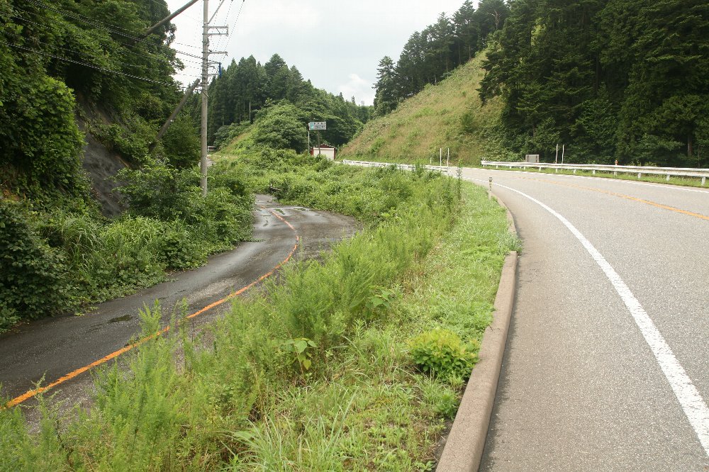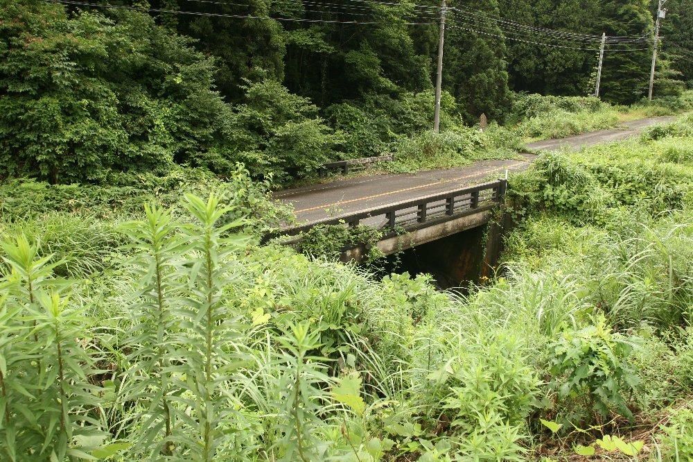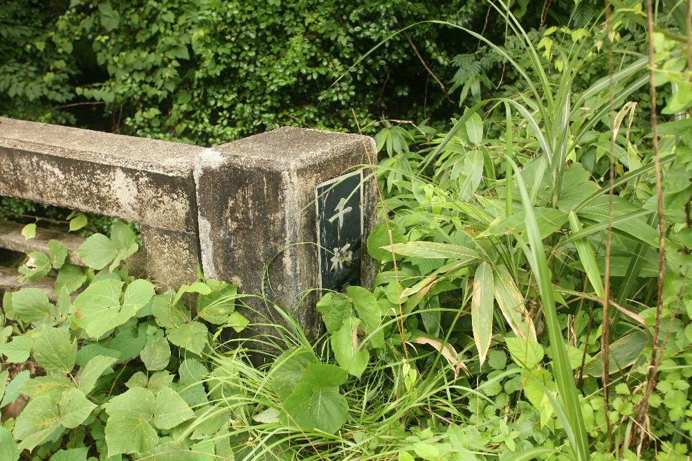 国道249号を走っていて、目に飛び込んできた旧道。 改良で国道の半径を大きくし、路側帯を造ったものだ。 しかし、電柱は旧道に設置されているため、旧道もそこそこの形はある。 旧道と新道の合流点(下記地図で言うと南西)には、簡単な柵がしてある。 奥の標識には 「別府岳」「ミニ森林公園」とある。 地図で見ると、ココだ。 右カーブする国道から東北(画面右上)に向かって直線の道路が延び、 途中で切れている。この部分だ。 上の写真は、国道(新道)から南西方向を向いた写真だ。 地図では北東に向かって途中で切れているが、きちんと新道と接続している。 また、不自然に20m分の等高線を一直線に登っているが、もちろんこれは地図の誤りで、 現地は新道より一段低い部分を通っている。 上の写真でも旧道に橋が見えているが、こんな案配である。 画面上、橋の右上に、石碑がある。拡大するとこうだ。 なにが描いてあるのか、浅学なため不詳。 イメージとしては、絵柄の尖り方が、日蓮宗の南無妙法蓮華経碑を連想させる。 そして、左側に水準点。 地形図を見ると、標高31.3メートルの水準点がある。それだ。 親柱によれば、「千柄橋」というらしい。 冒頭の写真の奥には、路面の速度規制がそのまま残っていた。 路肩の盛大な藪の具合もよくわかろう。 画面手前が舗装されているのは、新道建設時の余波か。