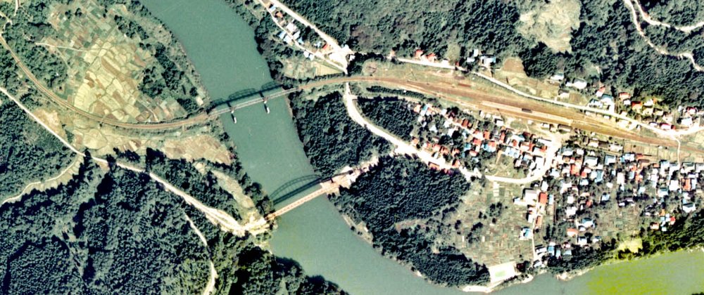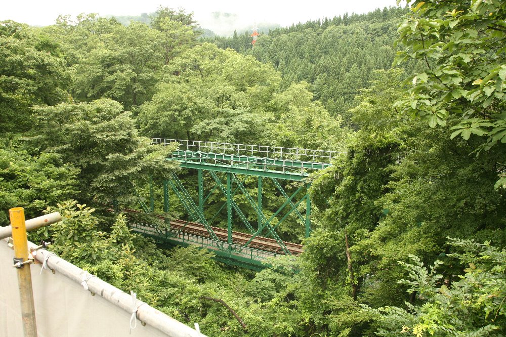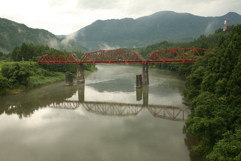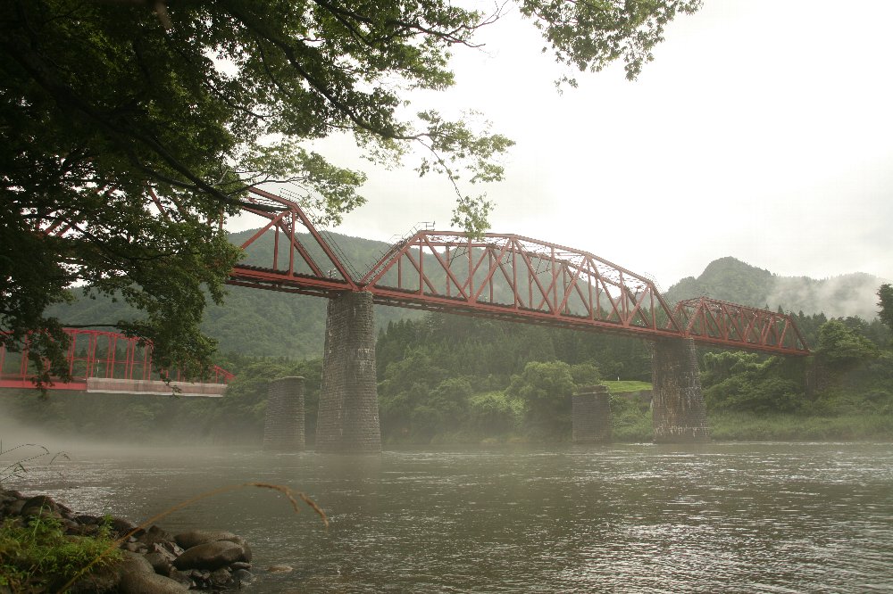 いまのこの橋は、横側橋梁製であり、アメリカン・ブリッジ製ではない。 下の写真手前に、古い橋脚が見える。 かつて、ここに上路式のアメリカン・ブリッジ製のトラスがかかっていた。 それも、わずか15年ほどの間である。 この下流に鹿瀬ダムが造られることになり、上路式では冠水の懼れが生じた。 そのため、下路式の橋梁を設置することになったものだ。 旧橋梁、3径間のそれぞれは、現在の秩父鉄道に転用されている。 7月3日の押手沢橋梁は、かつてここにあった桁である。 架け替えにともない、ルートの変更が生じた。 そこは、短いながらも廃線跡の趣がいまも残る。 昭和51年撮影の航空写真を見てみよう。 (国土地理院のサイトより引用、トリミング) 画面右手が日出谷駅。 そこから左(西)に向かう現在の磐越西線のすぐ下(南)に、 道型が残っている。 ここは川霧が発生しやすいのか、鉄道写真として発表されているものにも 川霧と絡めてあるものが多い。 私が行った翌日、この場所で撮影された写真が、雑誌に大きく載っていた。 |