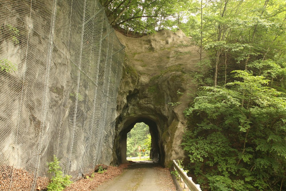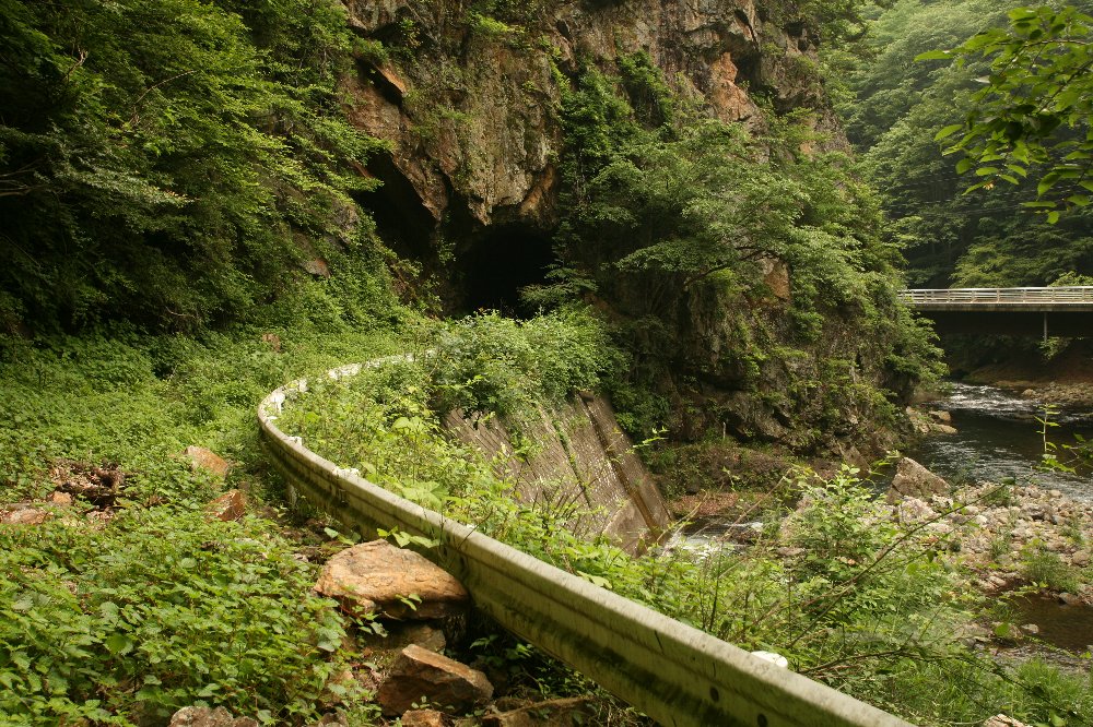 この先は行き止まりのはずだ。 しかし、かなり道が改良されている上、 御巣鷹山への案内がしきりに出ている。 とはいえ、慰霊碑のために道が整備されたわけではない。 ダム工事のためである。 最新の『ツーリングマップル』では、県道124号は 浜平より南側は新たなトンネルで一気に駆け抜け、 従来の道は消され、代わりにダムが描いてある。 とりあえず、行ってみると、浜平温泉の旧道に、それはあった。 位置は、下仁田森林軌道(1)の地図参照。 先のは北側からで、素掘りの坑門口があまりに巨大であった。 大型トラックすら通れそうであった。 それはすなわち、崩落が続いているということであろう。 これは南側から見ている。 写真の右に見えるのが現道である。 ここまで、車道からすぐ。 内部はこう。 もうひとつ、廃隧道があった。 こちらは、隧道手前左上の岩を見ただけで近寄りたくなくなった。 この先、ダム手前で通行止めとなっていた。 クルマから自転車を降ろし、行ってみるとまだあった。 一般車通行止めとはいえ、ダム関係車両は通行するだろうから 現役である。 現役ゆえに、安全対策も施されているし、なによりきれいである。 この隧道をくぐり、左に曲がってまっすぐ行ったところで終了。 旧版地形図では、もうひとつ隧道があるはずだが、 それとおぼしき位置はダムの堰堤であった。 ここはこれで引き上げた。 が。 帰宅後、地図を見直すと、新たなトンネルを使えば、 下仁田森林軌道の最奥部には行けたようだ。 行ったところで同様の隧道があるかどうか、というところだが、 行っておかなかったのは悔やまれる。 またの機会に。 |