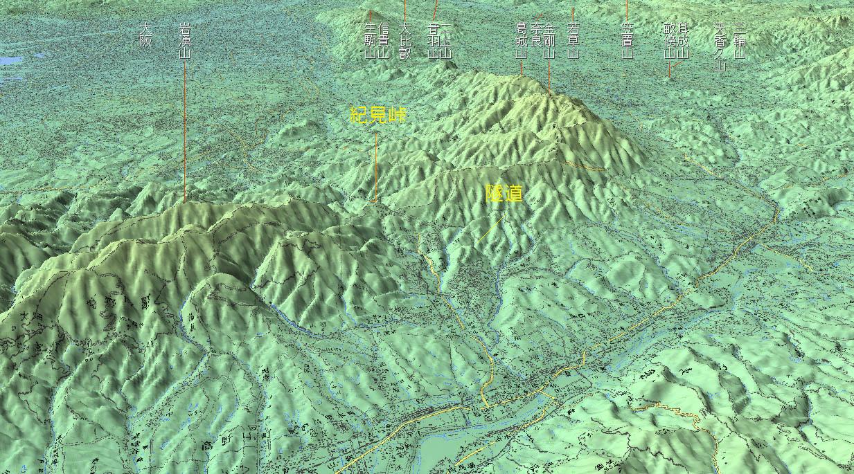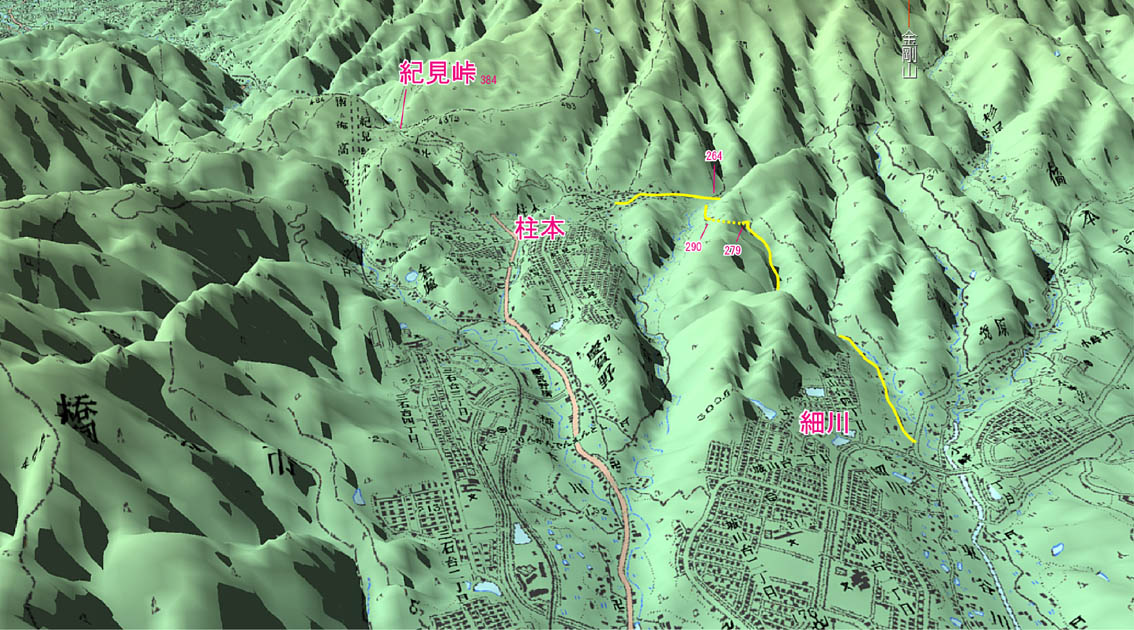 それを鳥瞰図で見ると、こうなる。 紀ノ川沿いの平野部から大阪方面に出る際には、 和泉山脈と金剛山地の鞍部たる紀見峠が そのルートとして選ばれたのがよくわかる。 柱本の手掘り隧道付近を拡大すると、こうである。 林間田園都市の住宅街は山を切り開いたものであって、 かつてはそんなところに道などなかったのだろうが、 橋本から向かうのであれば、 芋谷川の谷沿いにあがってもいいじゃないか・・・ #これらの地図画像と鳥瞰図は、DAN杉本氏作製のカシミール3Dを使用した。 |