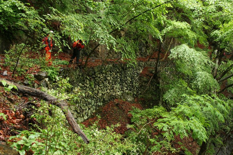 なんの変哲もない道と言えばそうだったからかもしれない。 以前、オフロードバイク雑誌に関わっていたとき、 林道の写真はどこで撮っても変わらんよ、というのが常識だったが、 それに近いかもしれない。 とにかく石垣がきれいだった。 堅固だった。 石垣のあるところでは路肩が崩れているところはほとんどなかった。 一部、石垣ごと谷側に押し流されているところがあり、 そこは道の上にも土砂が堆積していた。 馬頭観音。 想定していたよりも小さかった。 『山さ行がねが』でのプチレポでは、とんでもないところを歩いているように見える。 実際は、トラバースする部分でも足下はしっかりしていた。 斜面を写真で表現するのは難しいが、 安全を表現するのも難しい。